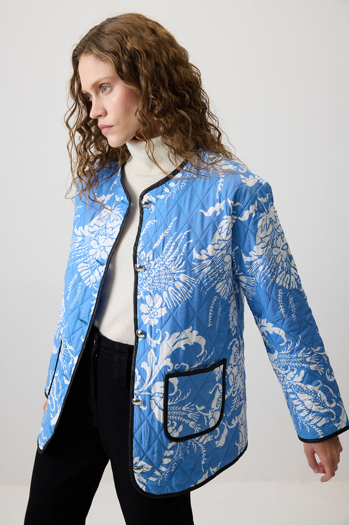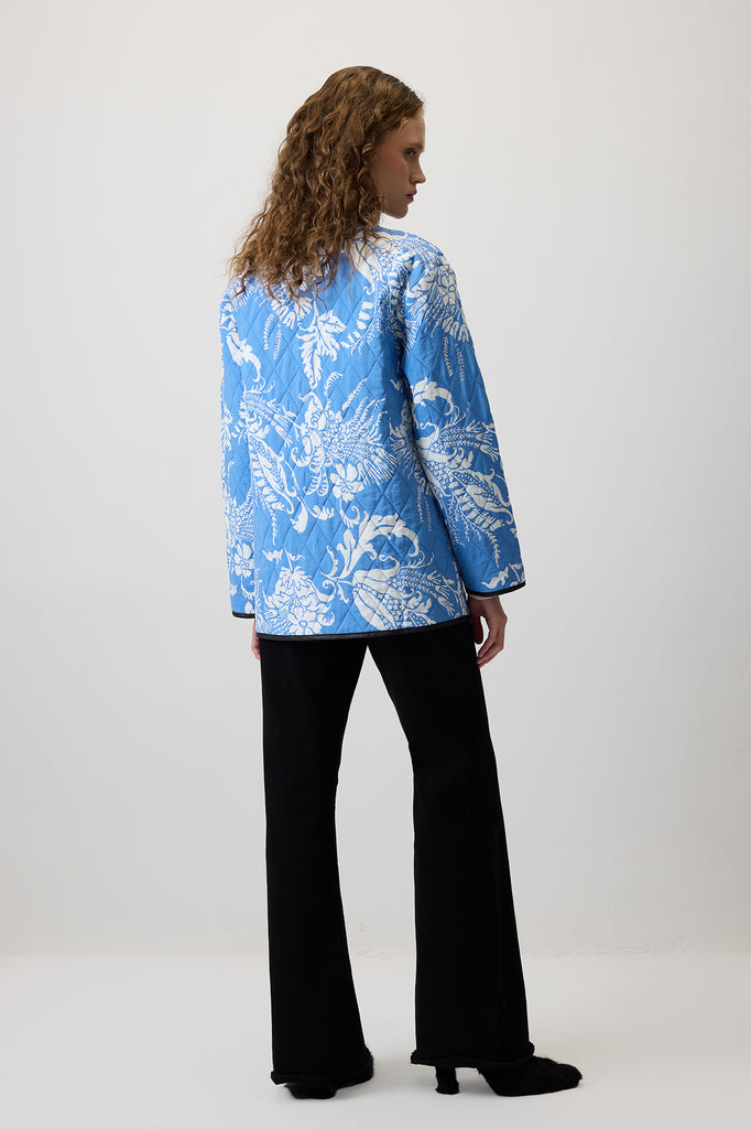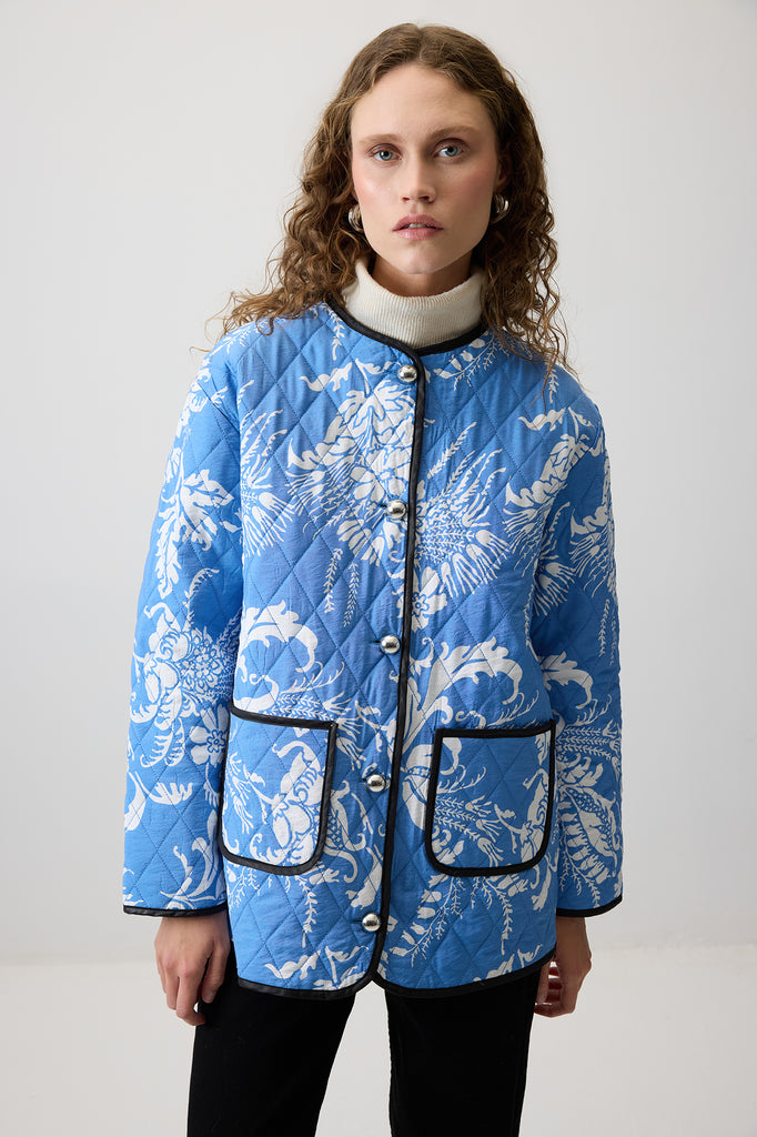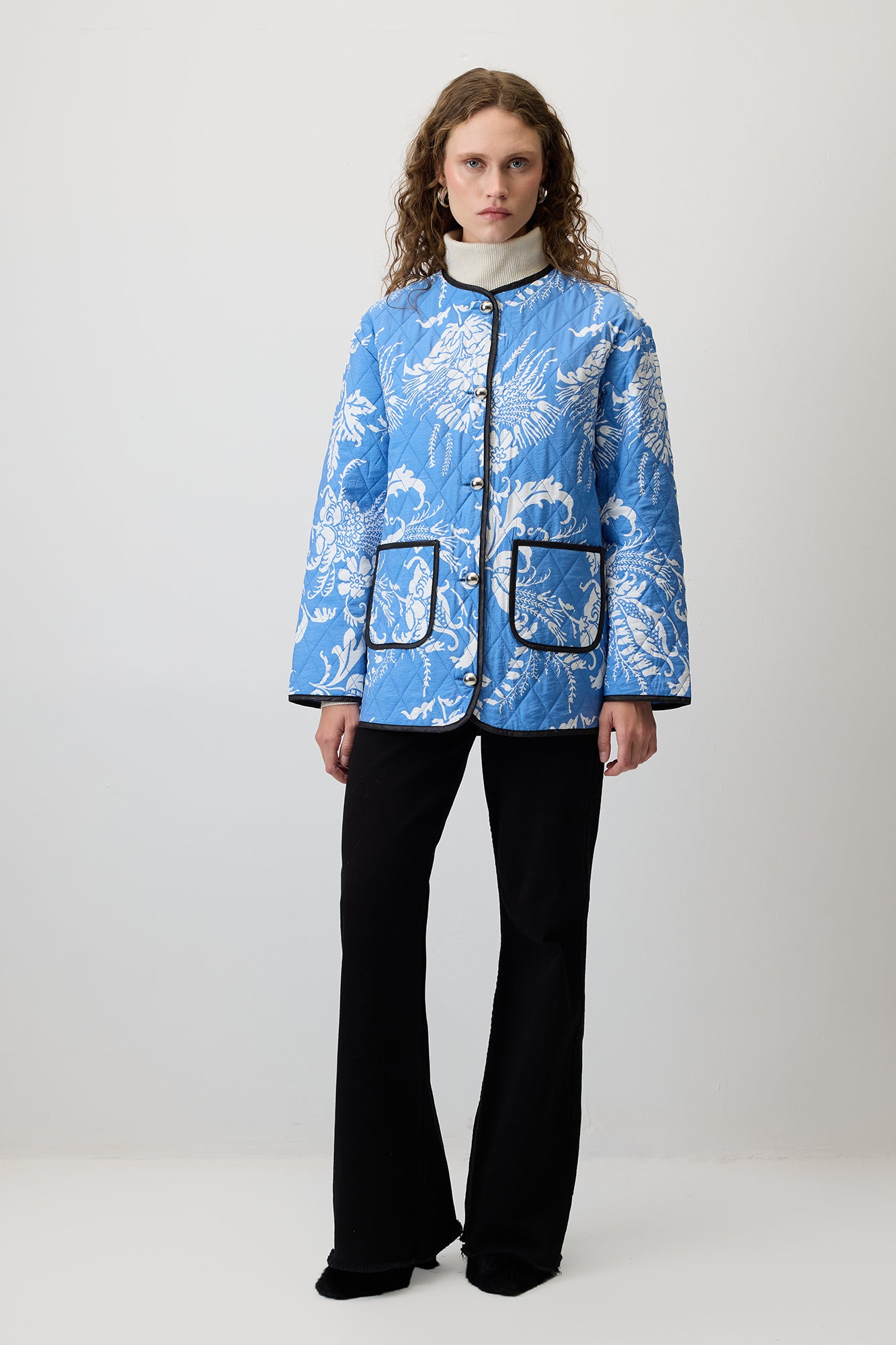 Bisiklet yaka. Uzun kollu. Desenli. Yama cepli. Önden düğme kapamalı.