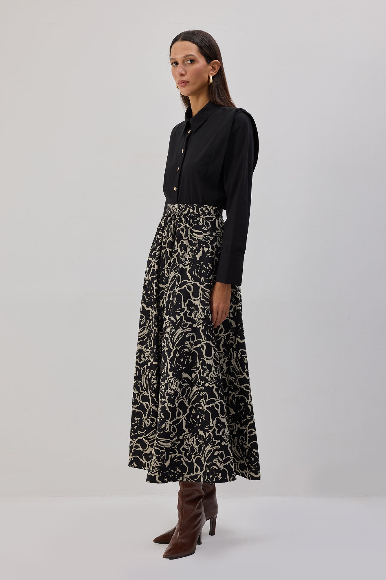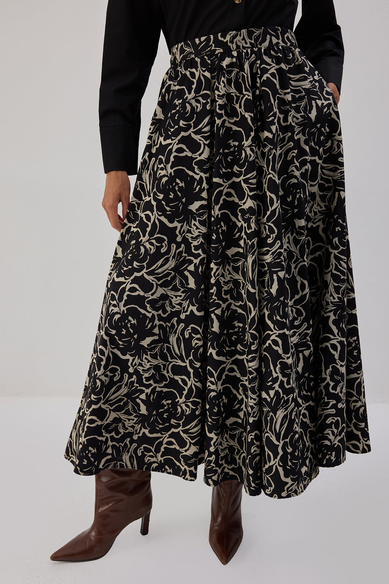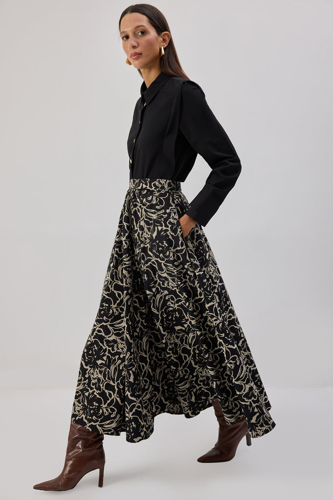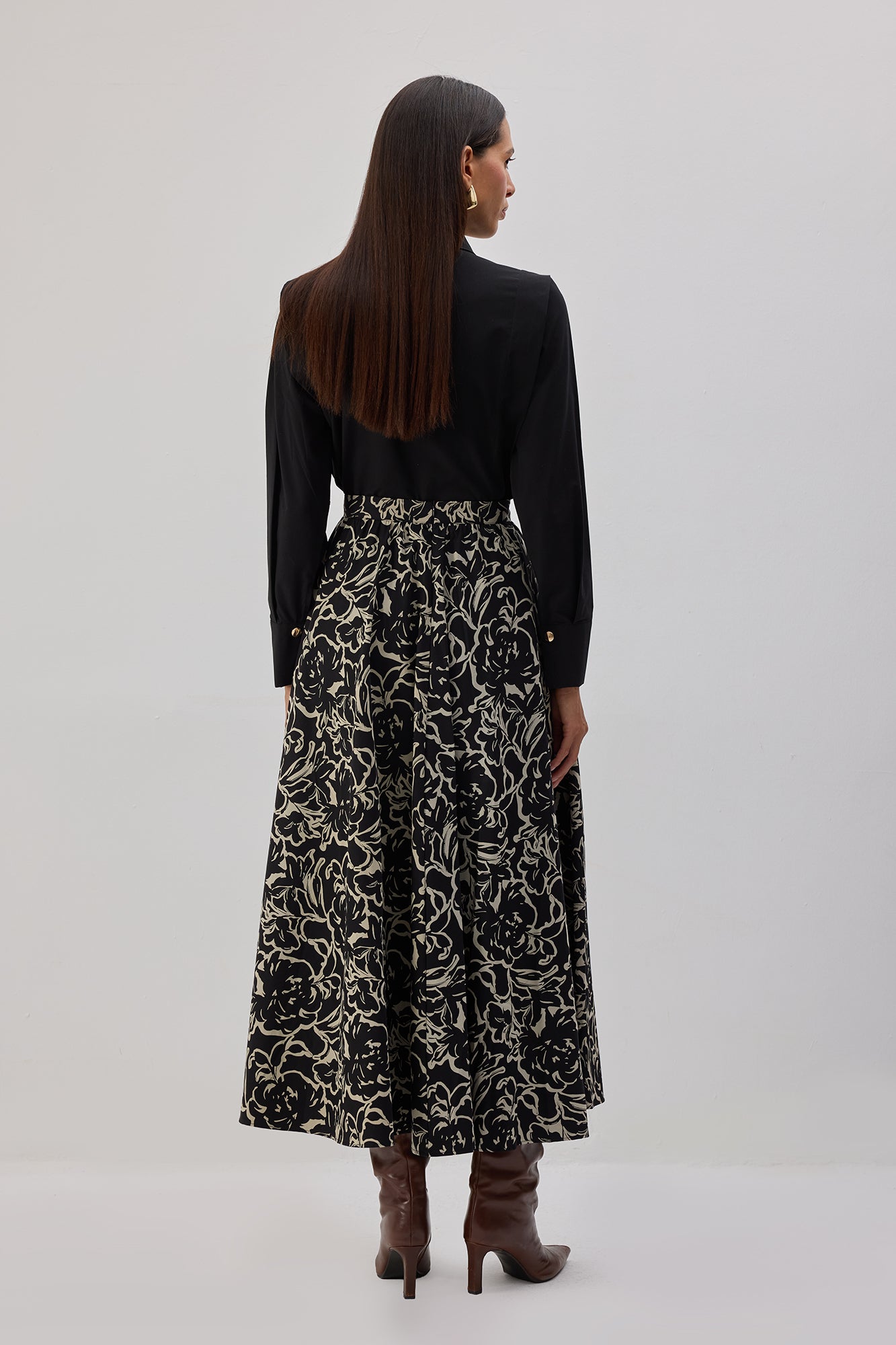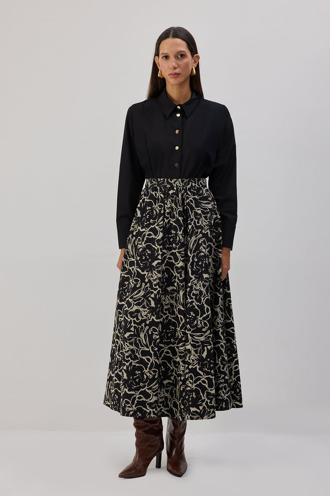 Yüksek bel. Kloş kesim. Desenli kumaş. Midi etek. Gizli fermuar kapamalı.
