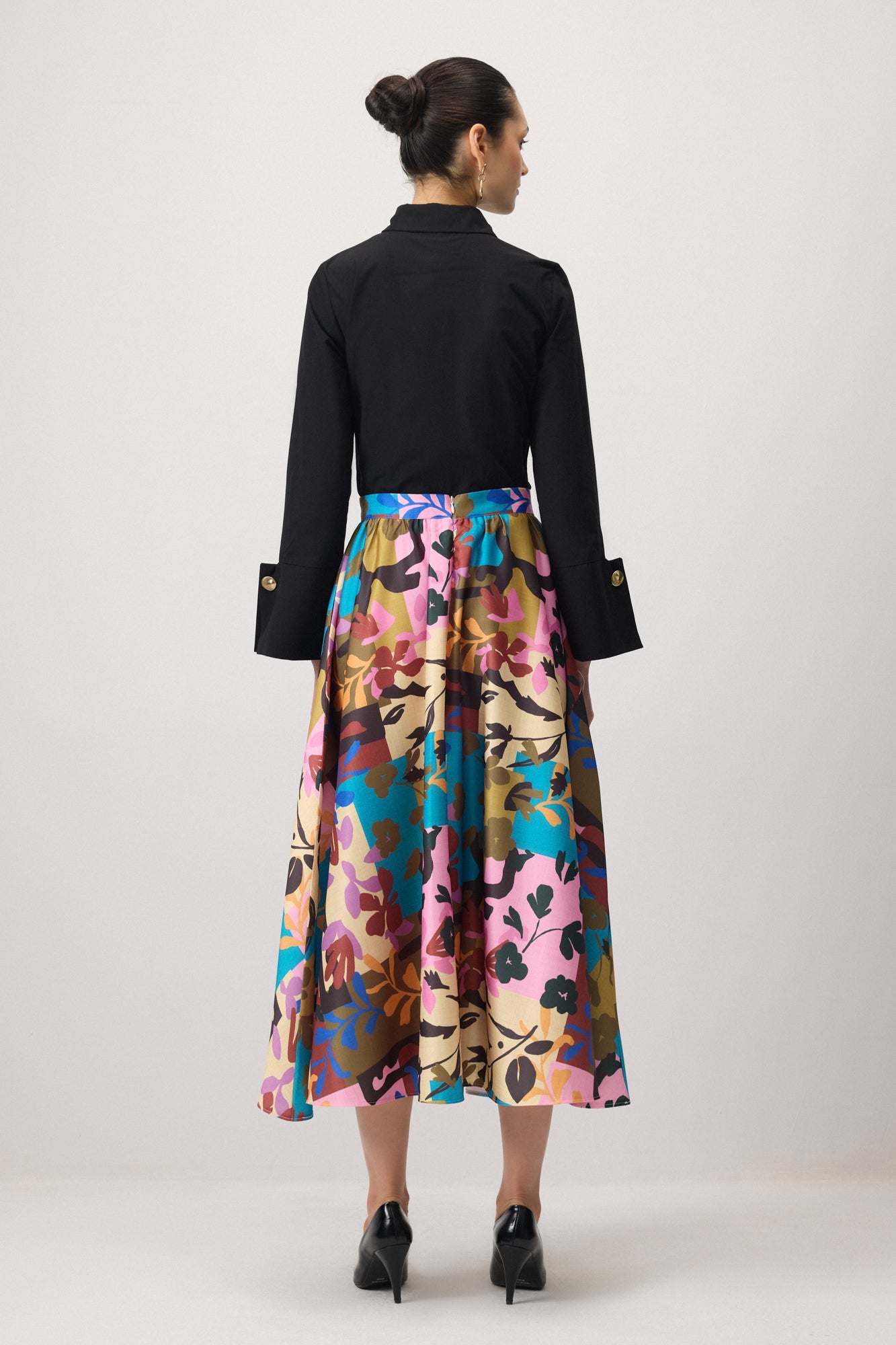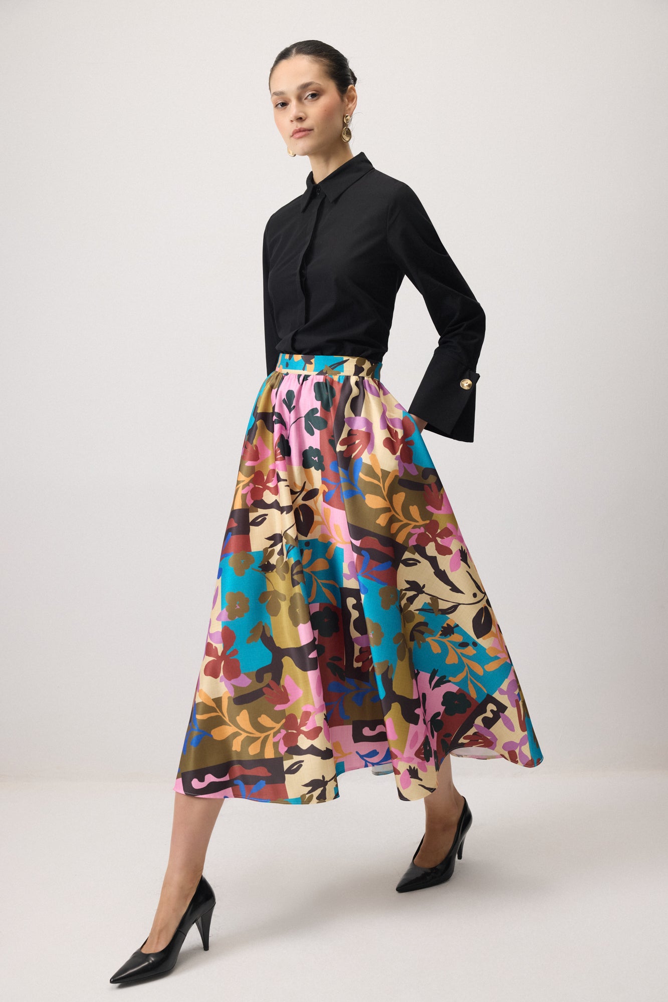 Renkli çiçek desenli, geniş kesim, midi boy etek.