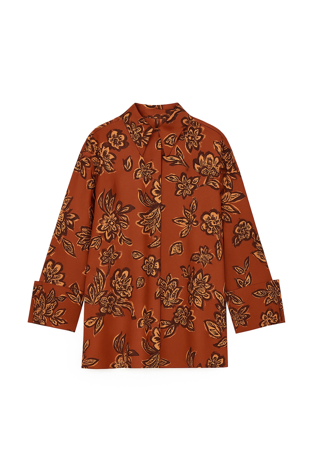 Saten gömlek. Desenli kumaş. Önden gizli düğme kapamalı. Geniş manşetli.