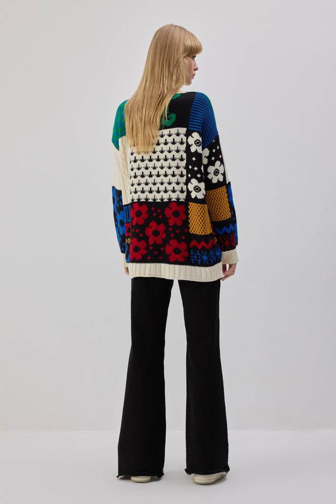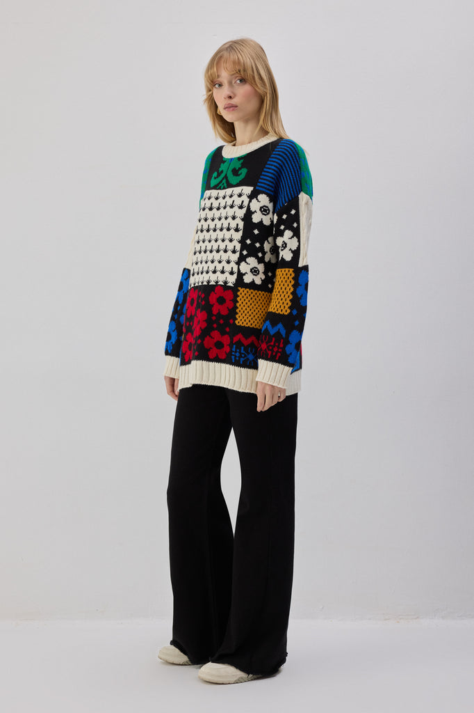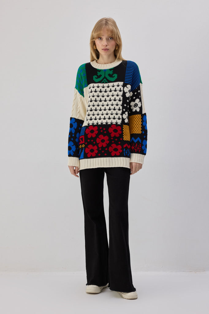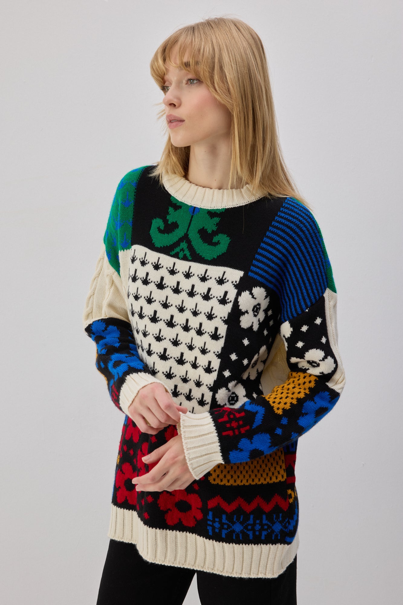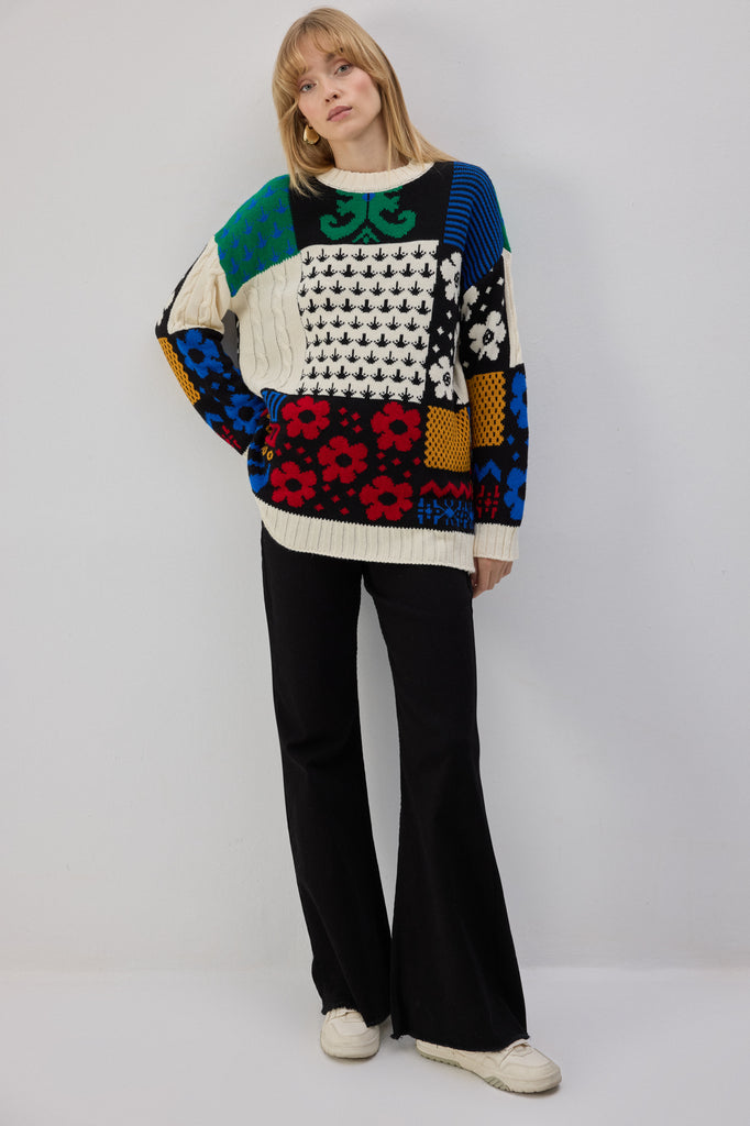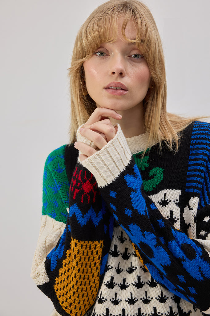 Canlı renkleri ve farklı desenlerin kombinasyonu ile dikkat çeken bu desenli triko kazak, stiline dinamizm katmak isteyenler için mükemmel bir seçenek! Etnik ve modern desenlerin harmanlandığı tasarım, rahat kesimiyle konforlu bir kullanım sunarken, aynı zamanda cesur bir moda ifadesi oluşturuyor.
