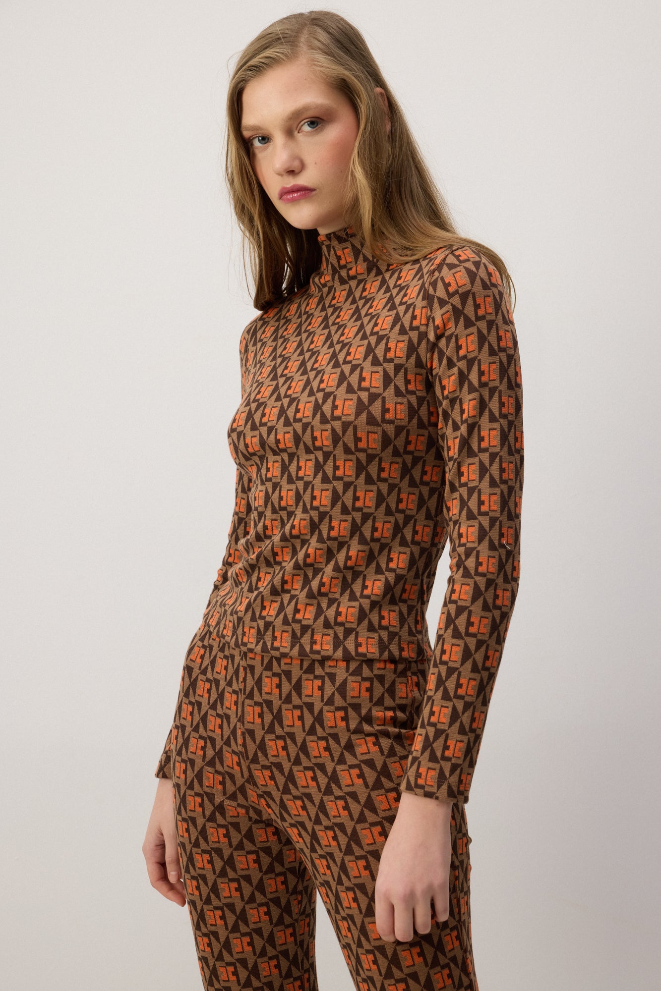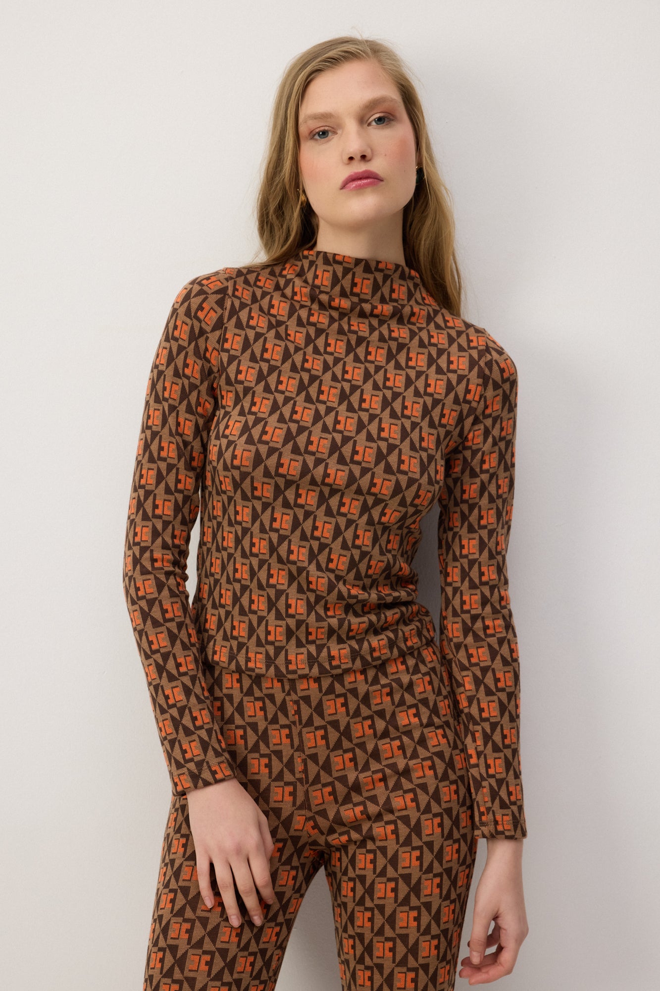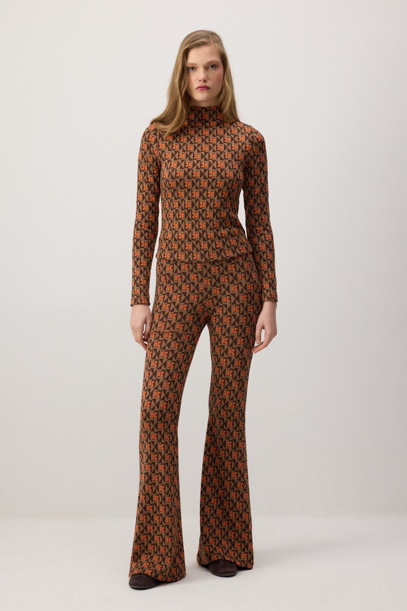 Desenli örme bluz. Yarım balıkçı yaka. Uzun kollu. Desenli flare pantolon. Yüksek bel. Esnek kumaş.