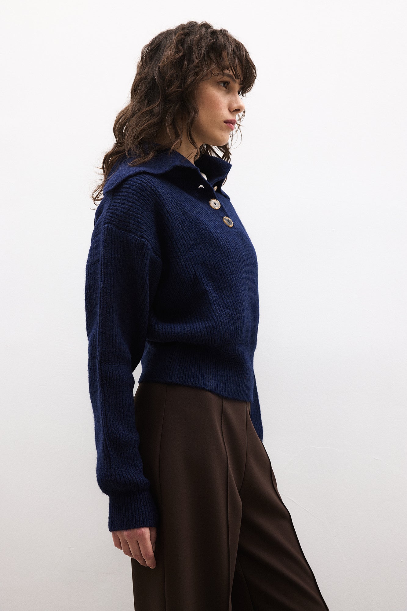 Ön kısımda düğme detaylı pat. Uzun kollu. Düşük omuzlu. Triko kazak.