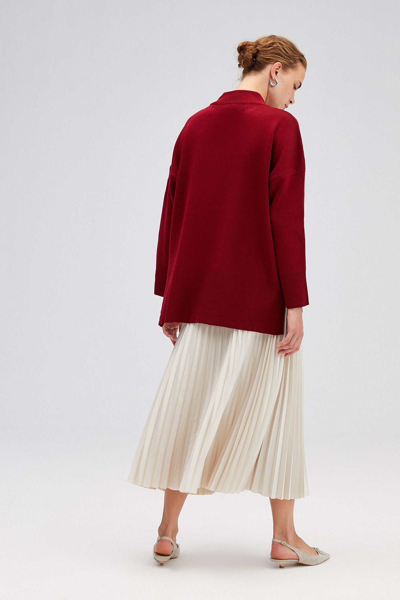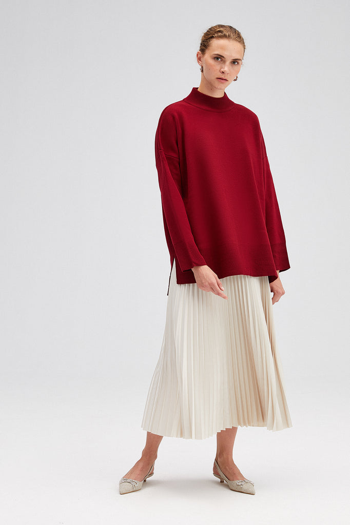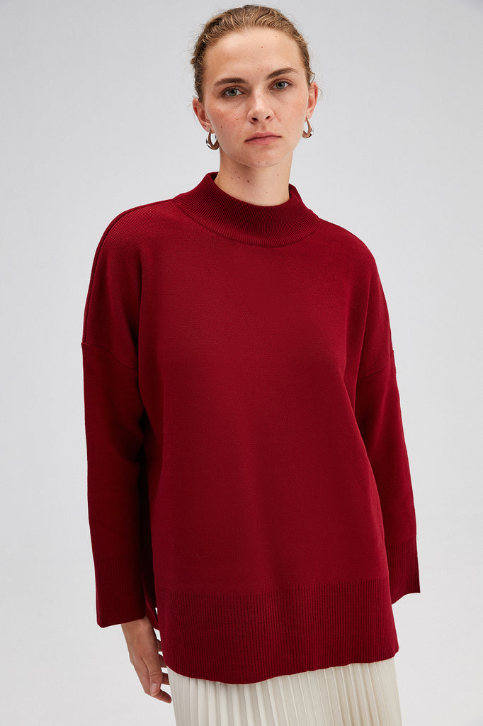 Sade ve şık tasarımıyla her kombine kolayca uyum sağlayan bu dik yaka triko kazak, soğuk günlerde hem konfor hem de stil sunar. Yumuşak dokusu ve rahat kesimi sayesinde gün boyu sıcak tutarken, modern ve zamansız duruşuyla öne çıkar. Yan yırtmaç detayları hareket özgürlüğü sağlarken, minimal tarzıyla farklı parçalarla kolayca kombinlenebilir. Günlük kullanımda jean pantolonlarla casual bir görünüm oluşturabilir ya da eteklerle daha feminen bir hava yakalayabilirsiniz. Gardırobunuzun vazgeçilmez parçalarından biri olacak bu triko kazak, her sezon stilinizi tamamlayacak!