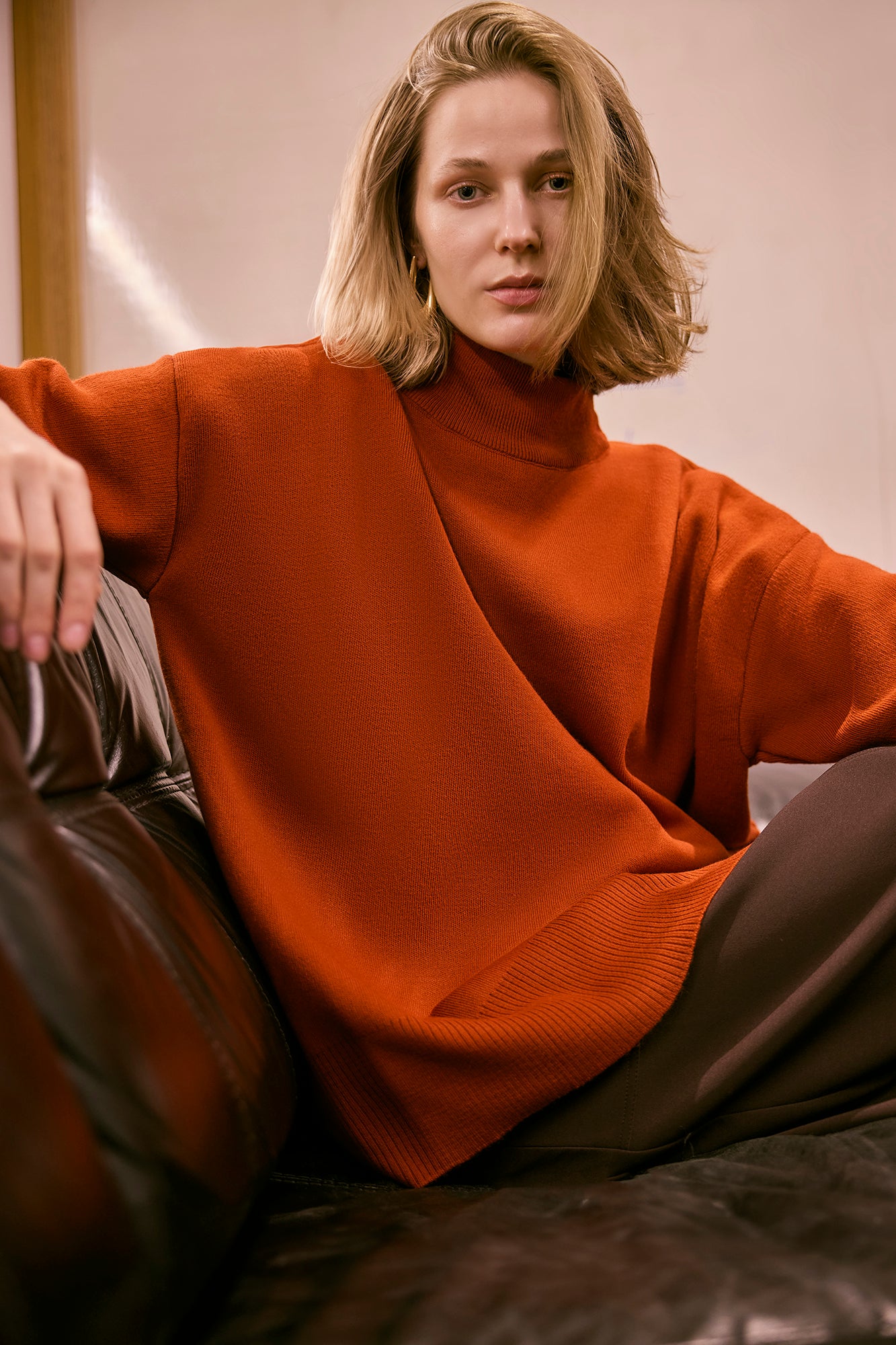 Dik yaka. Düşük omuz. Uzun kol. Elastik manşet. Yandan yırtmaçlı. Yumuşak dokulu.