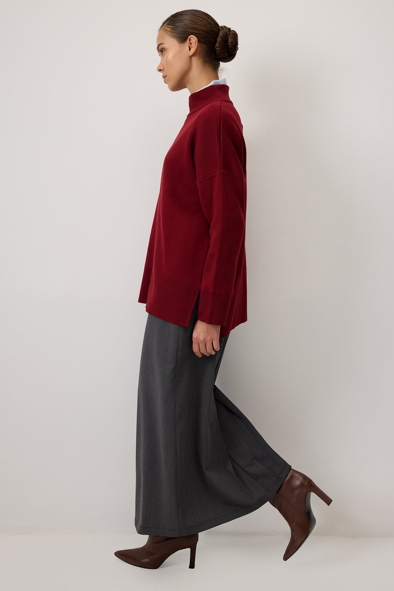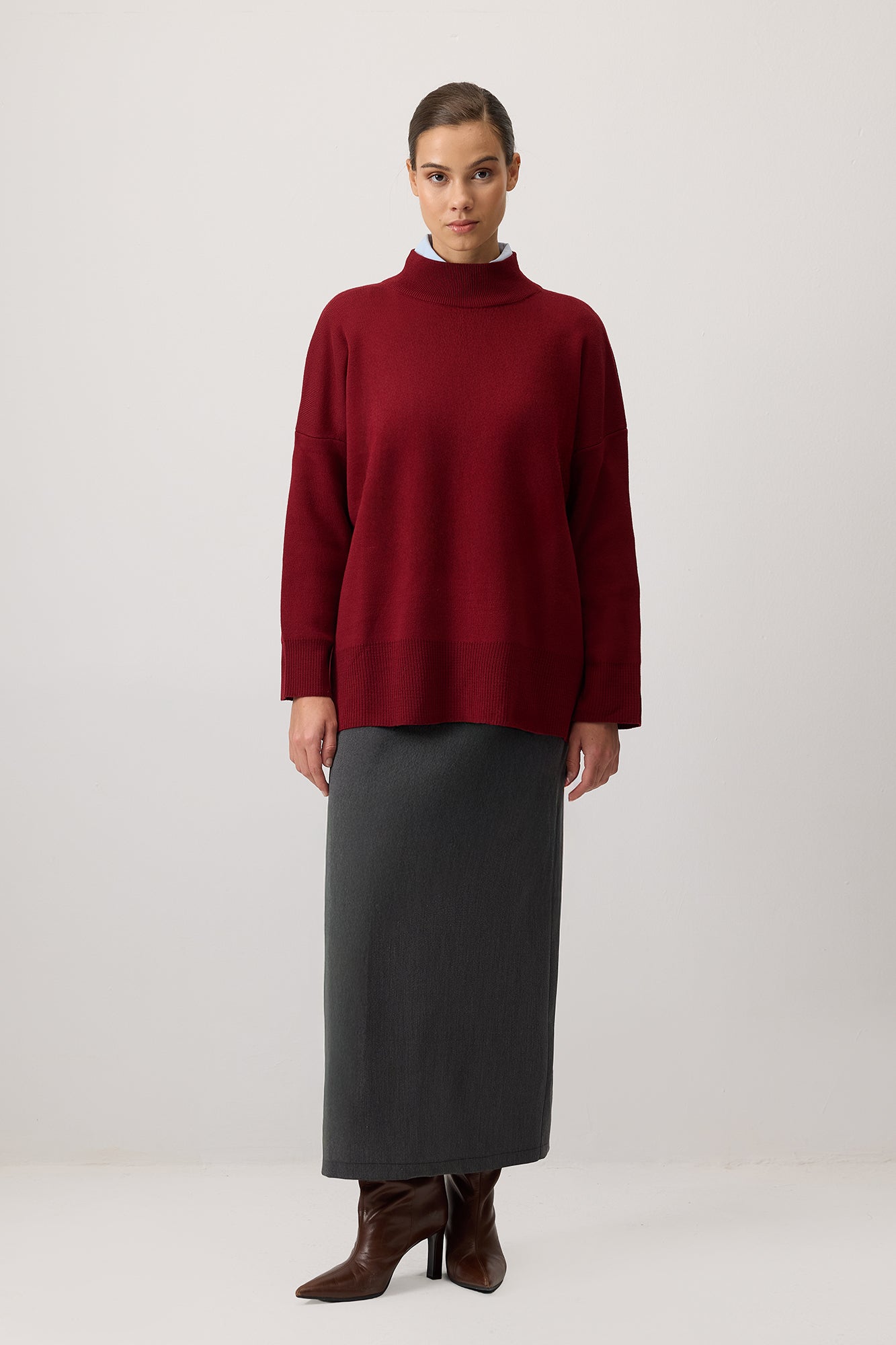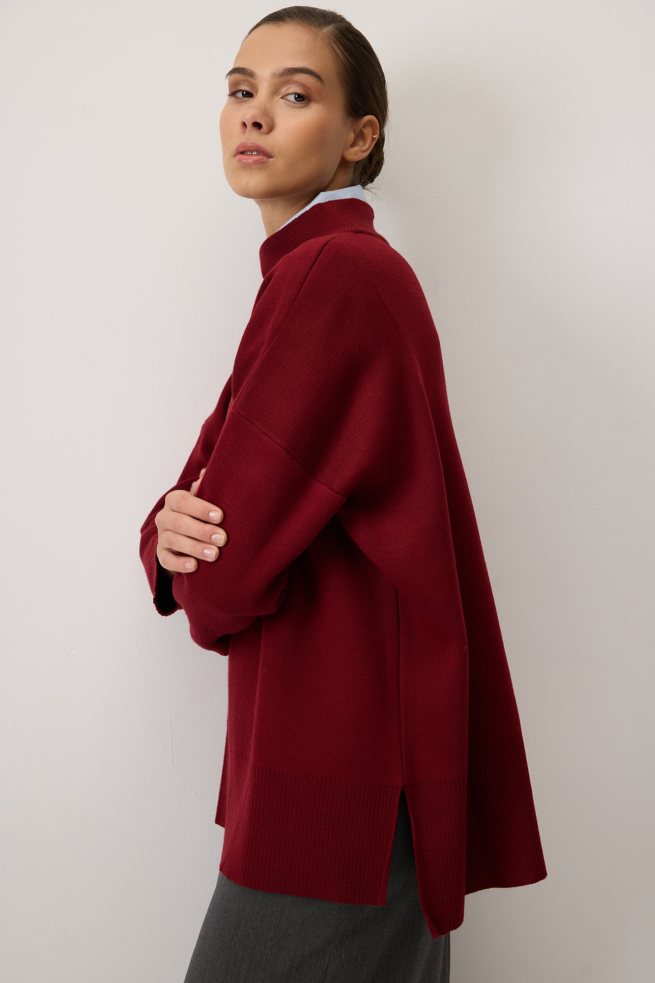 Sade ve şık tasarımıyla her kombine kolayca uyum sağlayan bu dik yaka triko kazak, soğuk günlerde hem konfor hem de stil sunar. Yumuşak dokusu ve rahat kesimi sayesinde gün boyu sıcak tutarken, modern ve zamansız duruşuyla öne çıkar. Yan yırtmaç detayları hareket özgürlüğü sağlarken, minimal tarzıyla farklı parçalarla kolayca kombinlenebilir. Günlük kullanımda jean pantolonlarla casual bir görünüm oluşturabilir ya da eteklerle daha feminen bir hava yakalayabilirsiniz. Gardırobunuzun vazgeçilmez parçalarından biri olacak bu triko kazak, her sezon stilinizi tamamlayacak!
