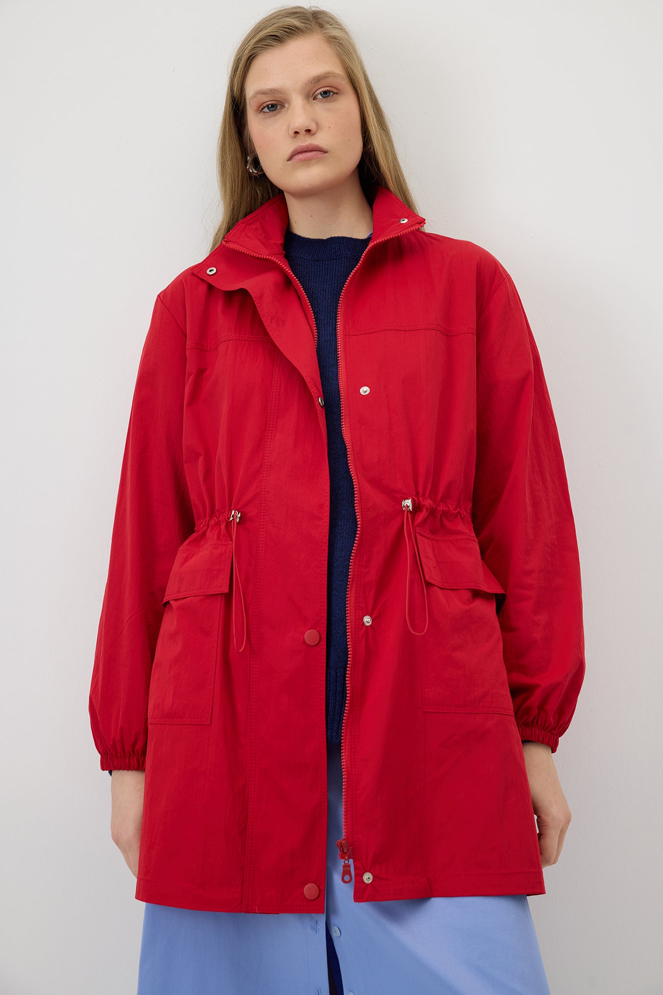Belden büzgülü tasarımıyla zarif bir siluet oluşturan bu ceket, hafif yapısıyla mevsim geçişlerinde ideal bir konfor sunar. Fermuar ve çıtçıt detaylarıyla pratik bir kullanım sağlarken, geniş cepleriyle fonksiyonel bir duruş kazandırır. Günlük kombinlerin vazgeçilmez tamamlayıcısıdır.