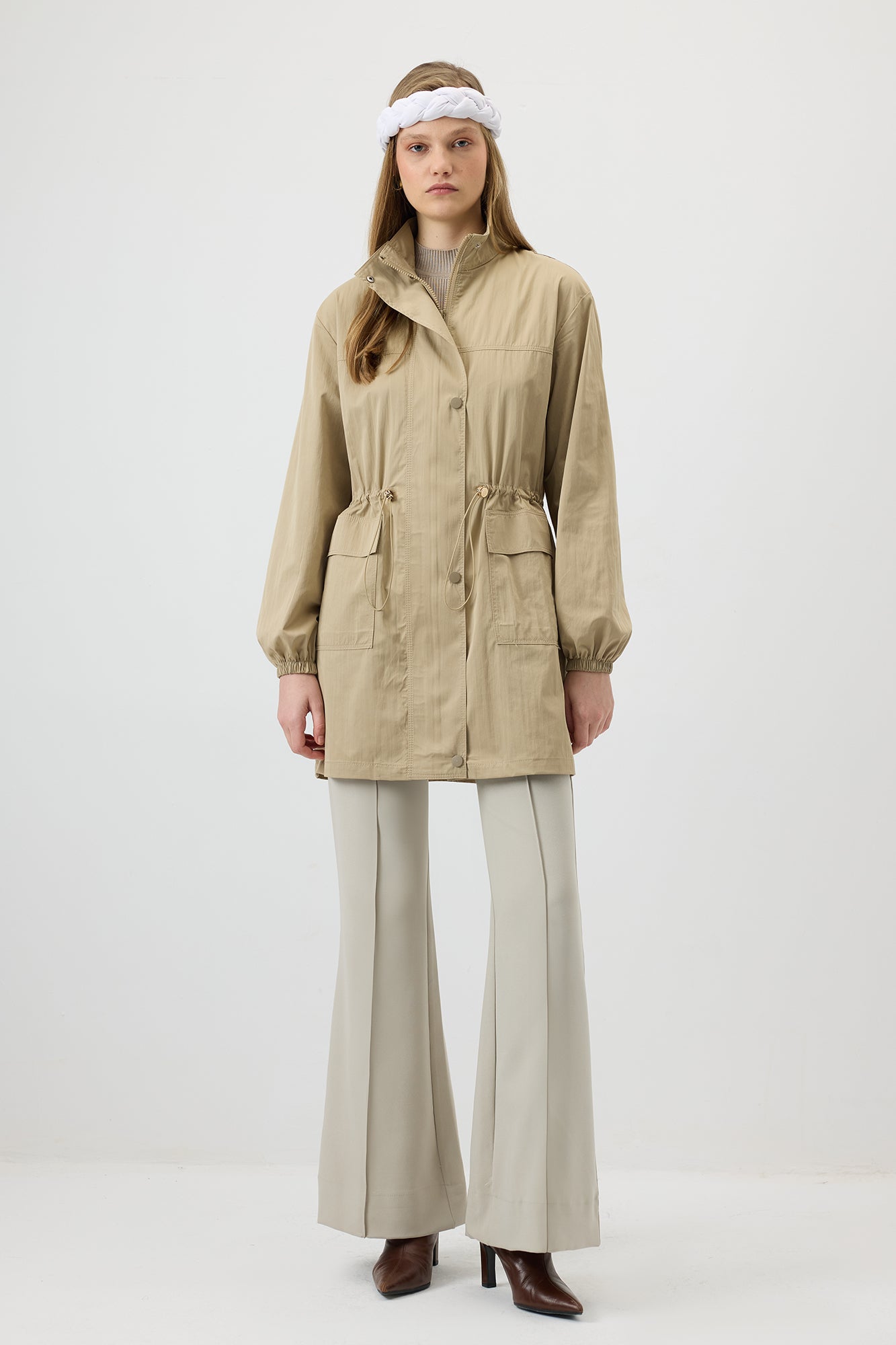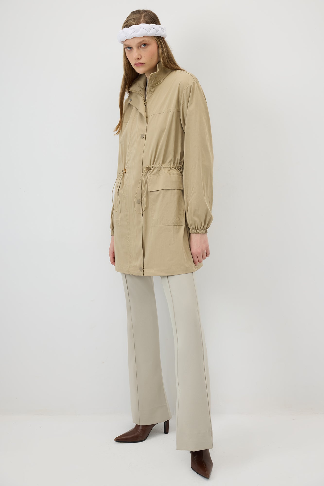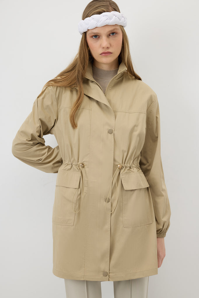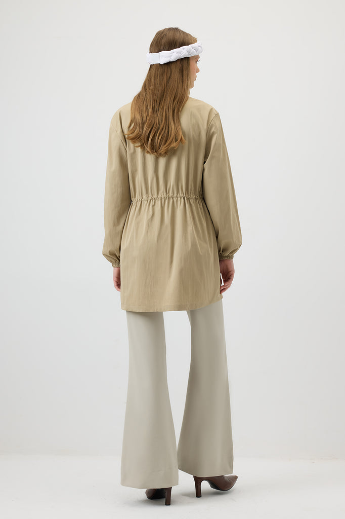 Belden büzgülü tasarımıyla zarif bir siluet oluşturan bu ceket, hafif yapısıyla mevsim geçişlerinde ideal bir konfor sunar. Fermuar ve çıtçıt detaylarıyla pratik bir kullanım sağlarken, geniş cepleriyle fonksiyonel bir duruş kazandırır. Günlük kombinlerin vazgeçilmez tamamlayıcısıdır.