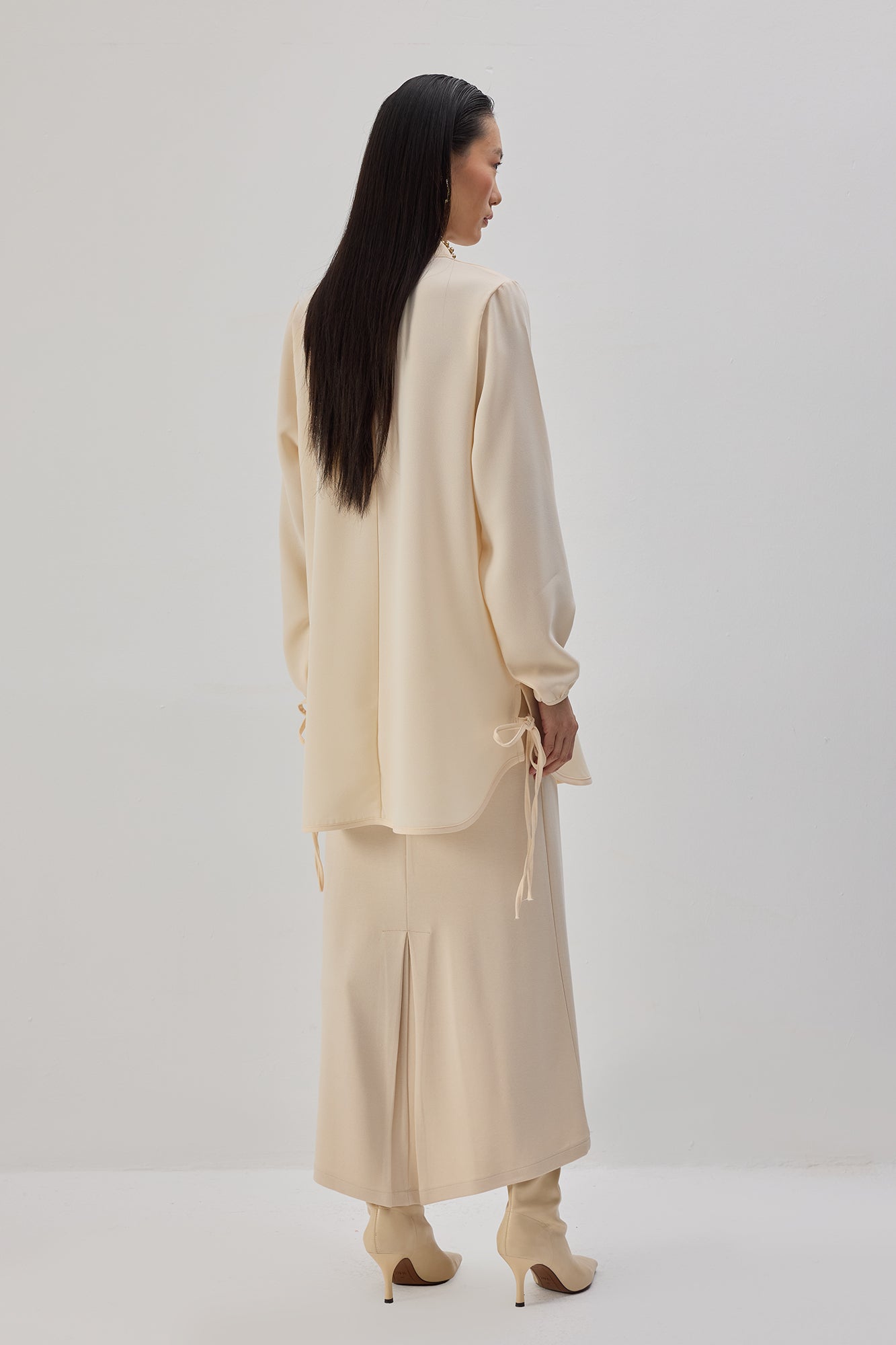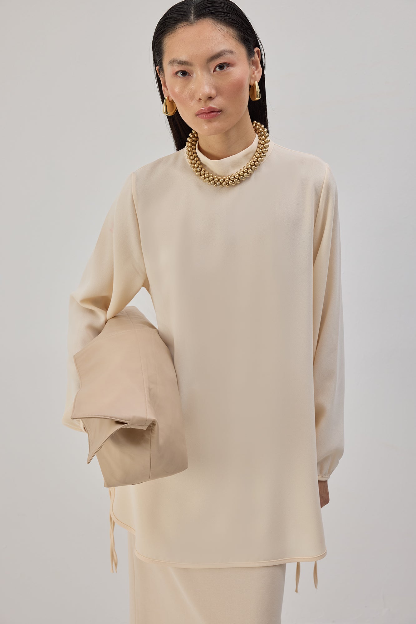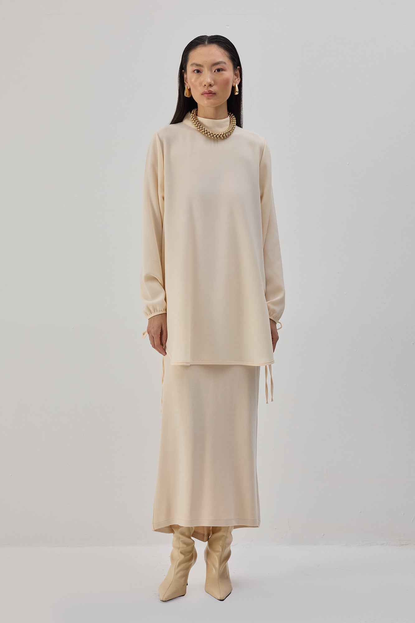 Dik yaka. Uzun kollu. Etek ucu bağlama detaylı. Krep tunik.