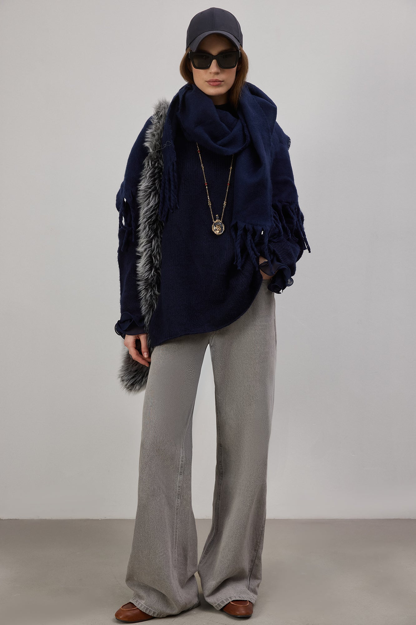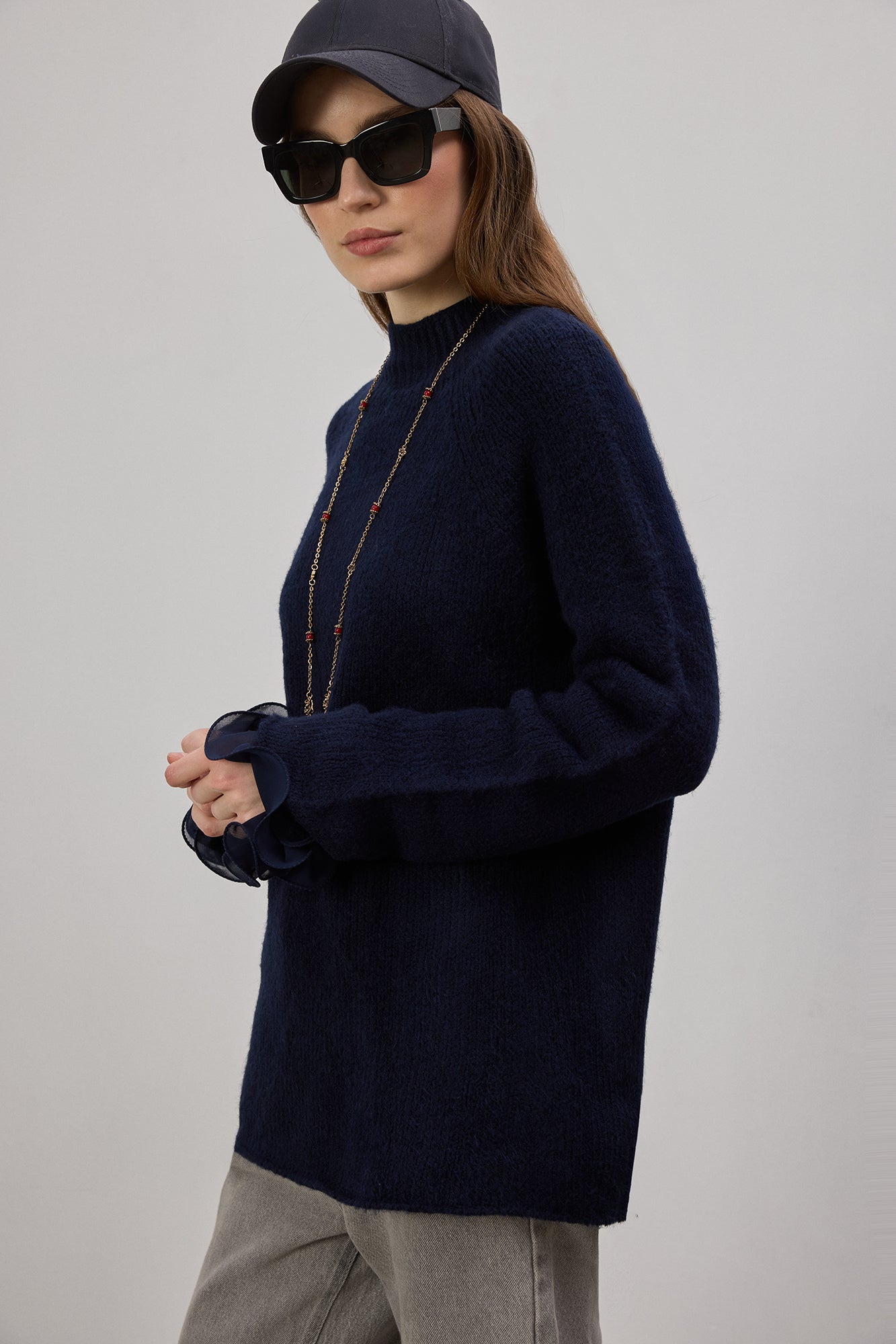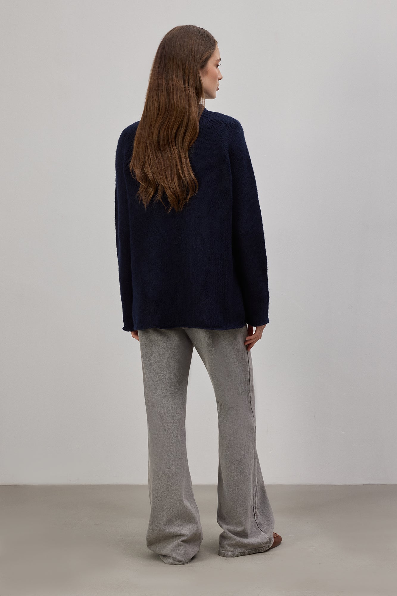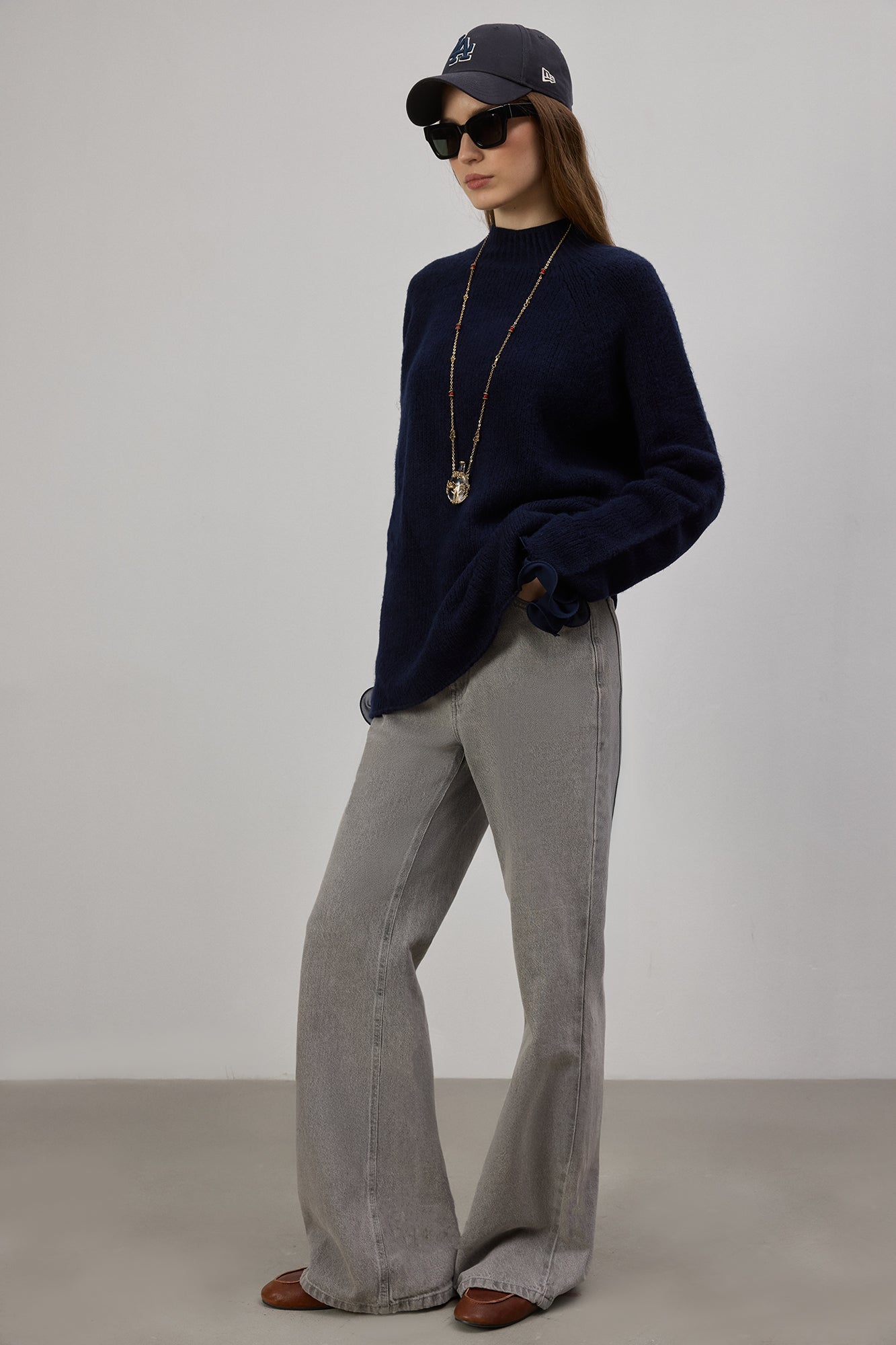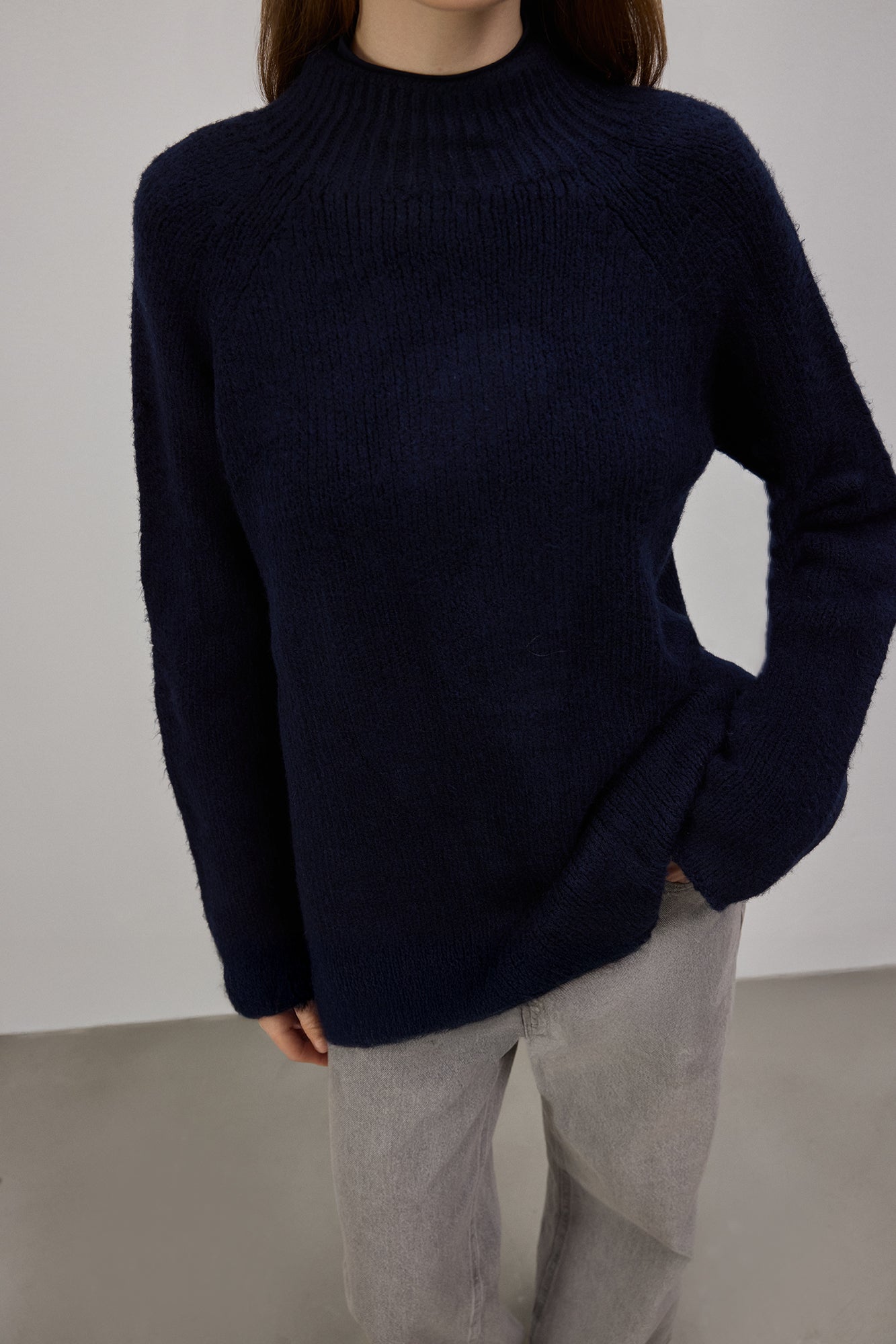 Dik yaka. Reglan kol detaylı. Uzun kollu. Triko kazak.