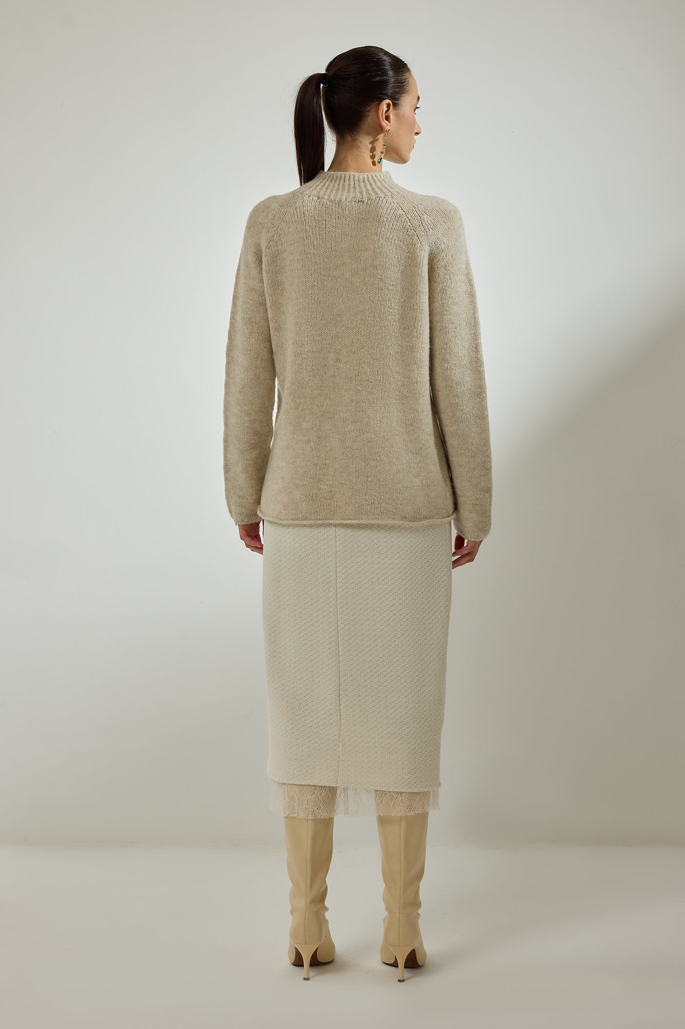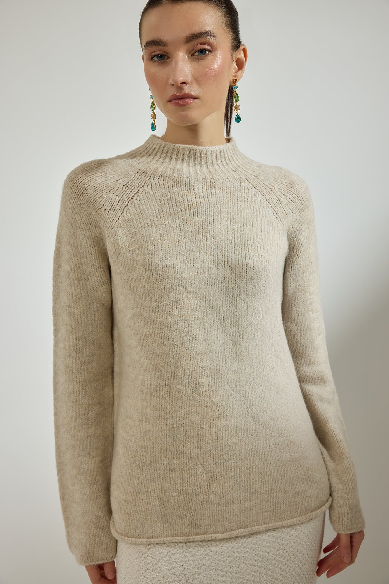 Dik yaka. Reglan kol detaylı. Uzun kollu. Triko kazak.