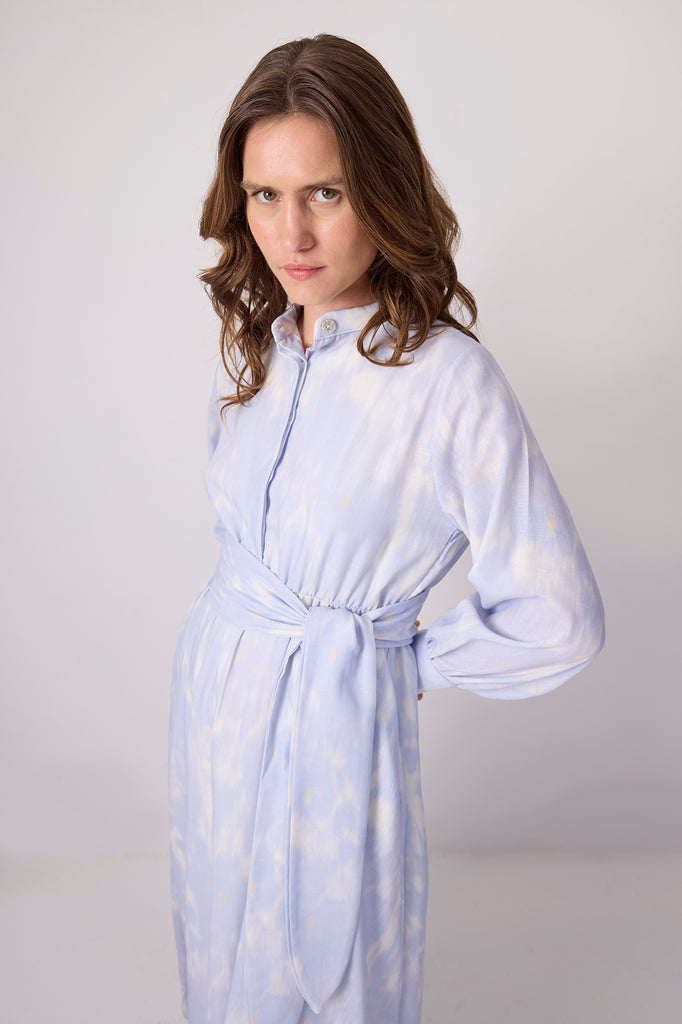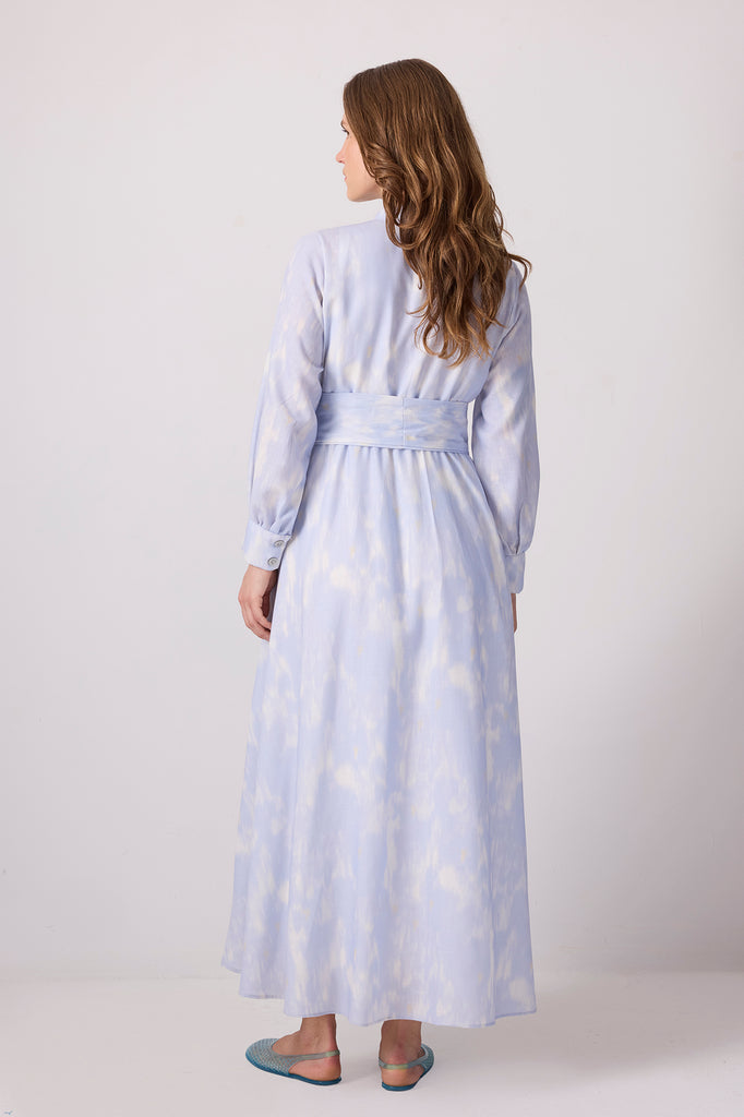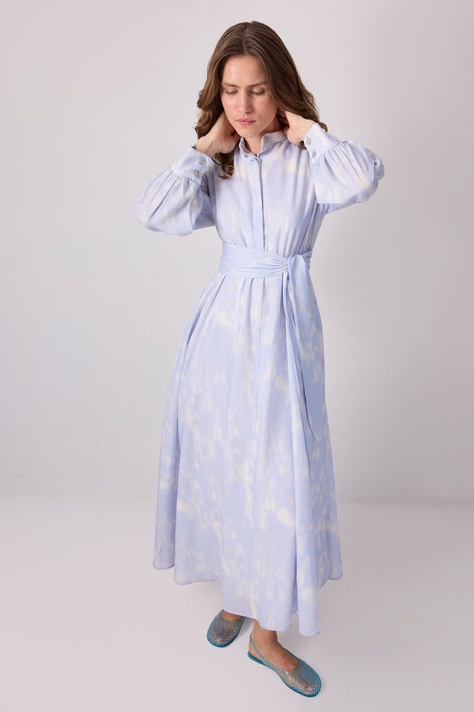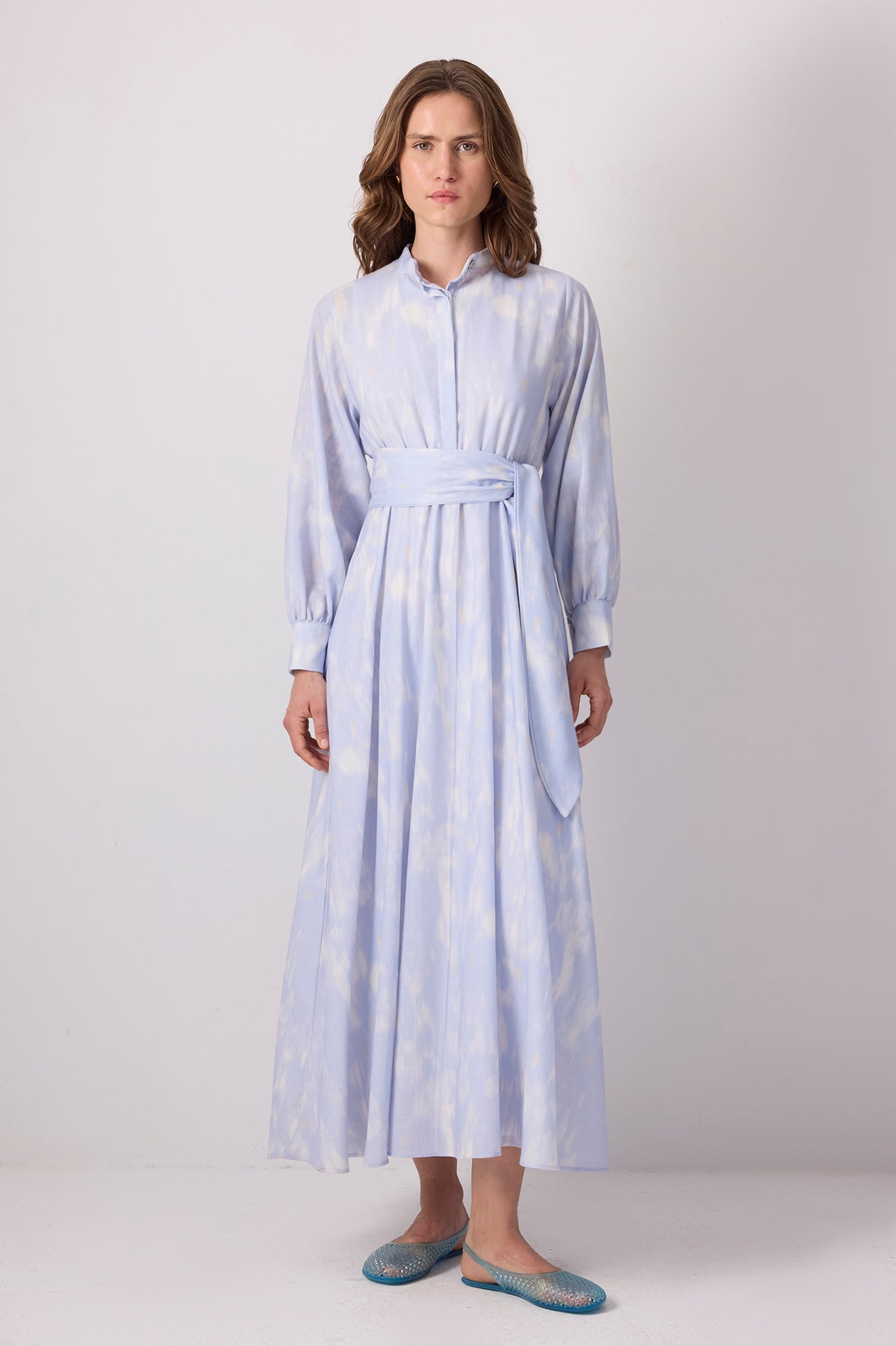 Pamuklu. Abstract desenli. Dik yaka. Gizli düğme kapamalı. Beli kuşaklı. Pileli. Astarlı.