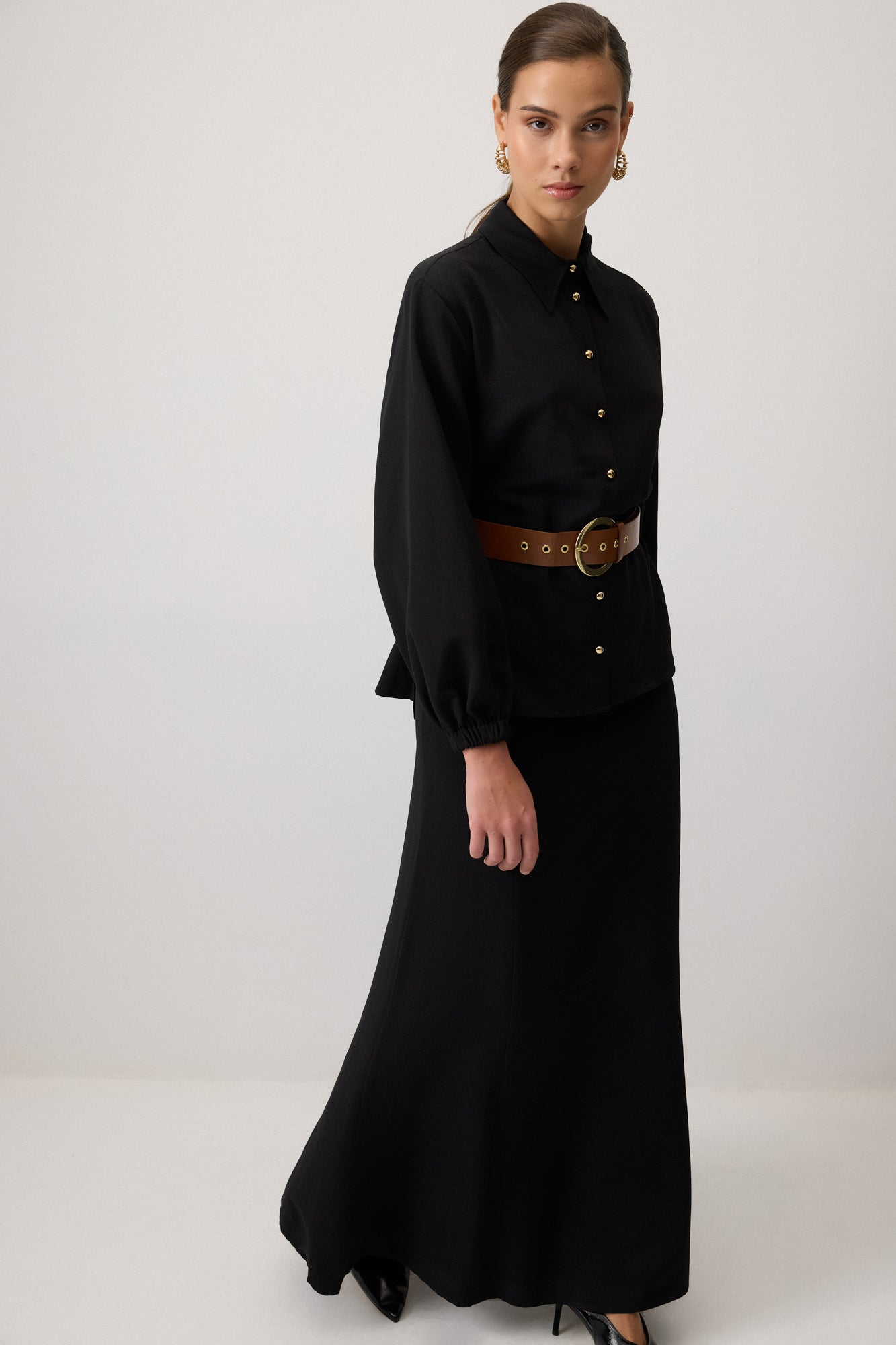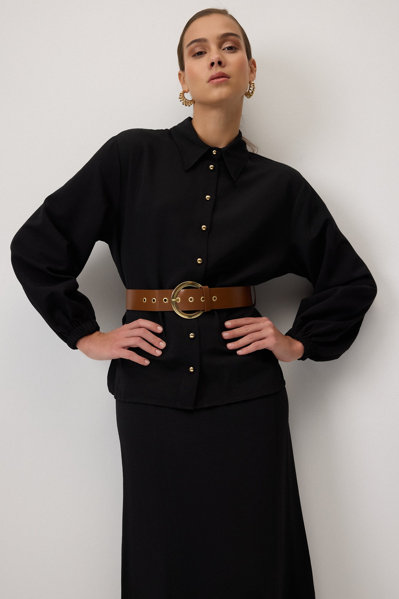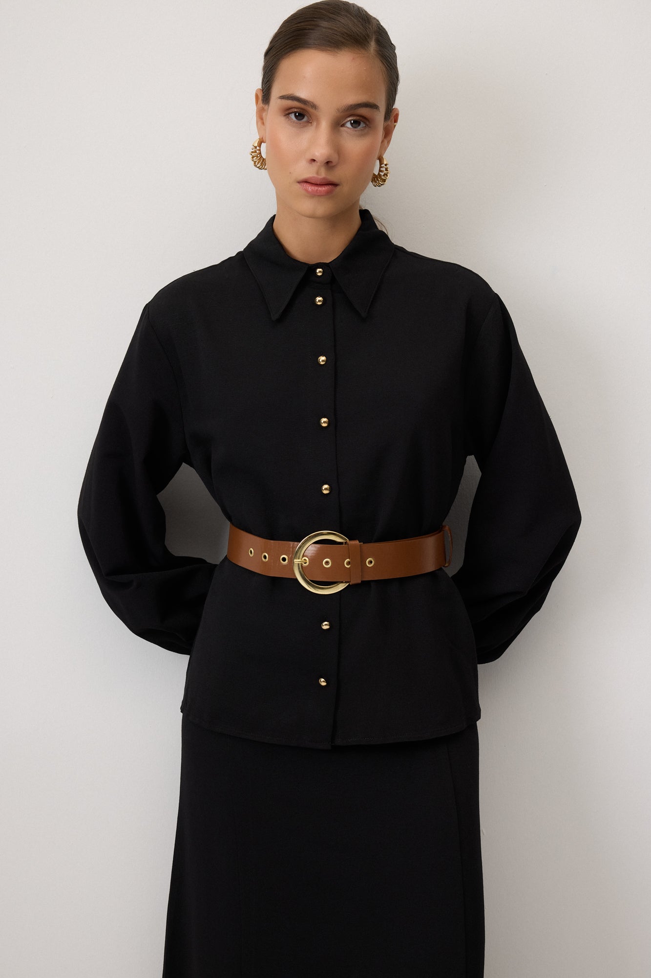 Klasik yaka. Uzun kollu. Kemer detaylı. Dokulu kumaş gömlek etek takım.