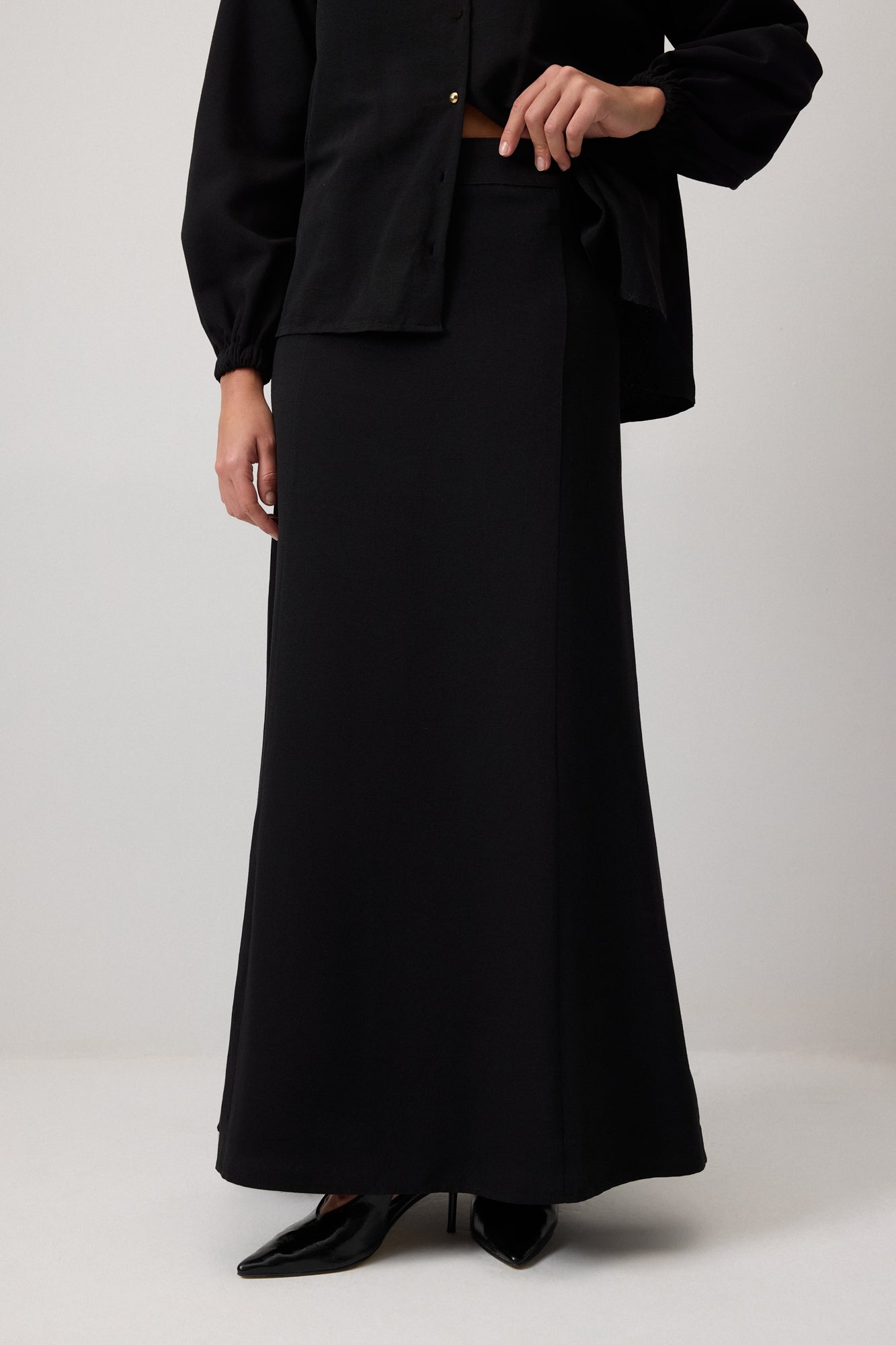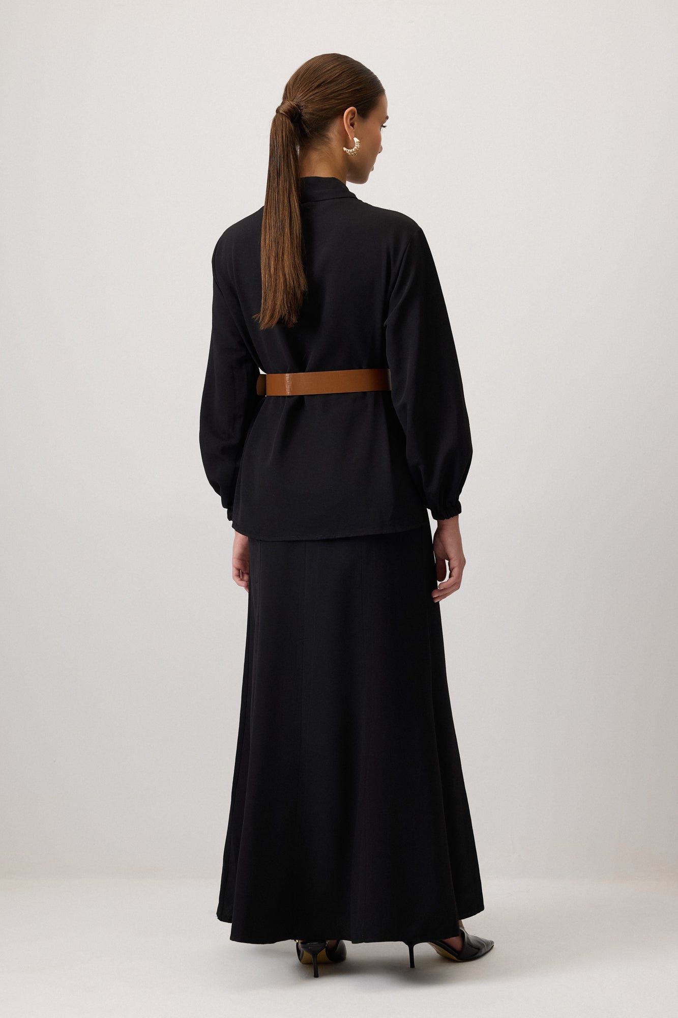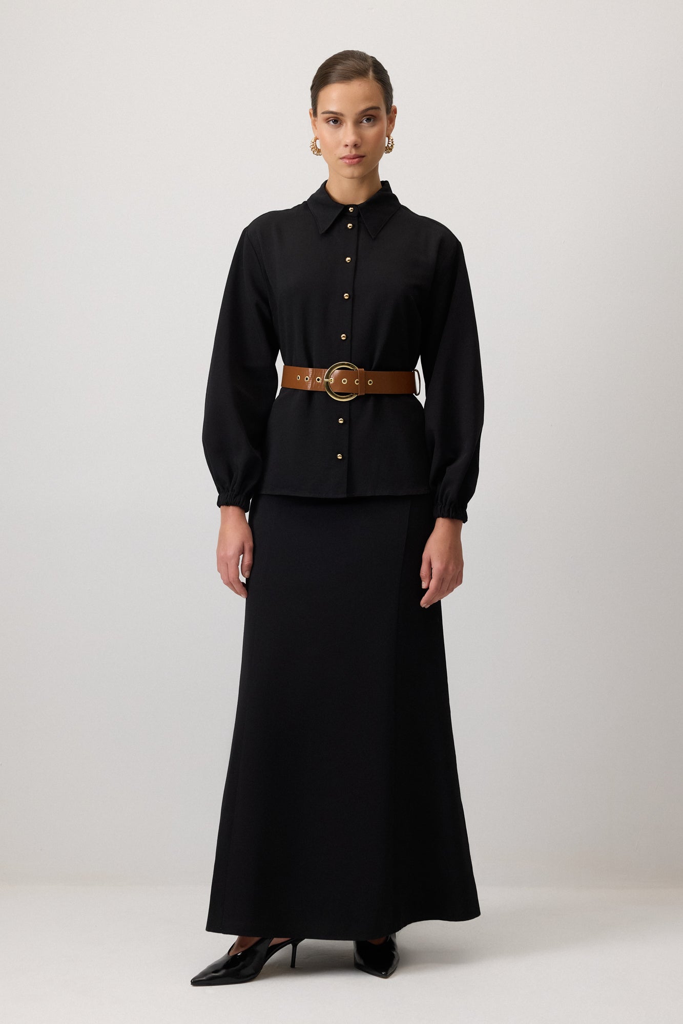 Klasik yaka. Uzun kollu. Kemer detaylı. Dokulu kumaş gömlek etek takım.