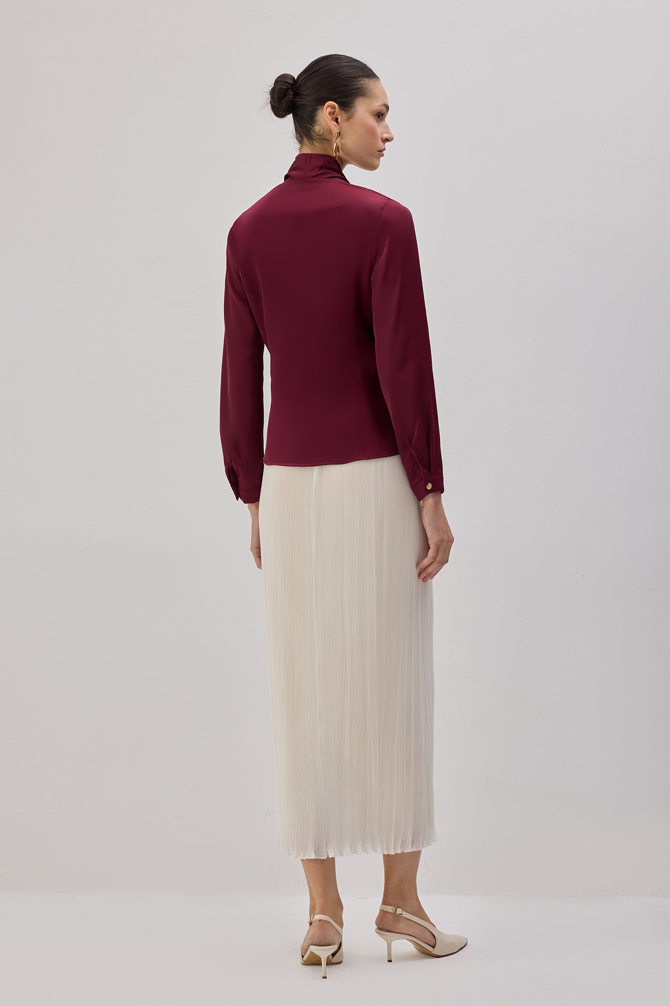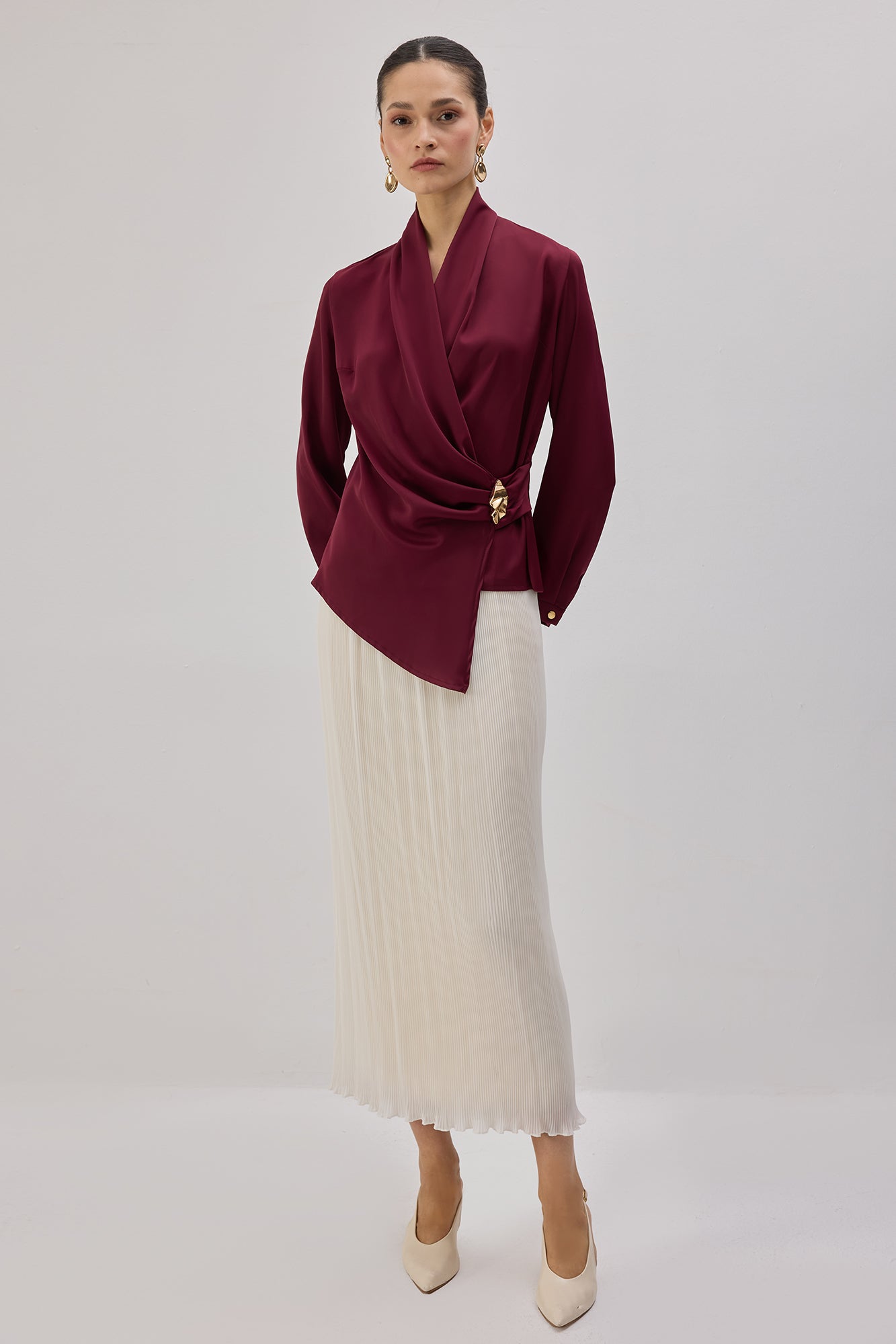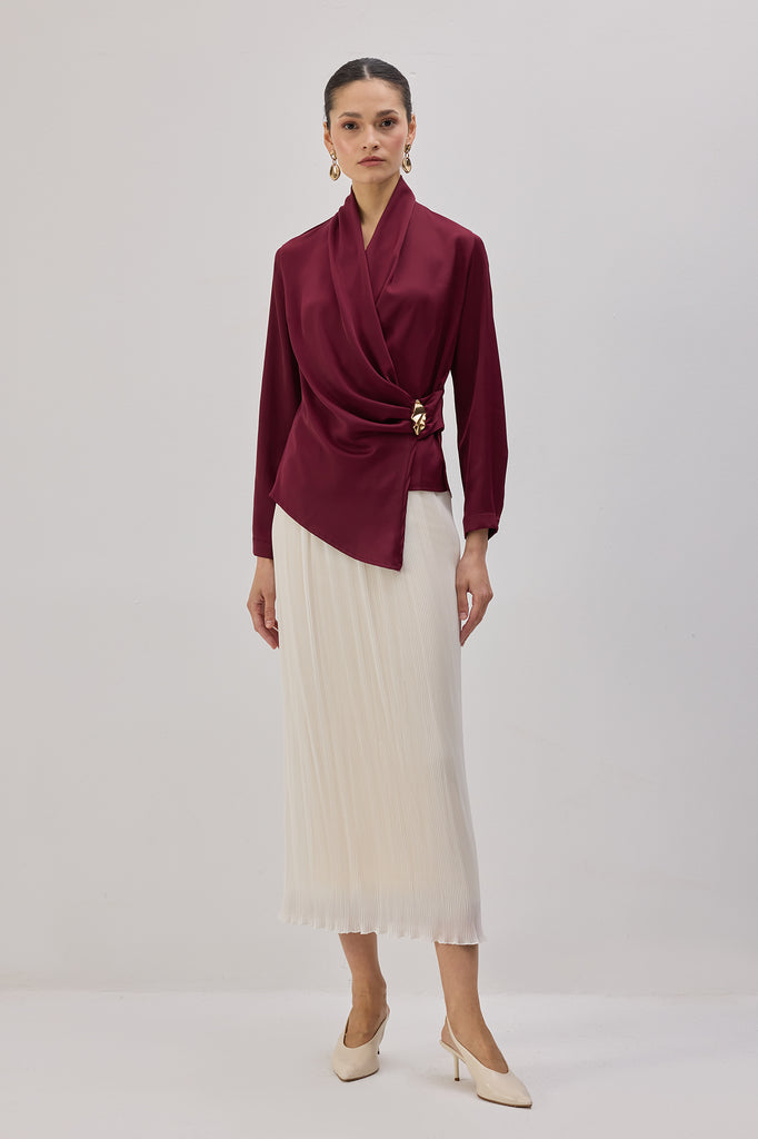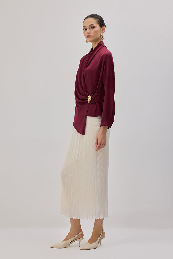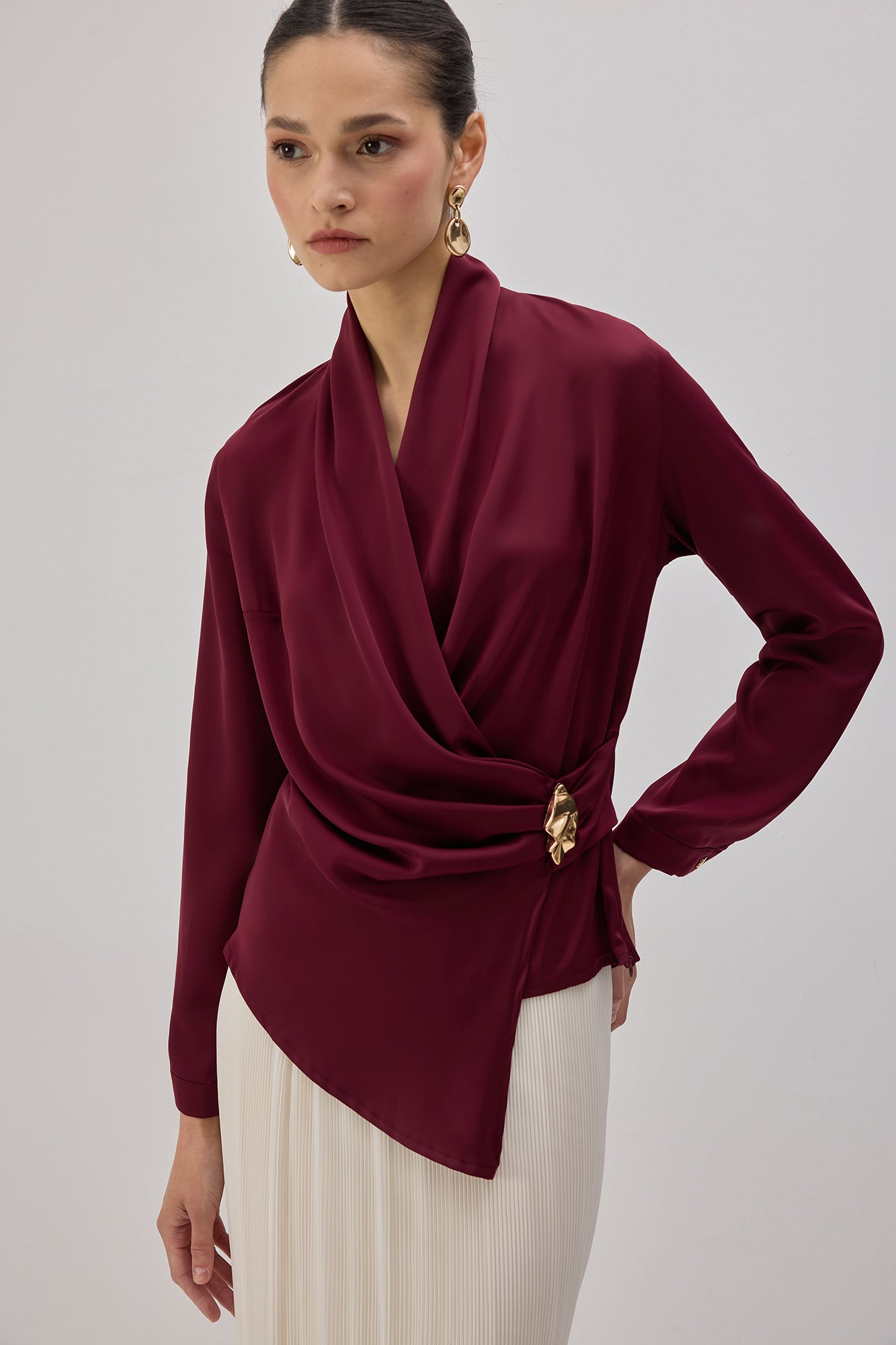 Uzun kollu. Gold aksesuarlı. Asimetrik drape detaylı.