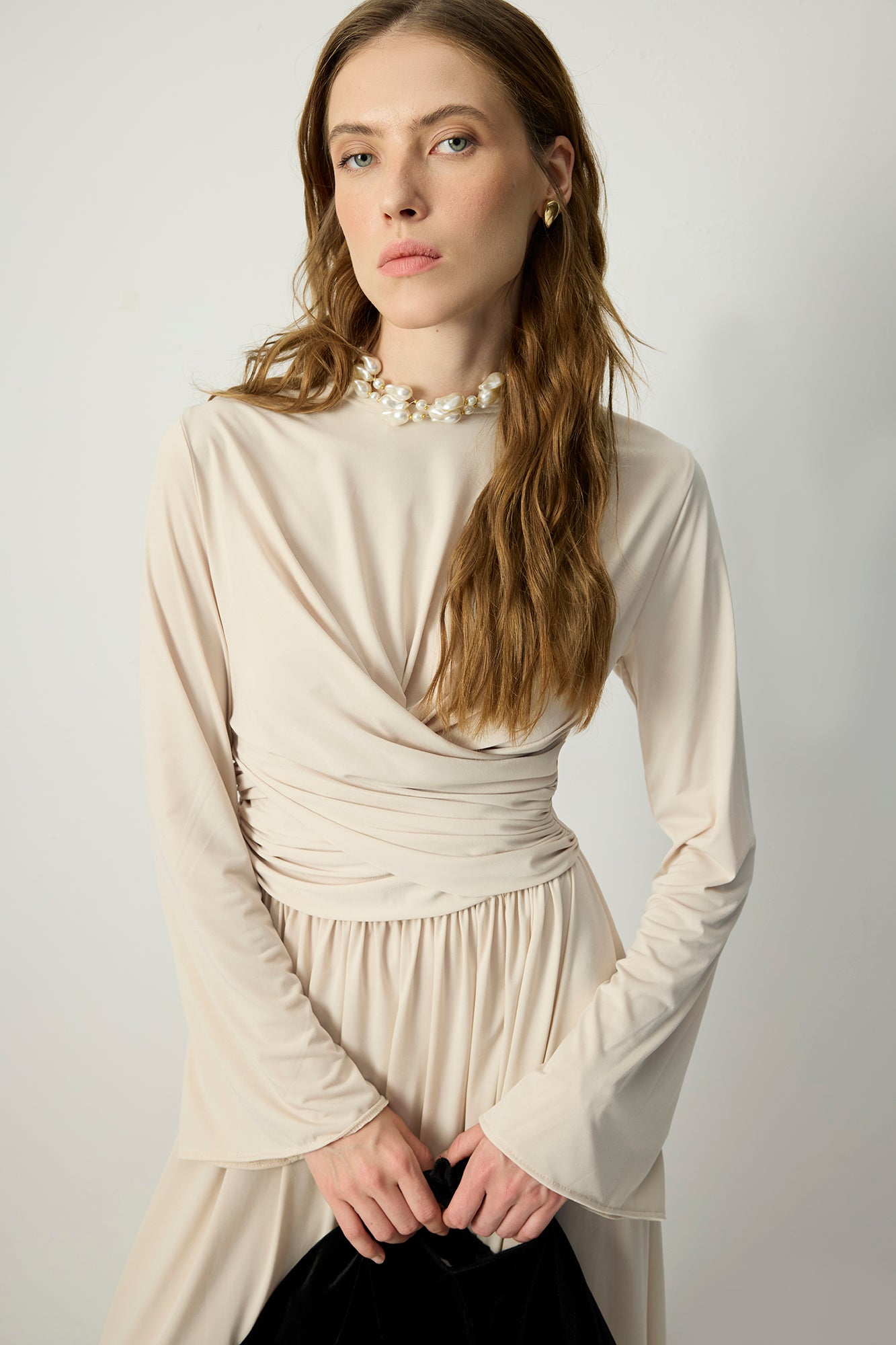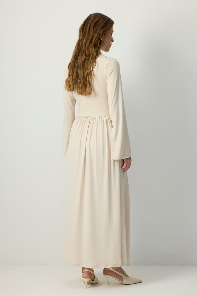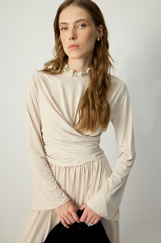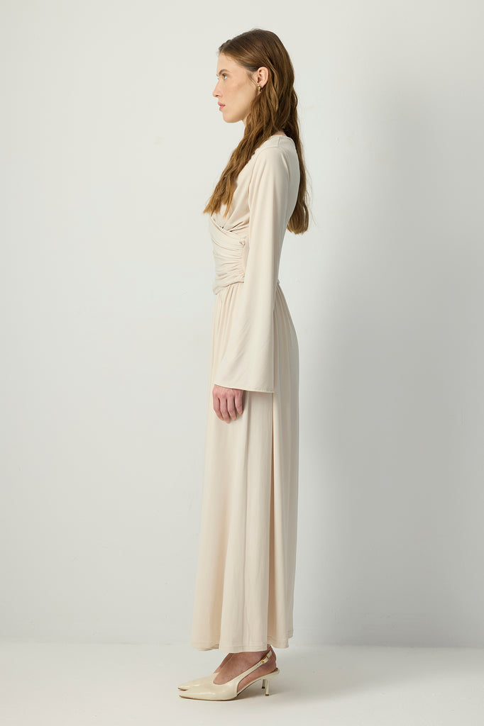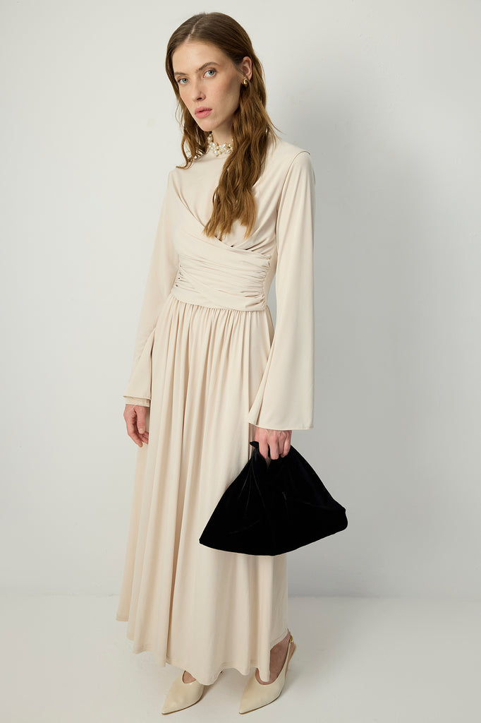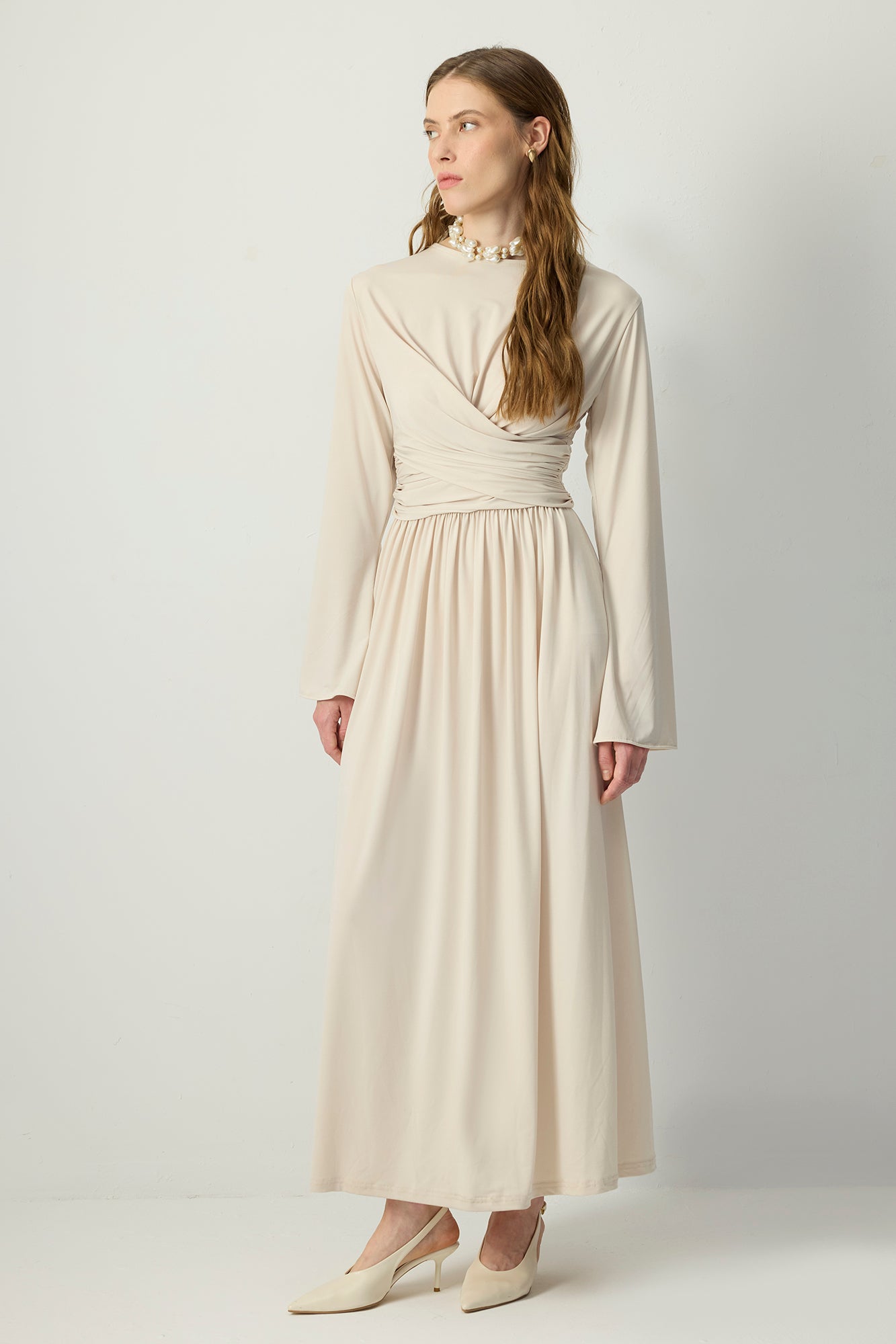 Kayık yaka. Uzun kollu. Önü çapraz drapeli. Arkadan düğme kapamalı. Beli büzgülü. Uzun boy.