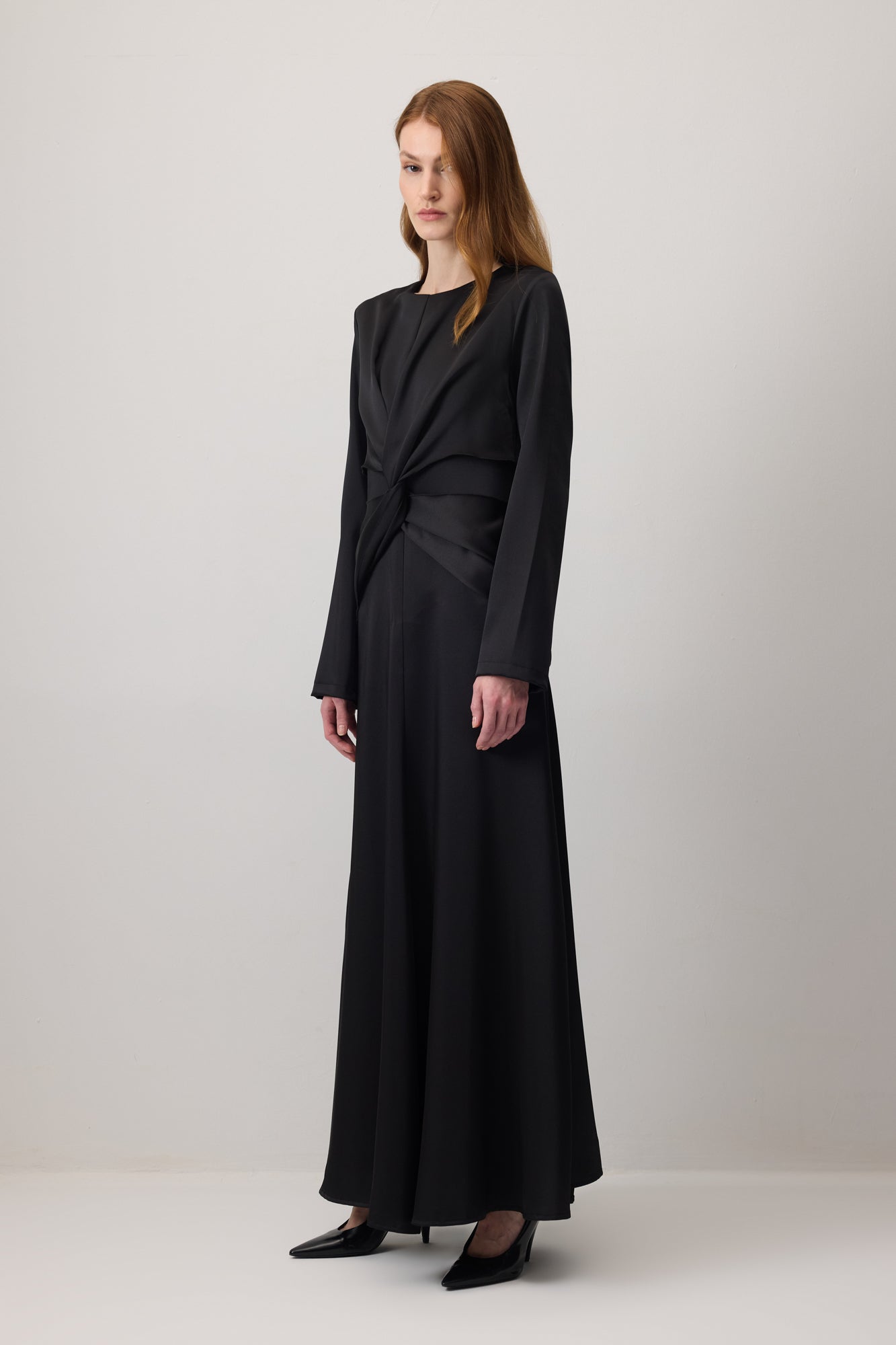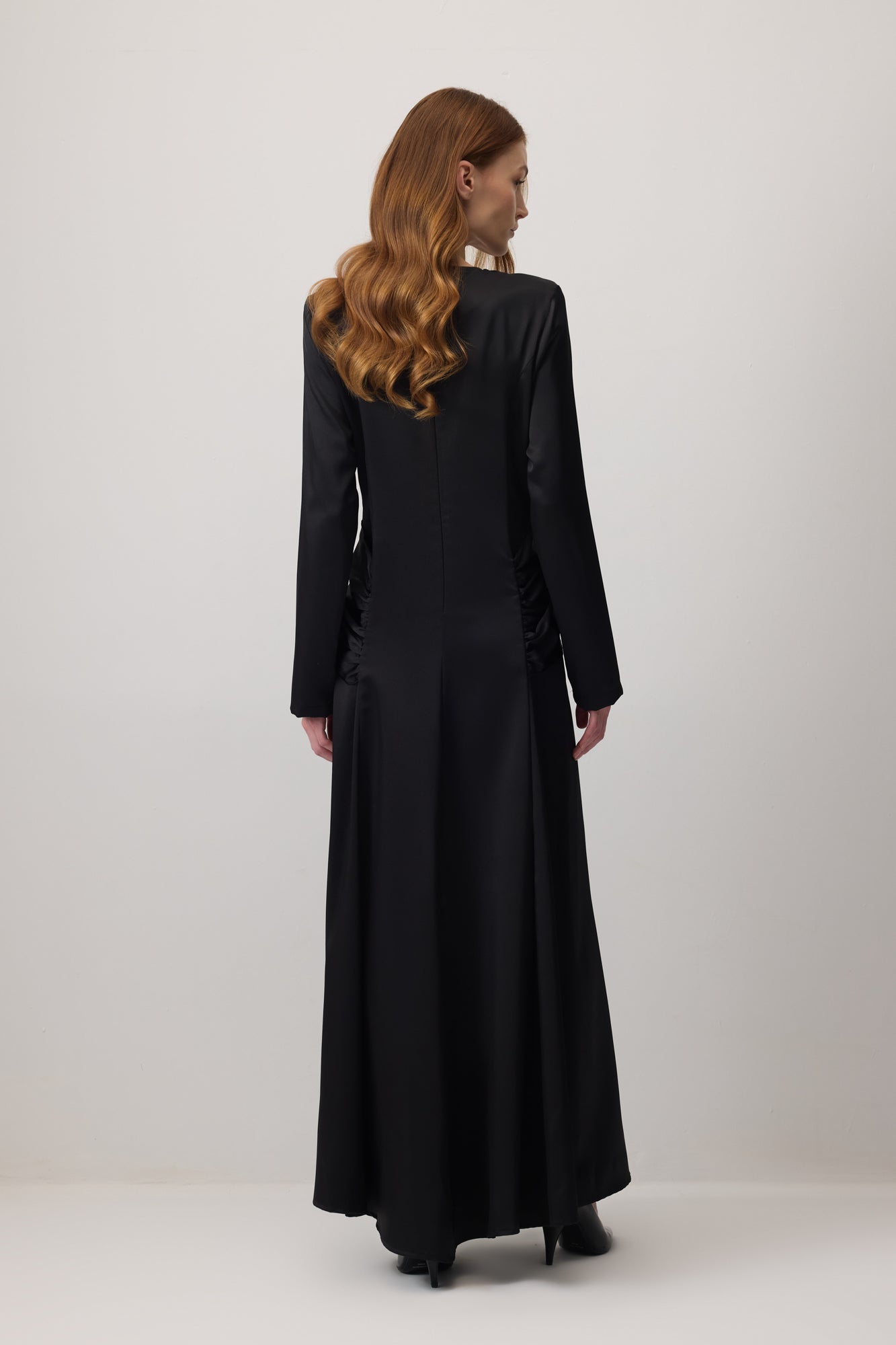 Saten elbise. Uzun kollu. Bel kısmı drapeli.