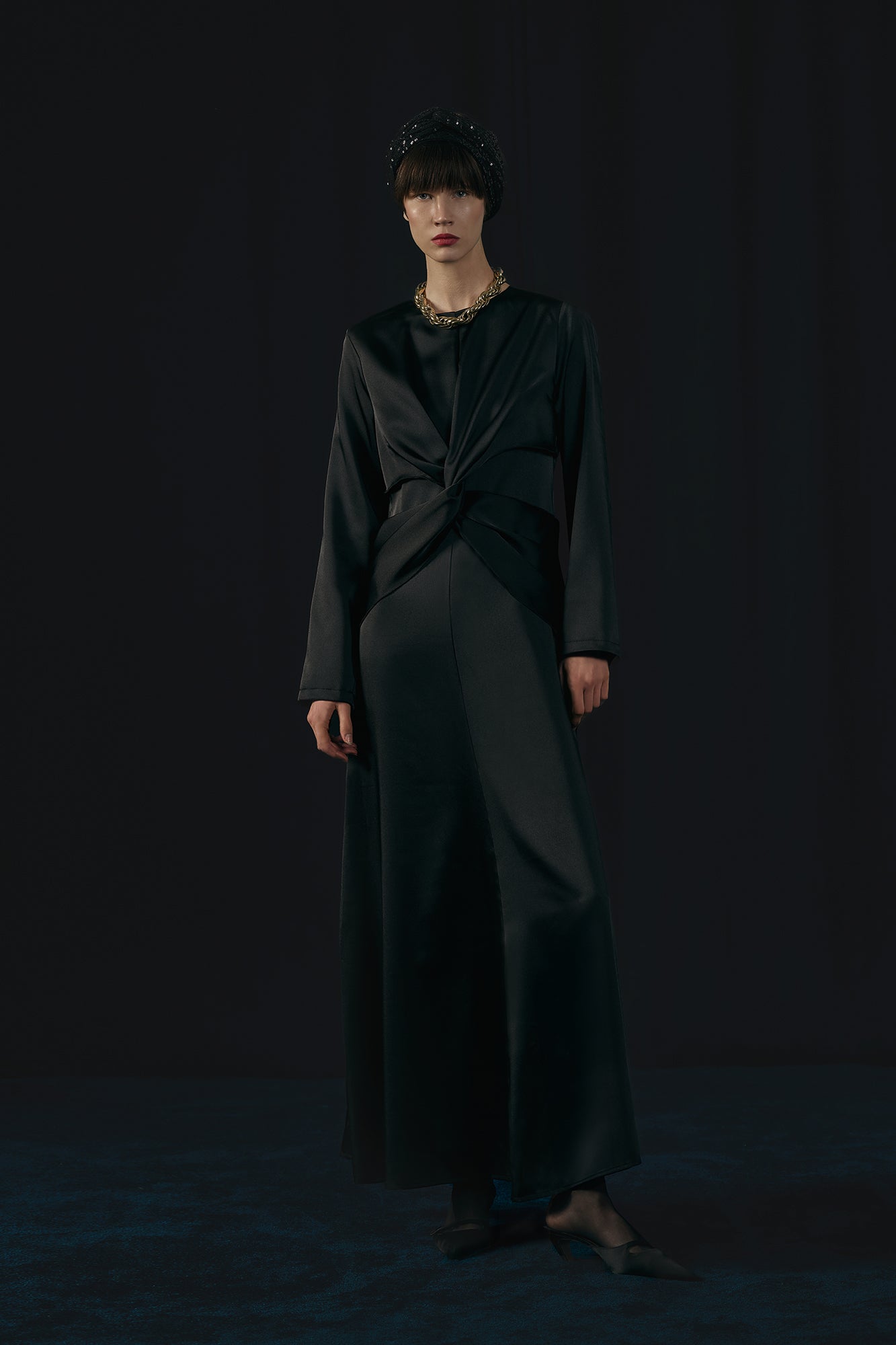 Saten dokusuyla zarafet kazanan bu elbise, bel kısmındaki drape detayıyla şık bir siluet oluşturur. Akıcı kumaşı ve sade formu sayesinde davetlerden özel akşamlara kadar her ortamda zarif bir duruş sergiler. Minimal aksesuarlarla tamamlanarak zamansız bir şıklık sunar.