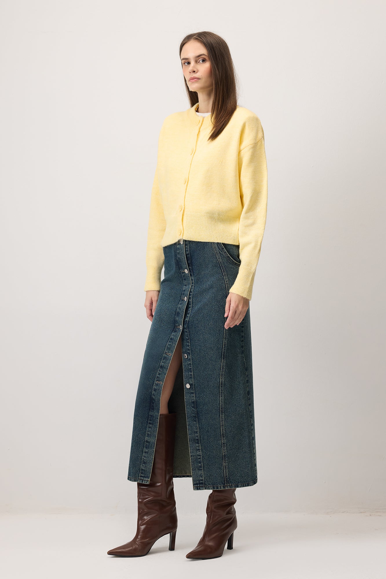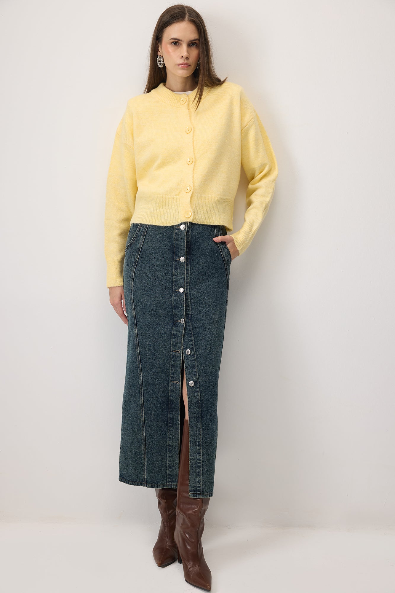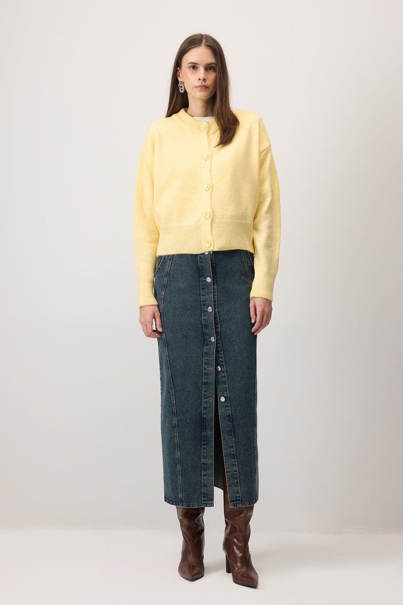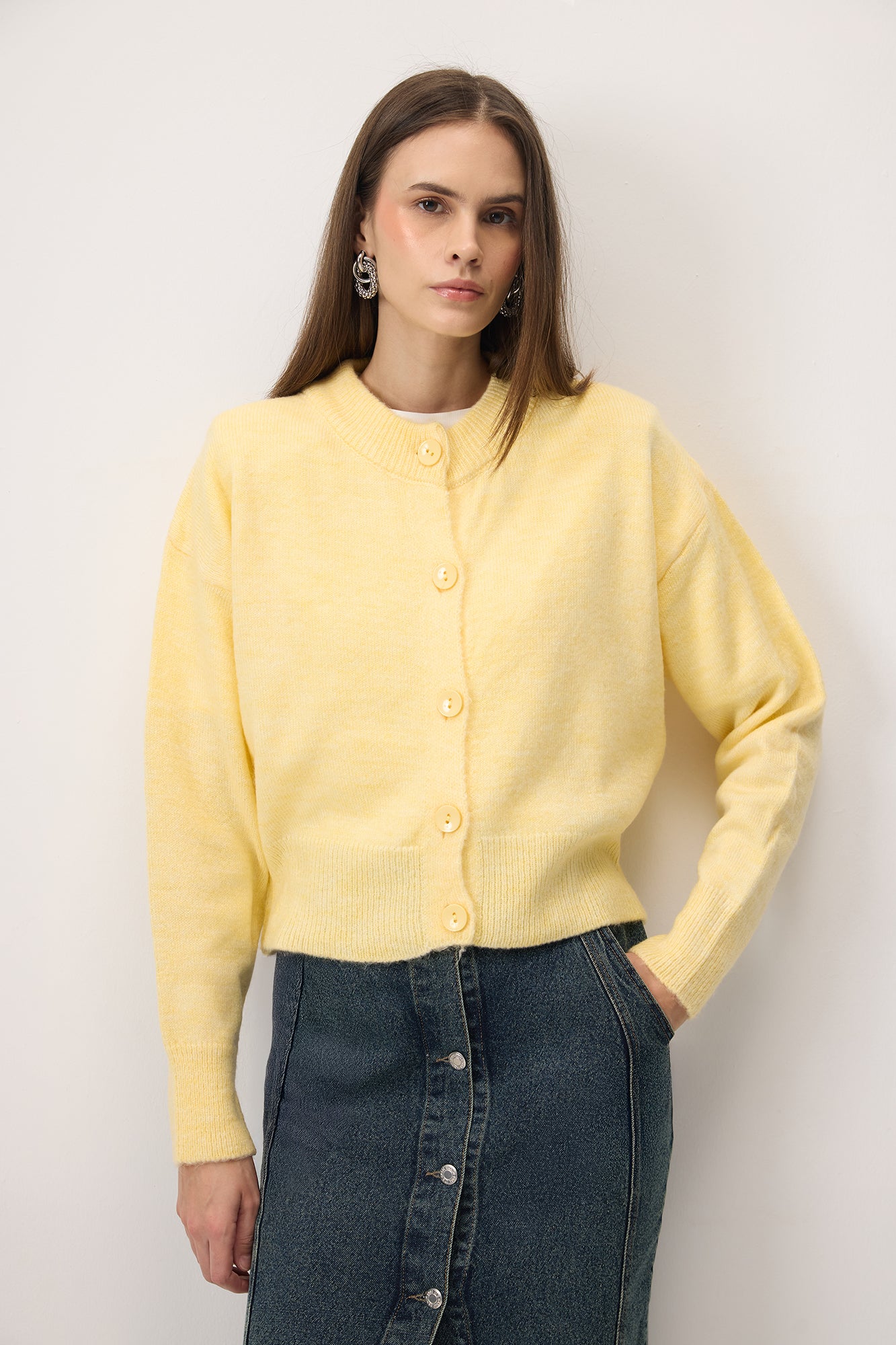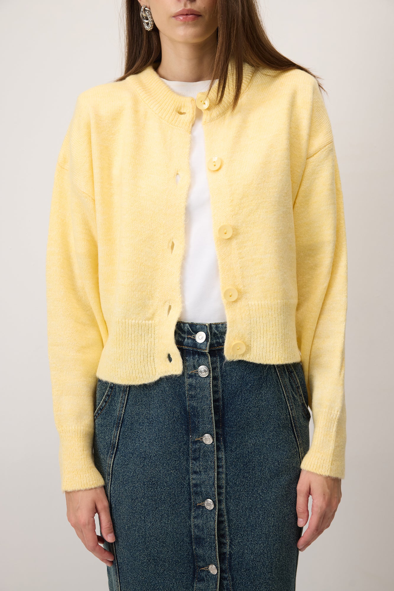 Yuvarlak yaka, büyük düğmeli kısa triko hırka.