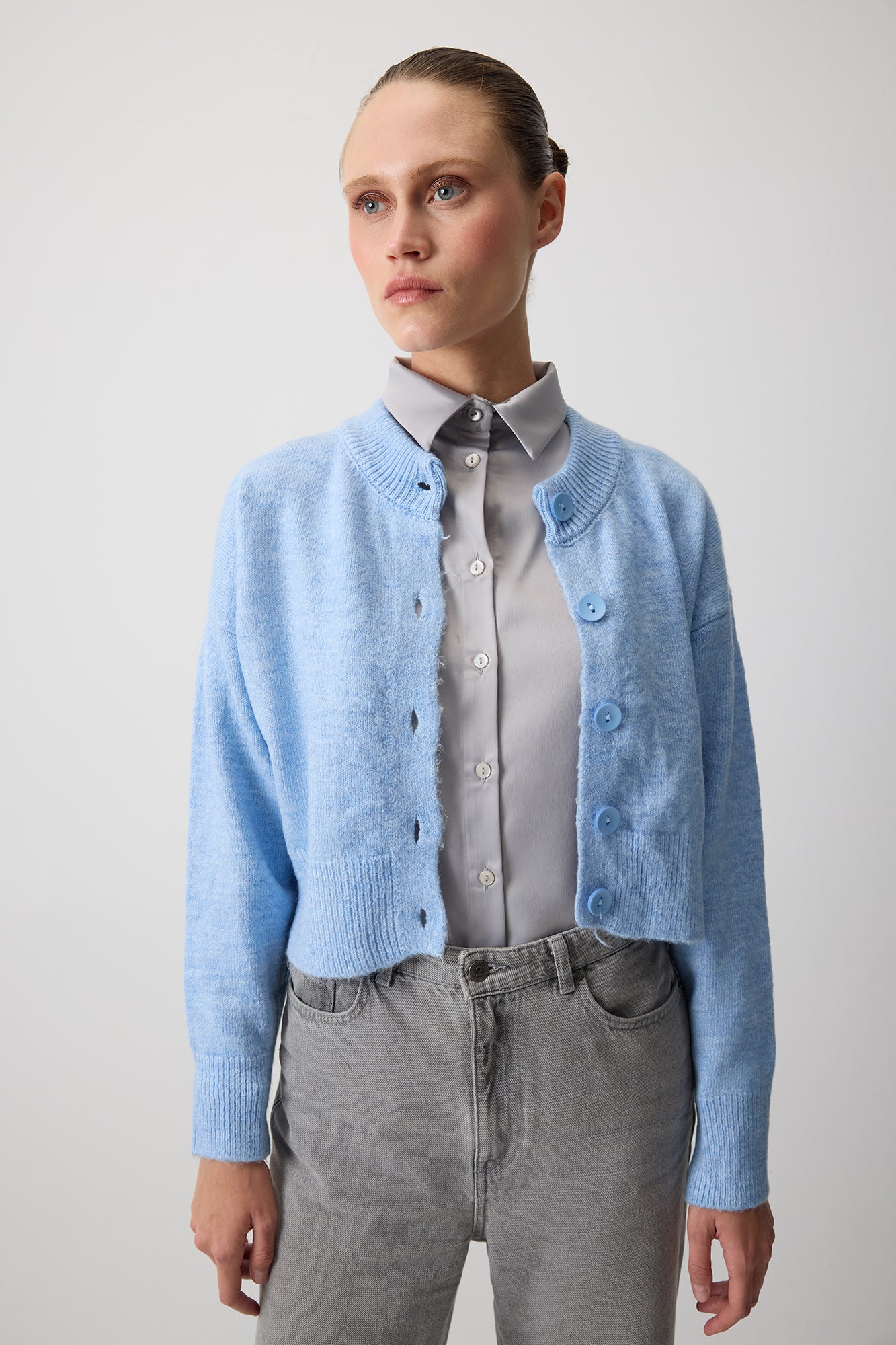 Yuvarlak yaka, büyük düğmeli kısa triko hırka.