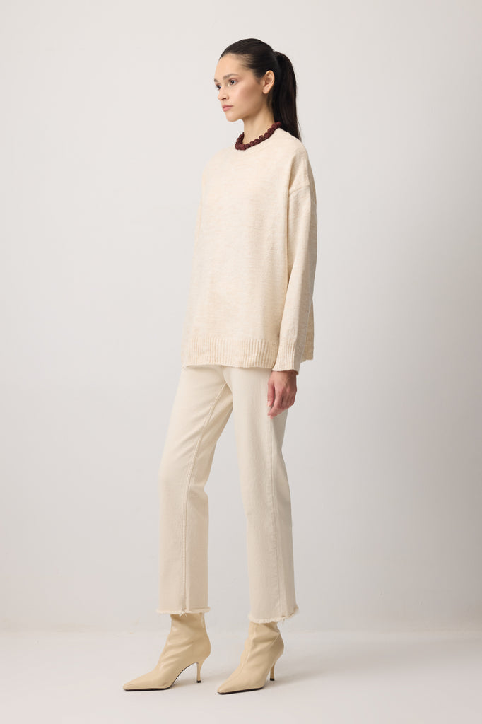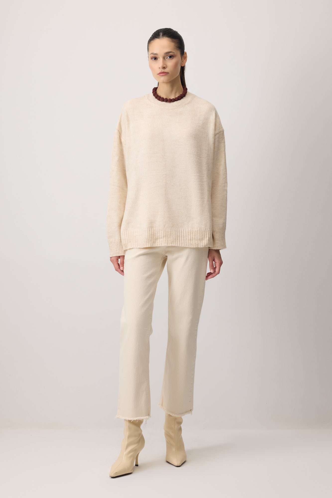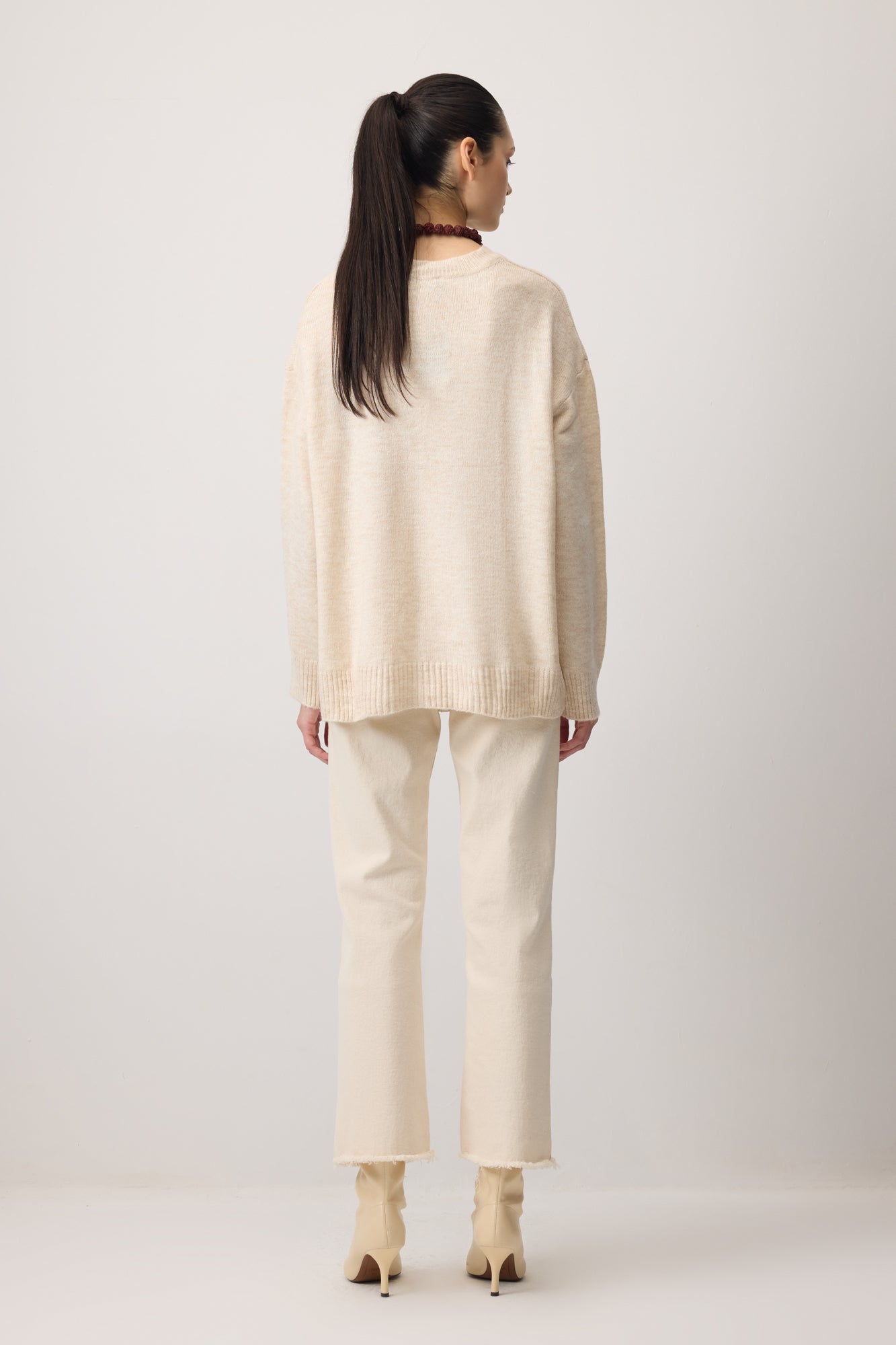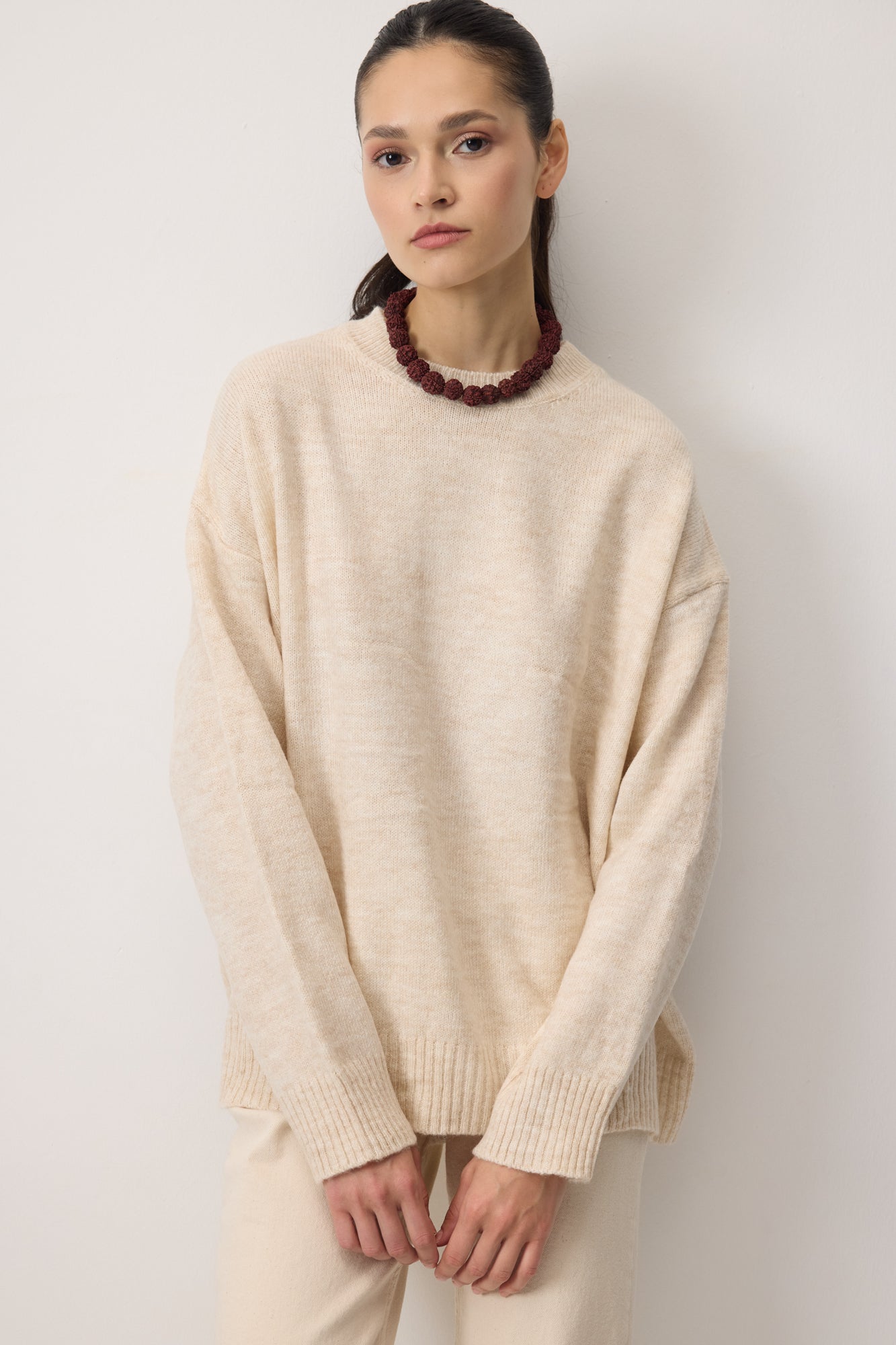Bisiklet yaka. Uzun kollu ve düşük omuzlu. Oversize.