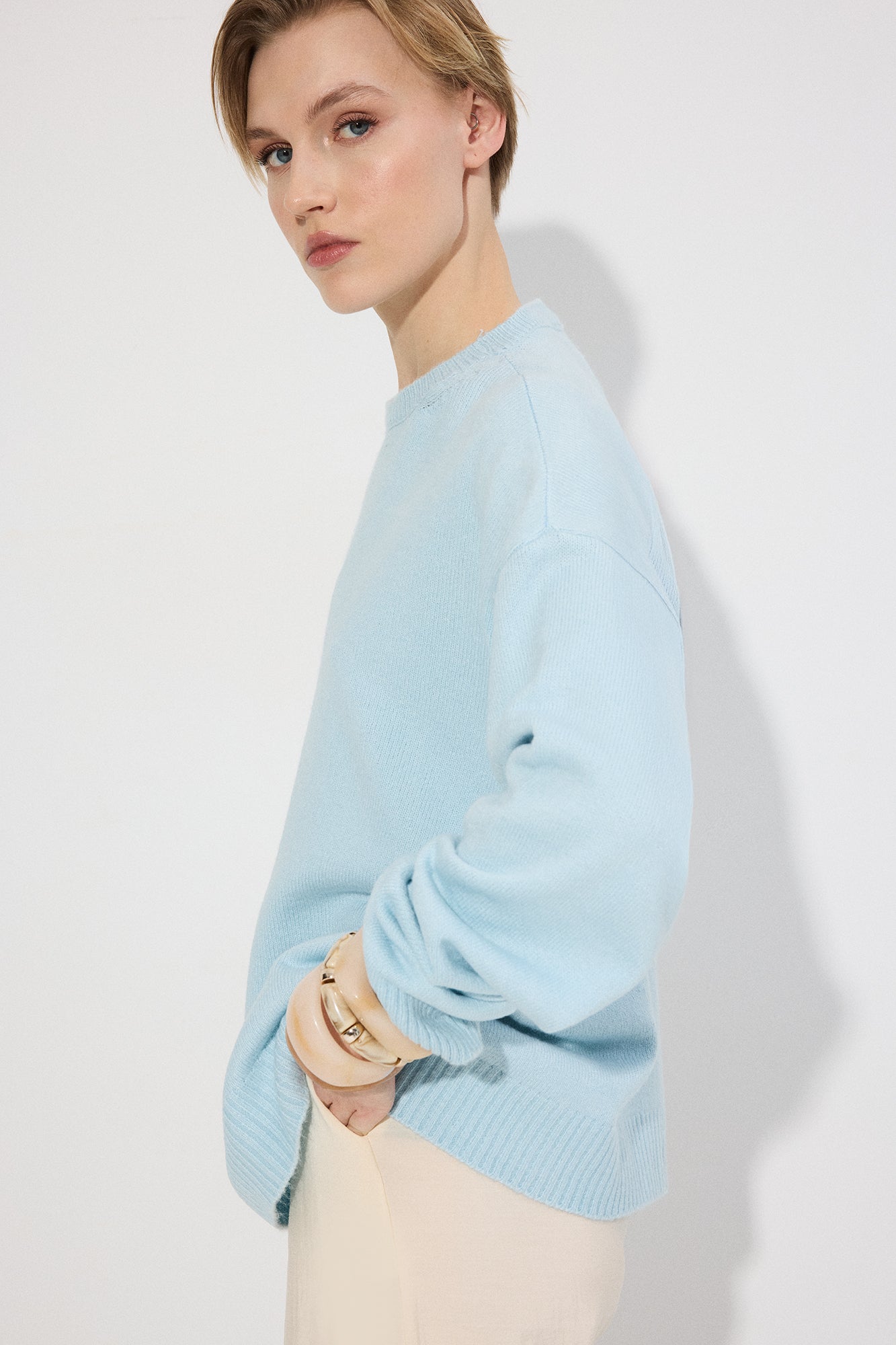 Bisiklet yaka. Uzun kol. Düşük omuz. Ribanalı yaka, manşet ve etek ucu.