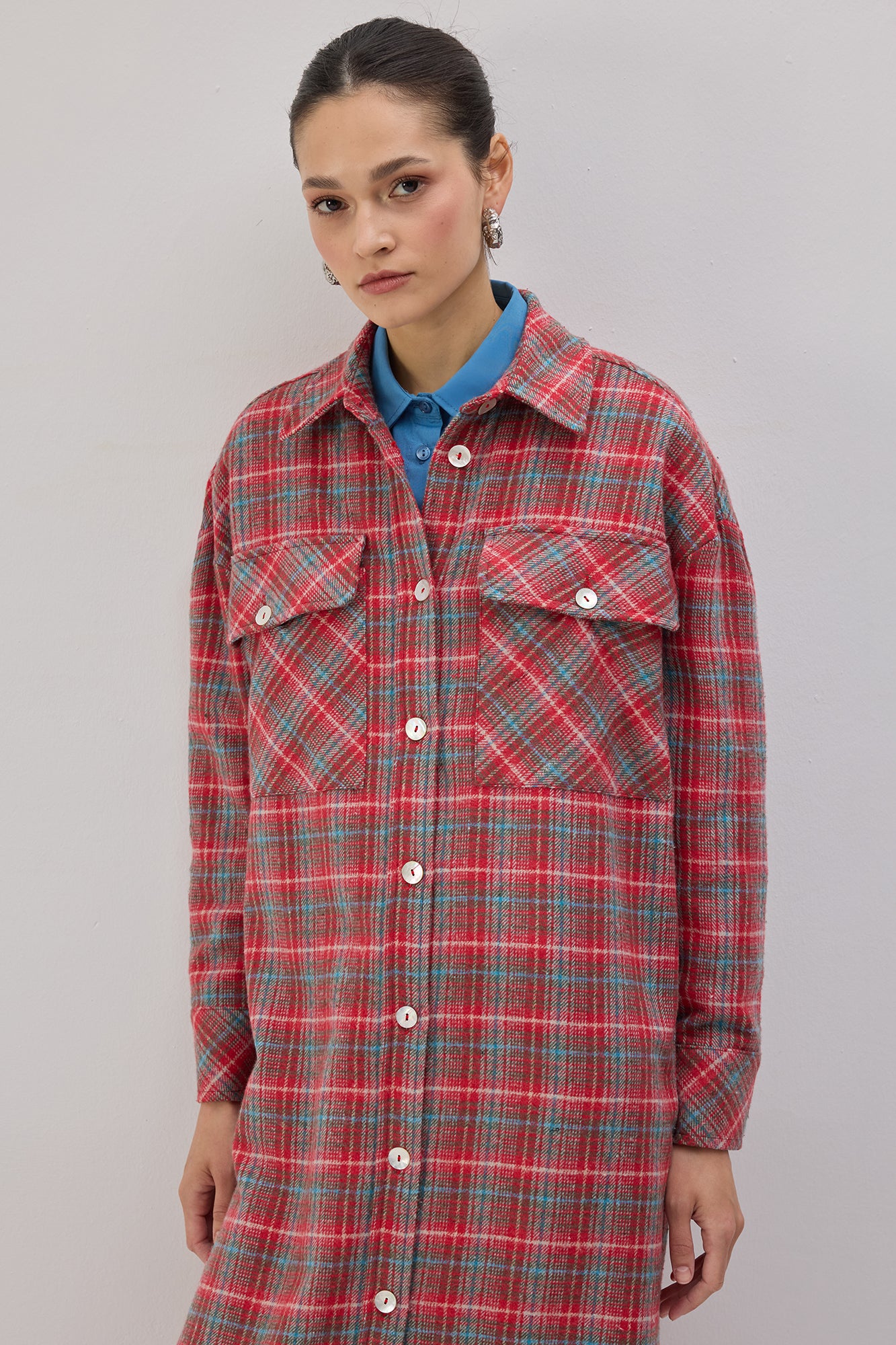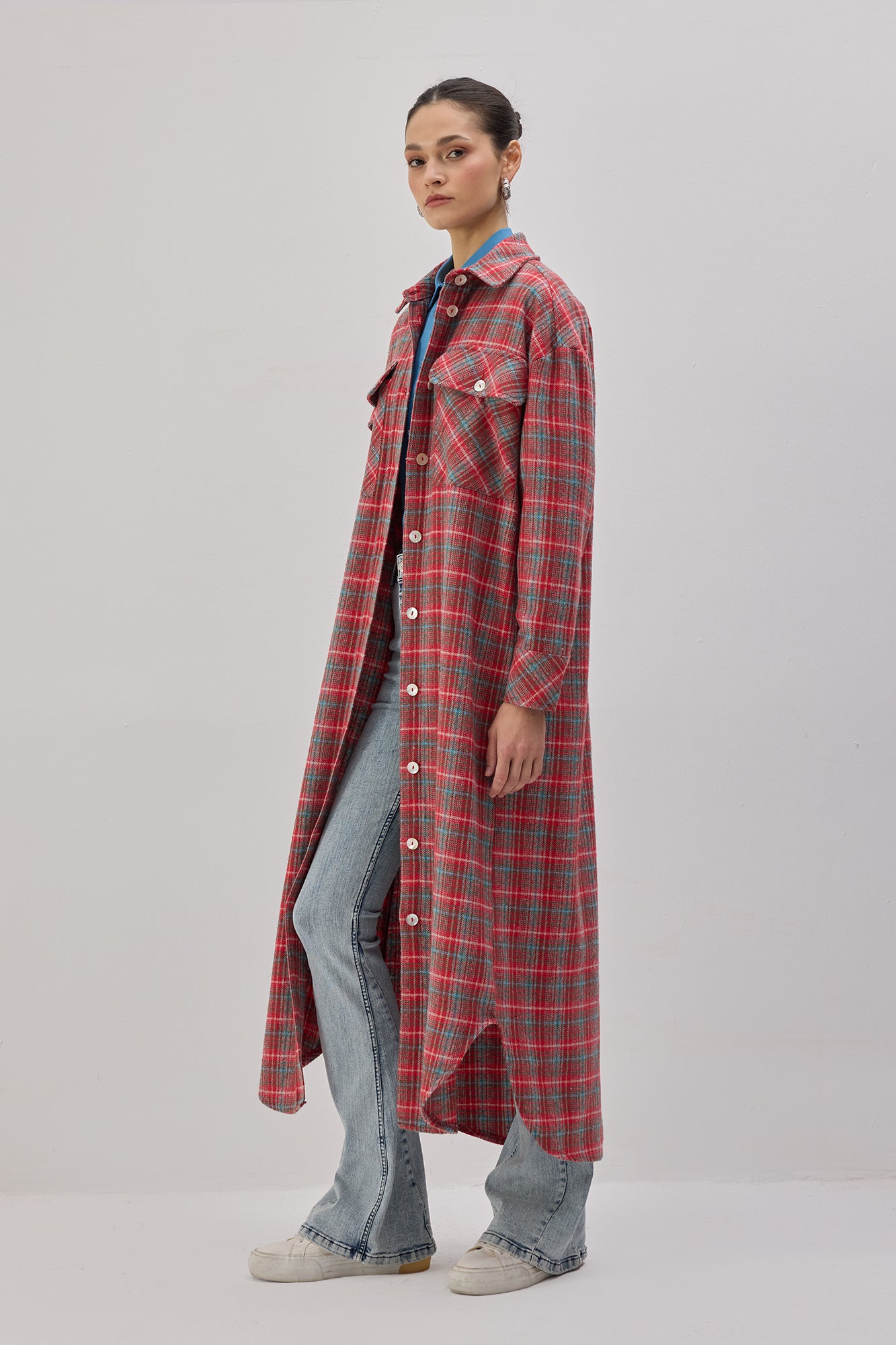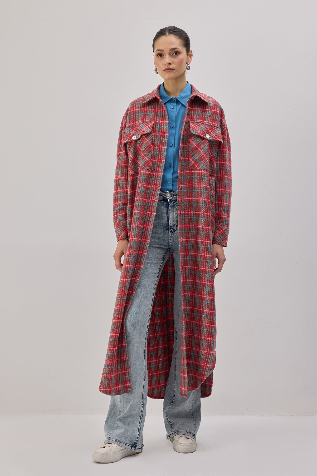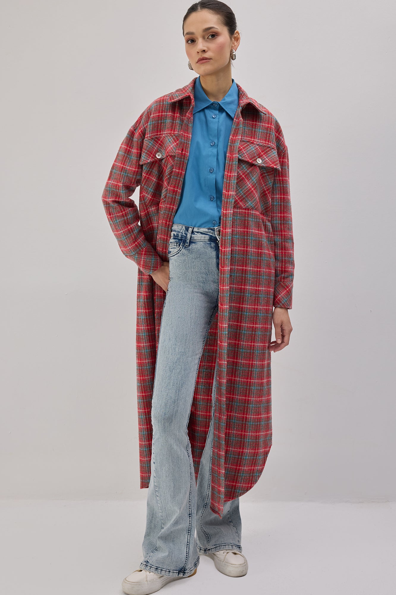 Klasik yaka. Önde çift kapaklı cep. Tam boy düğme kapama.