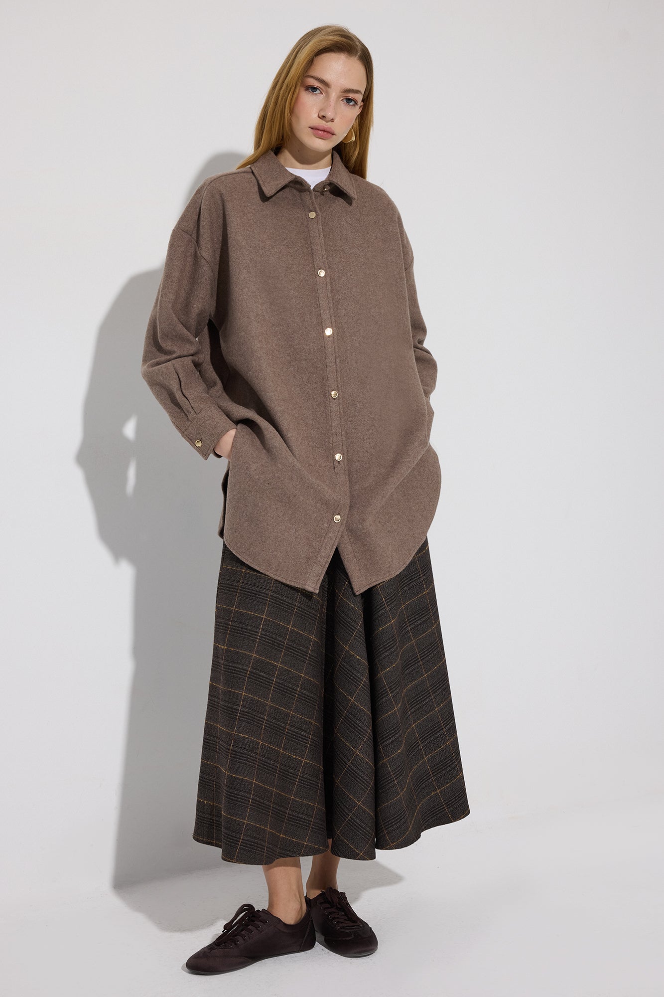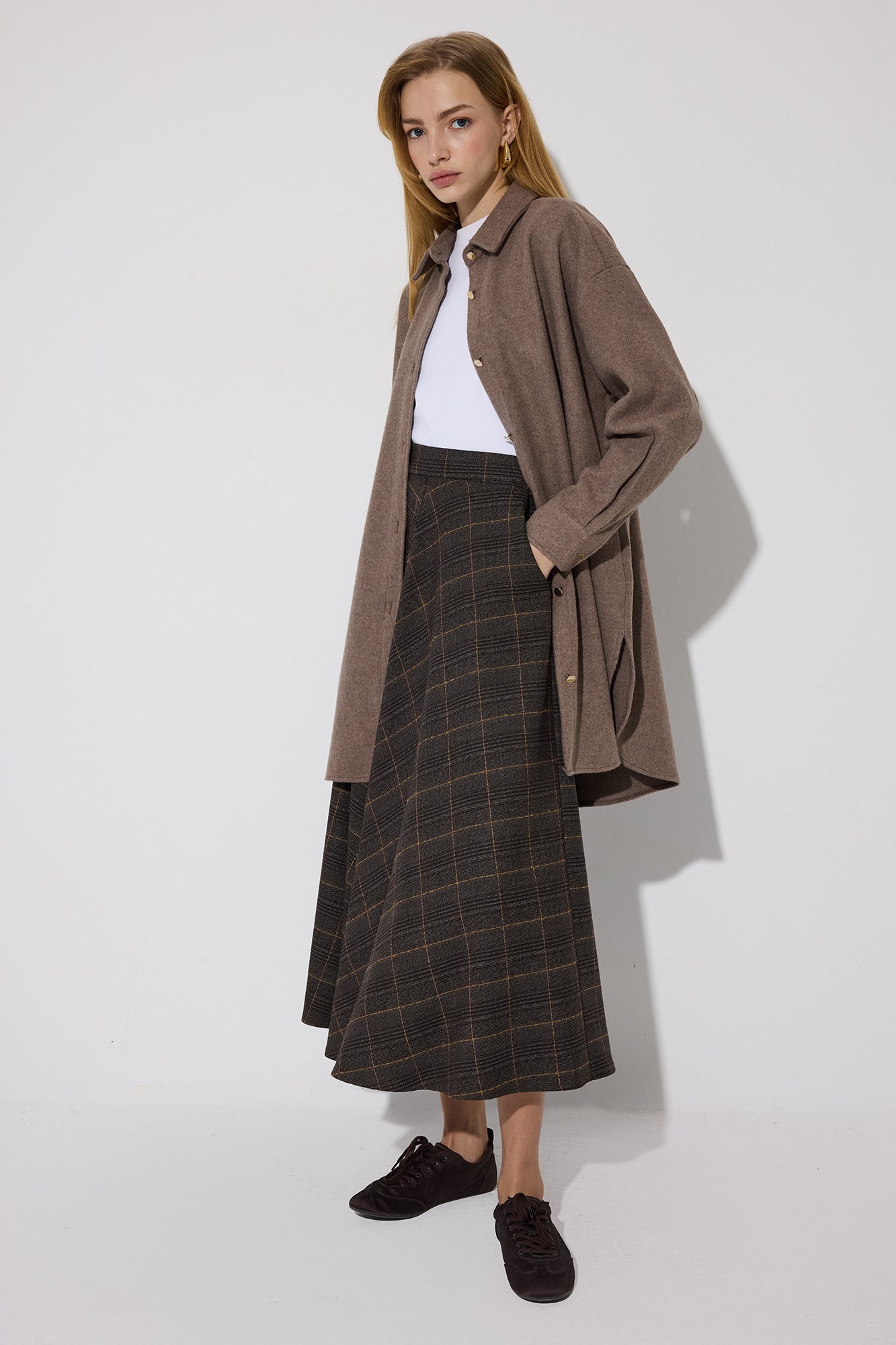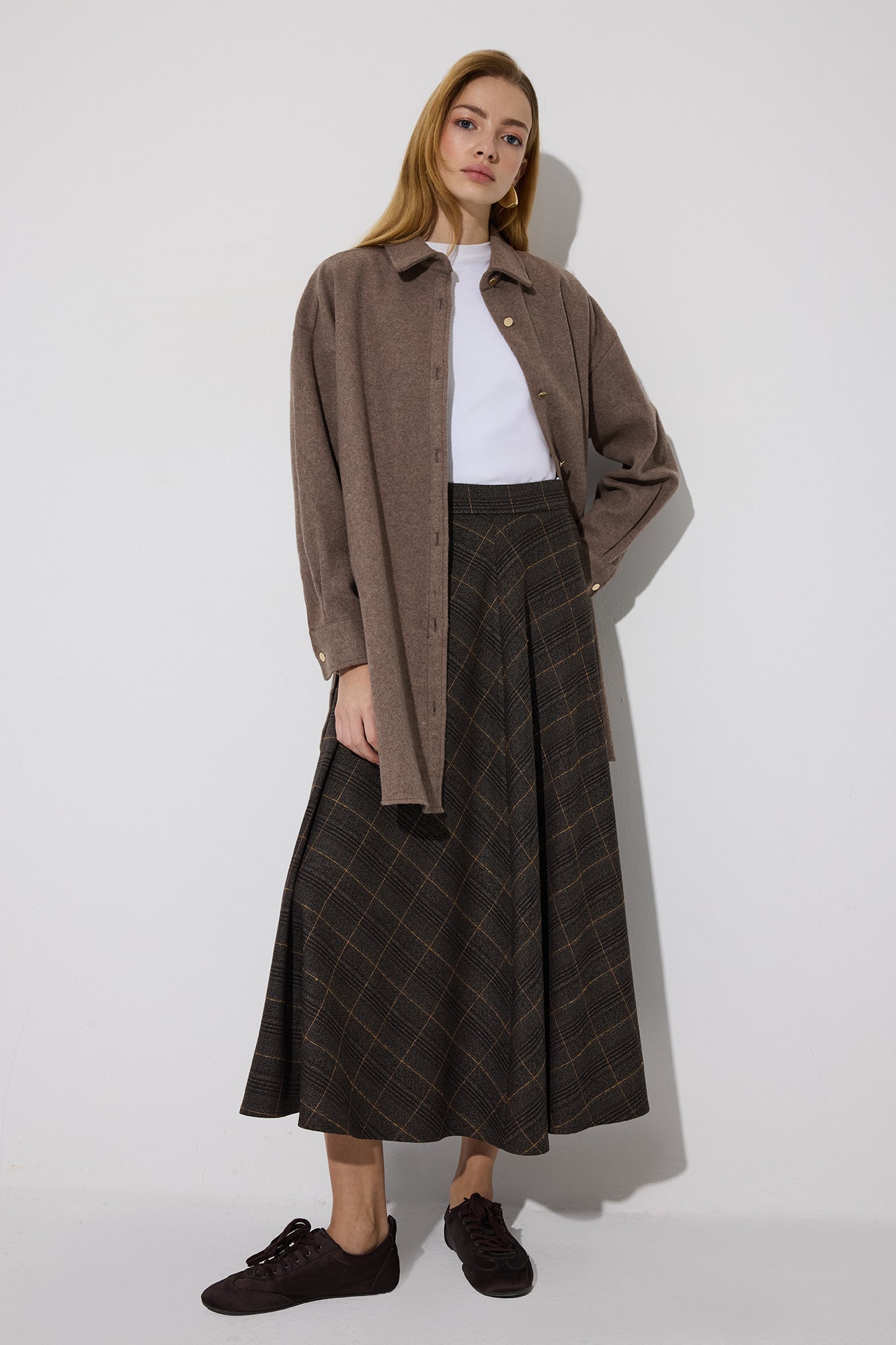 Ekose desenli. Yüksek bel. Cepli. Yan fermuar kapamalı. Midi boy.