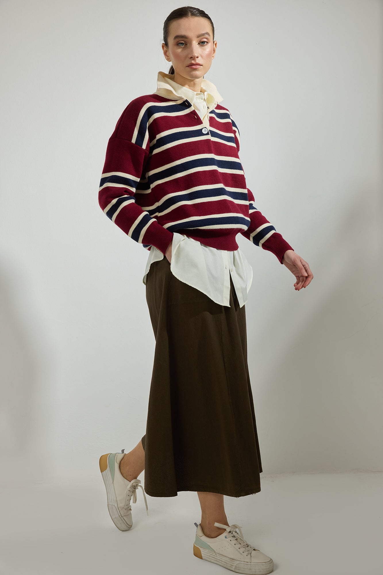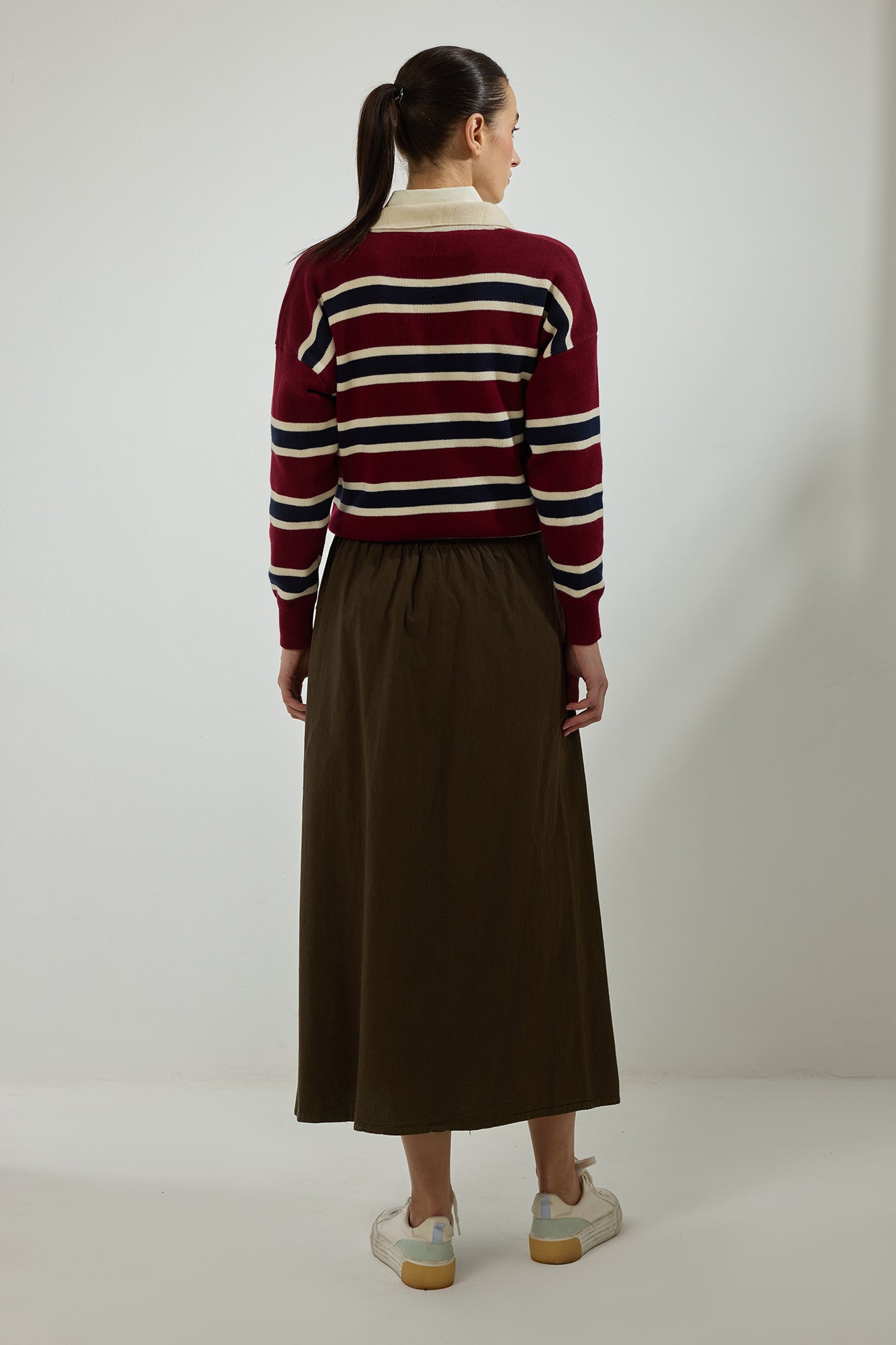 Yüksek bel. Bel kısmı lastikli. Cepli. Ayarlanabilir bağcık detaylı. Midi boy.