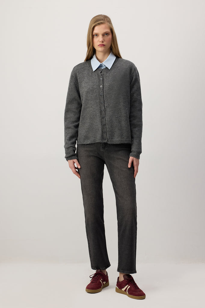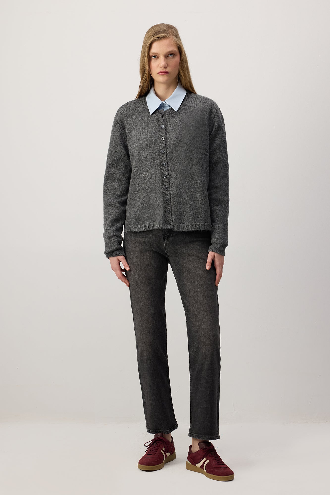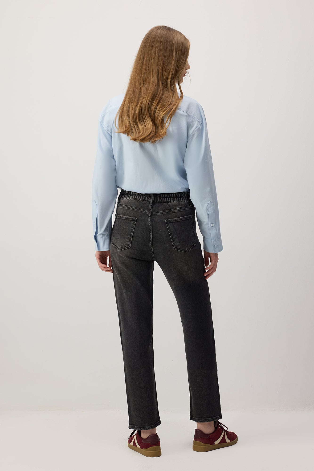 Arka beli lastikli denim pantolon. Düz kesim. Beş cepli.