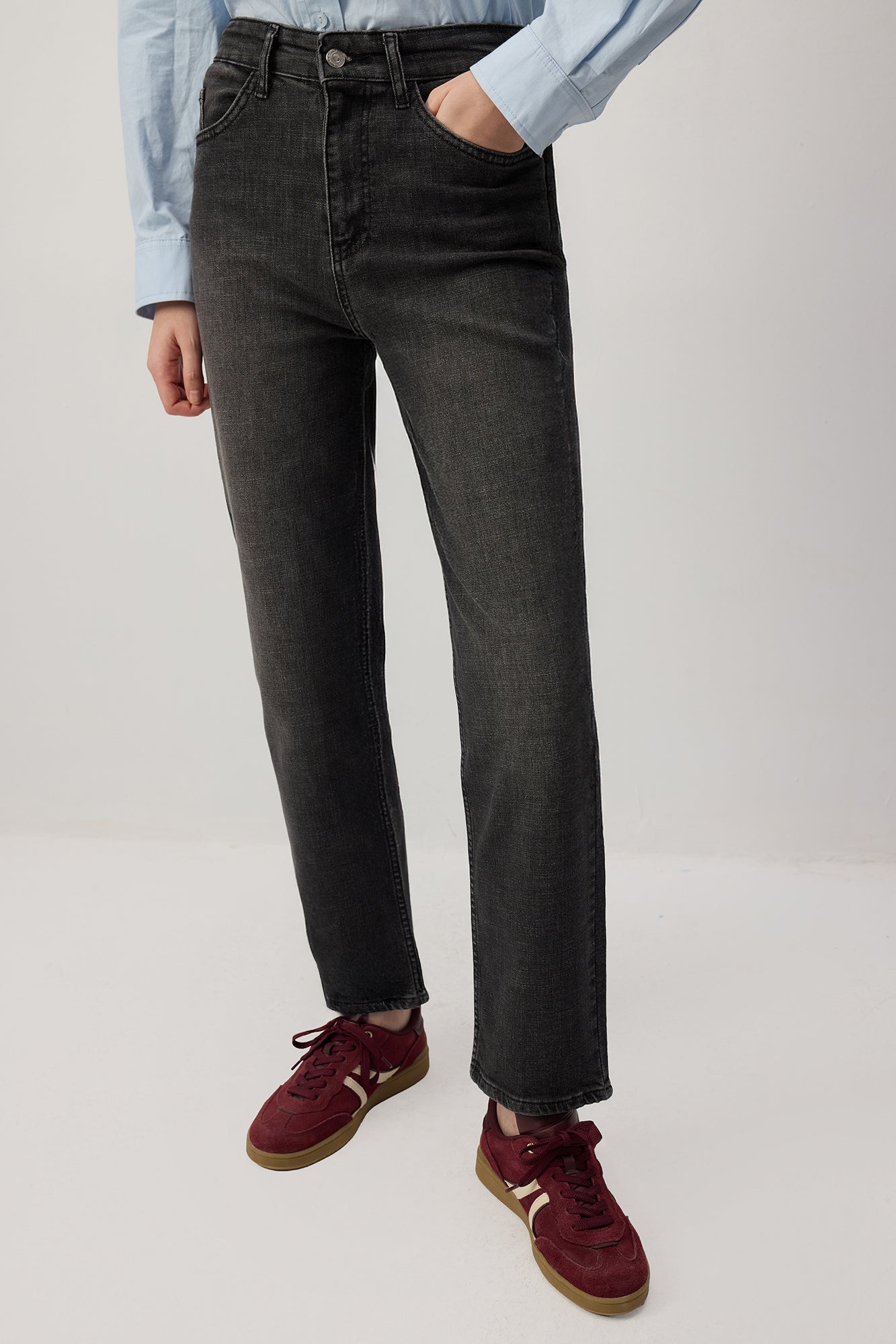 Arka beli lastikli denim pantolon. Düz kesim. Beş cepli.