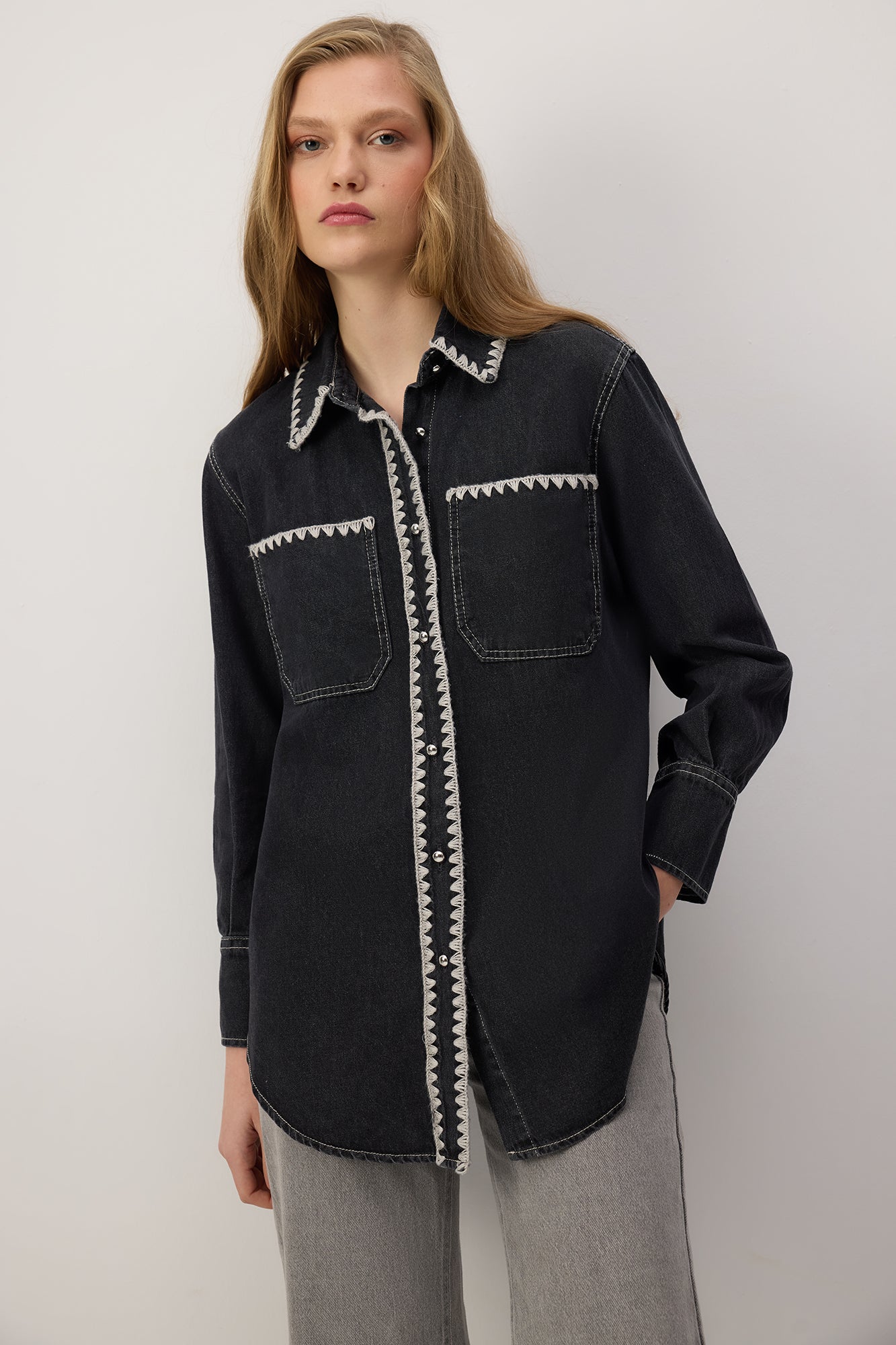 Nakış detaylı denim gömlek. Düğme kapamalı. Cepli tasarım.