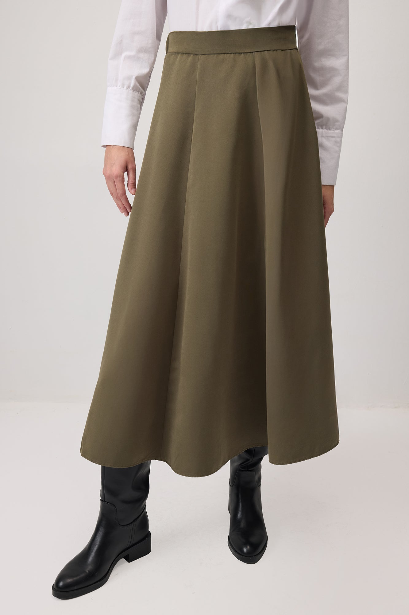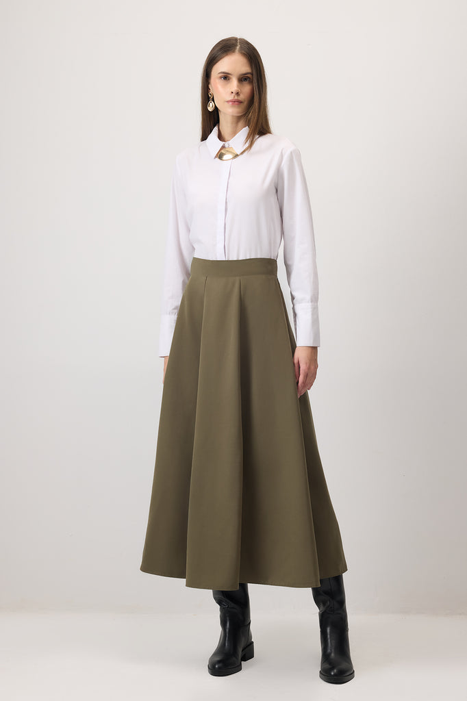 Parçalı kesimiyle akıcı bir siluet oluşturan bu etek, sade tasarımıyla modern bir çizgi sunar. Orta boy uzunluğu günlük kullanımda rahatlık sağlarken, hafif dökümlü yapısı hareketli bir görünüm kazandırır. Çizme, sneaker ya da düz ayakkabılarla kolayca kombinlenerek hem şehir hayatında hem ofis stilinde zamansız bir alternatif sunar.