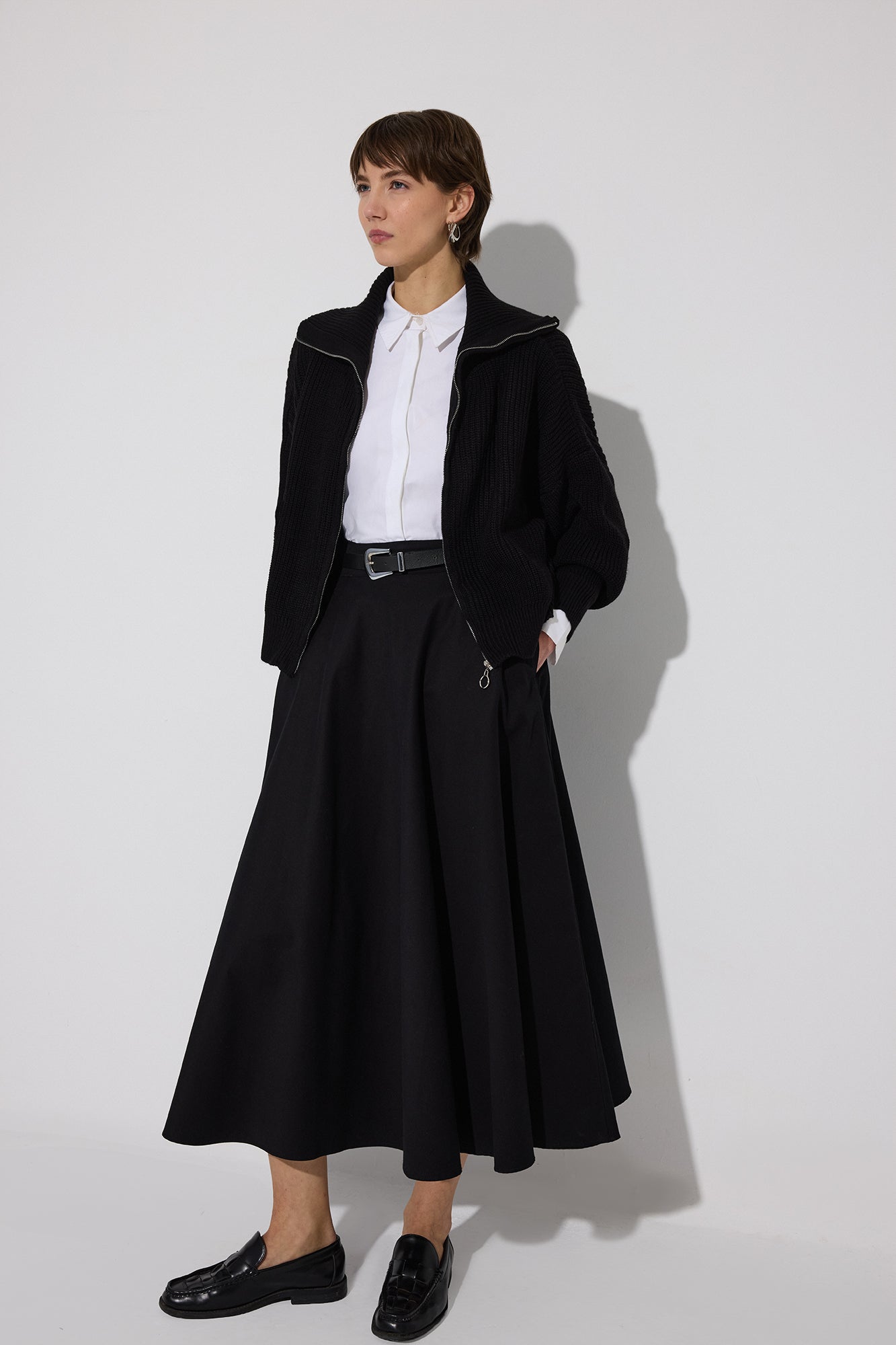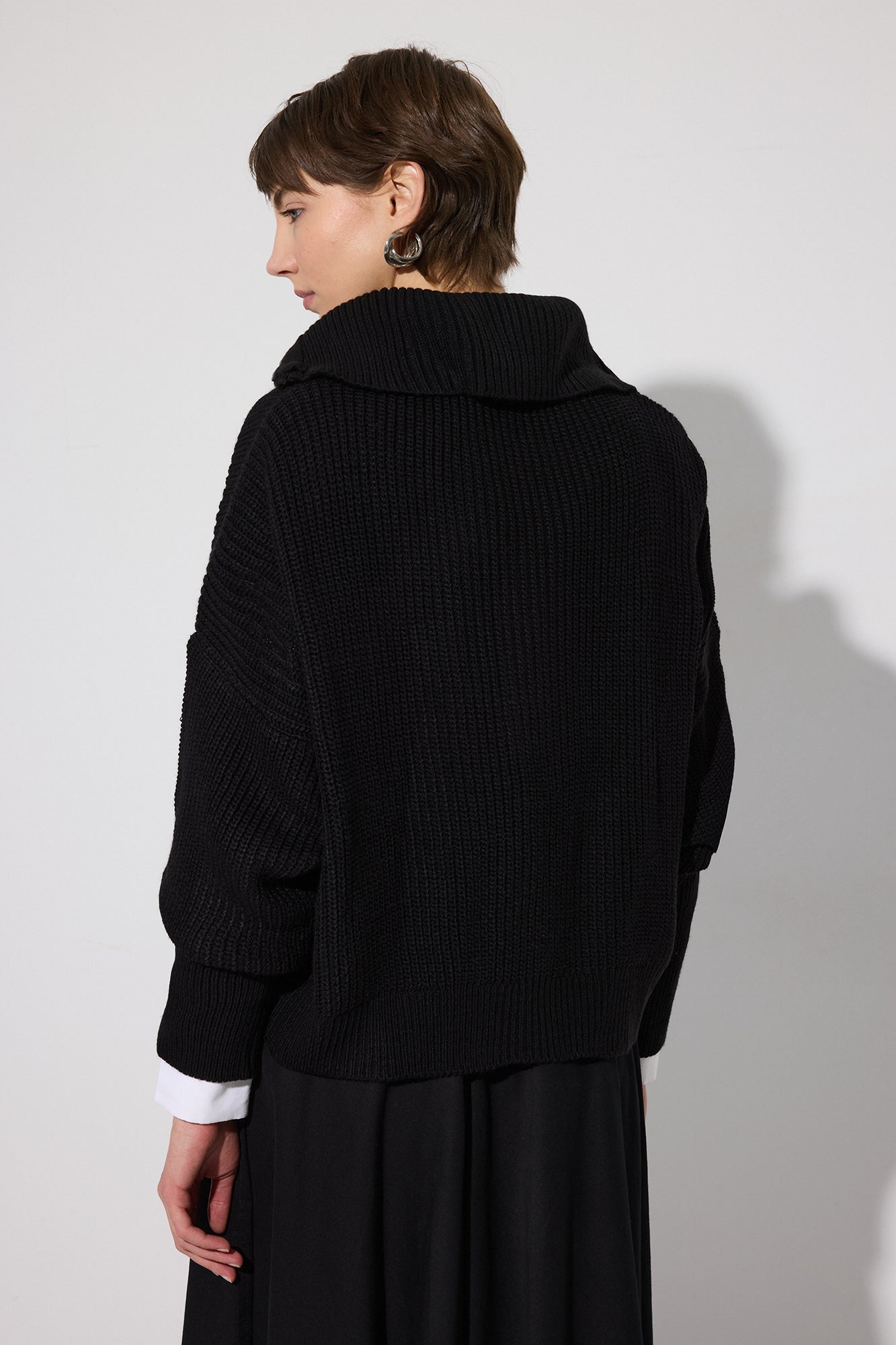 Önü fermuar kapamalı. Uzun kollu. Balıkçı yaka. Triko.