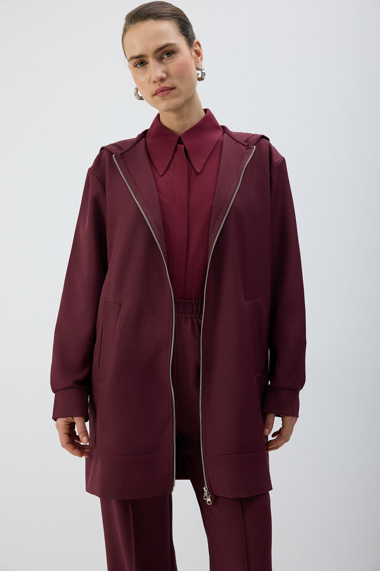Akan ve kırışmayan kumaş, kapüşonlu, fermuarlı uzun ceket.