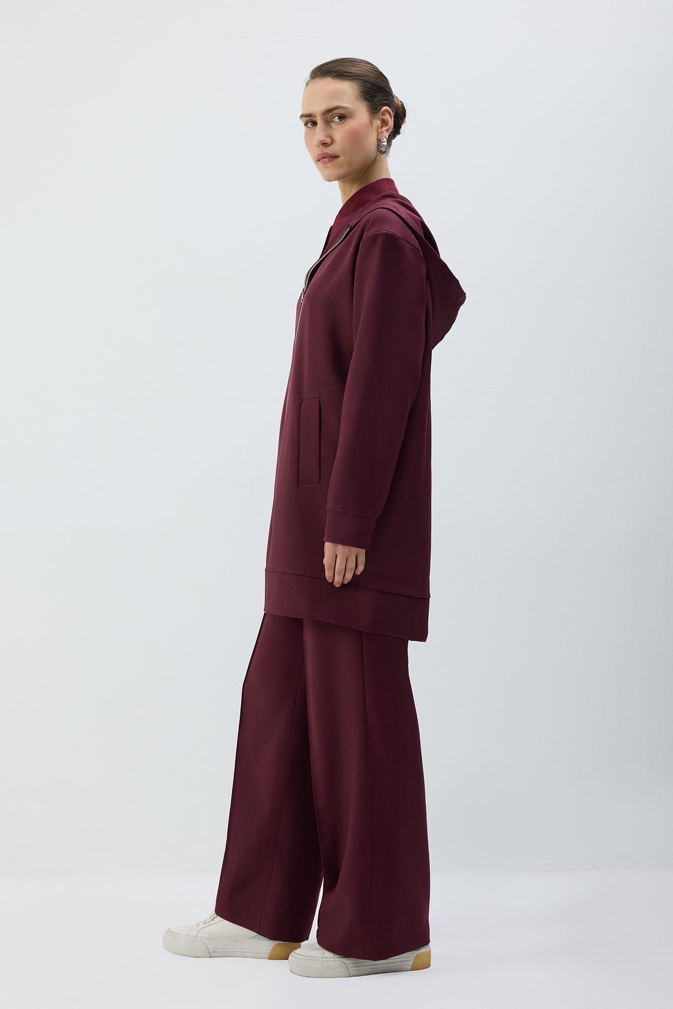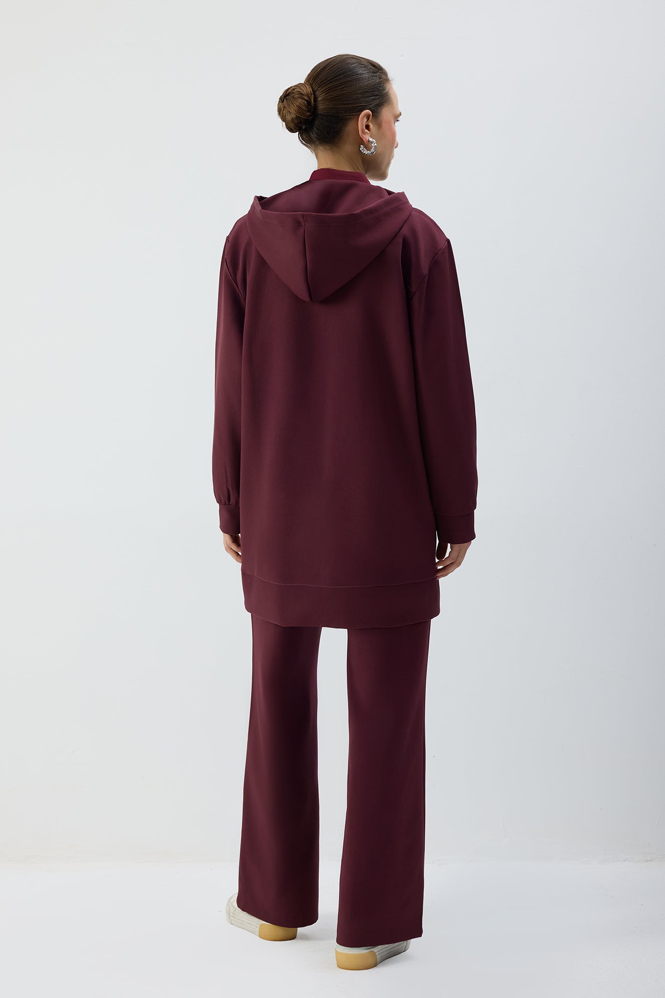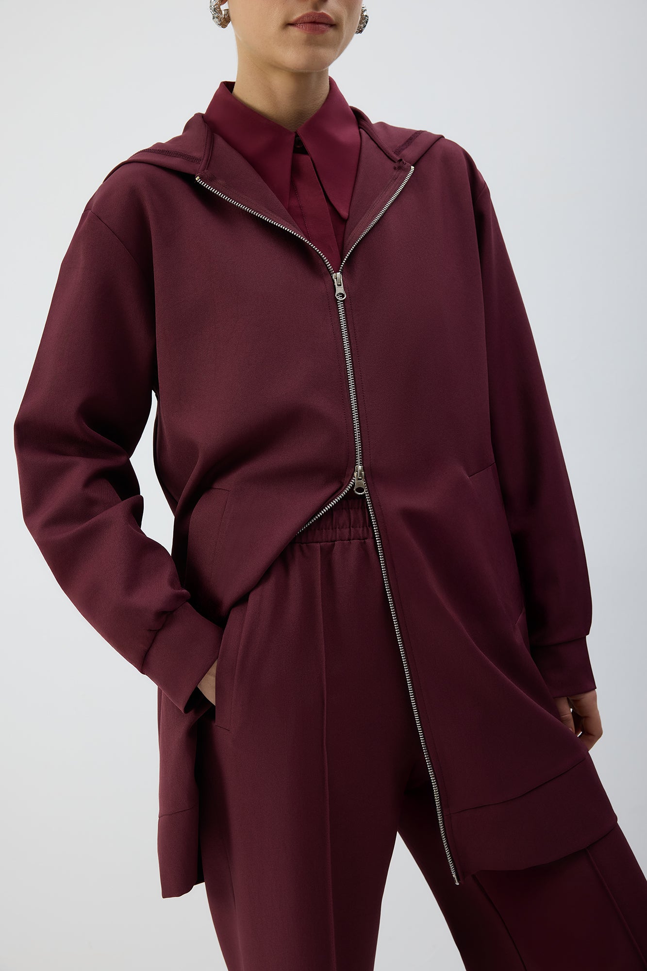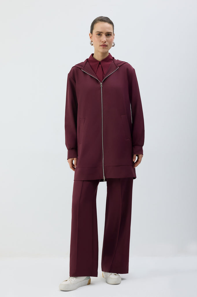 Akan ve kırışmayan kumaş, kapüşonlu, fermuarlı uzun ceket.