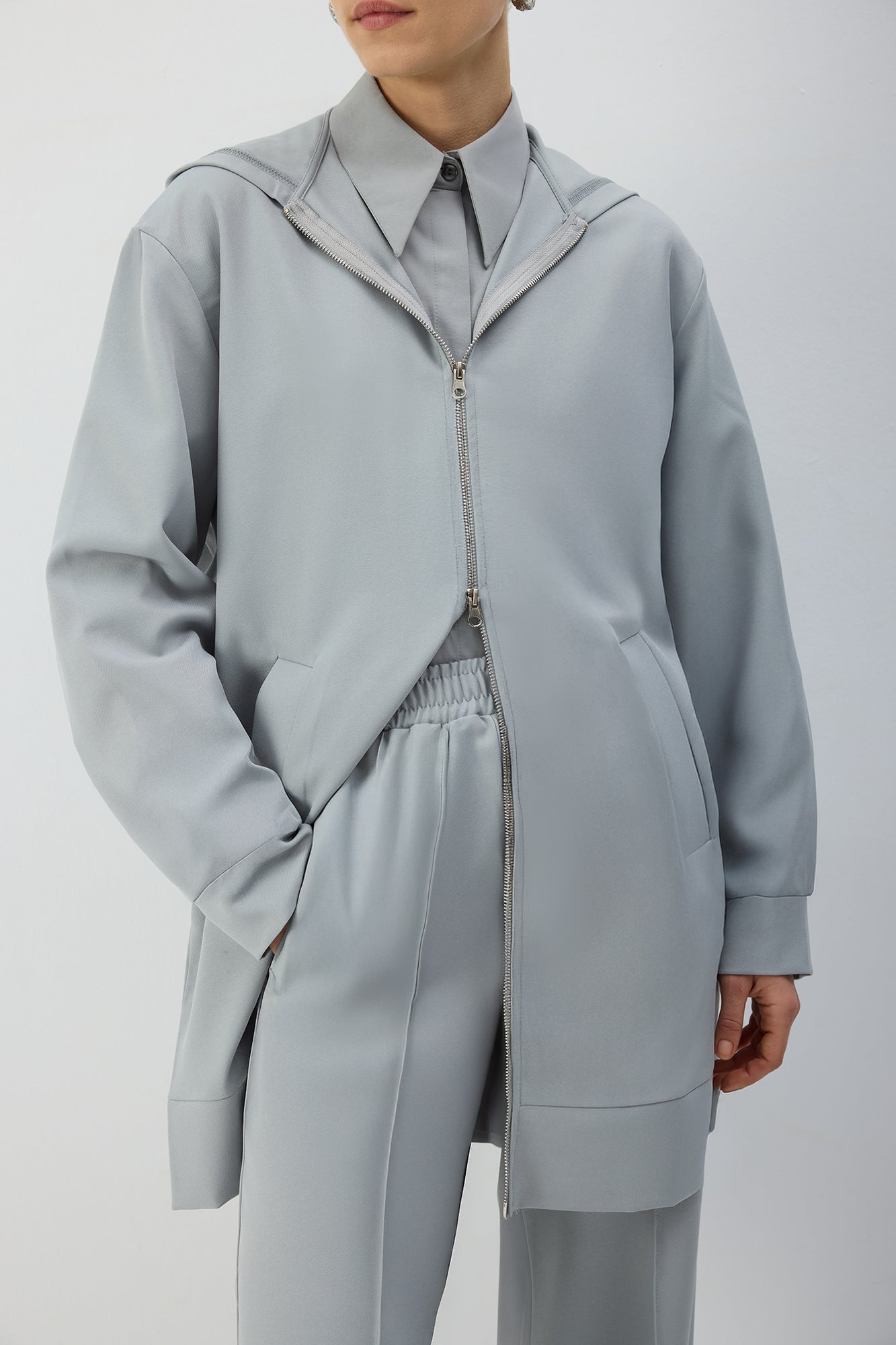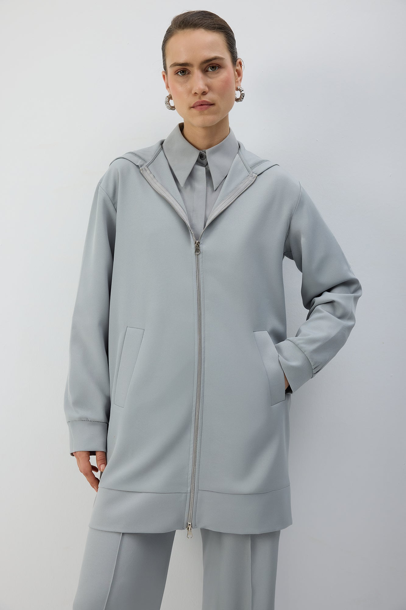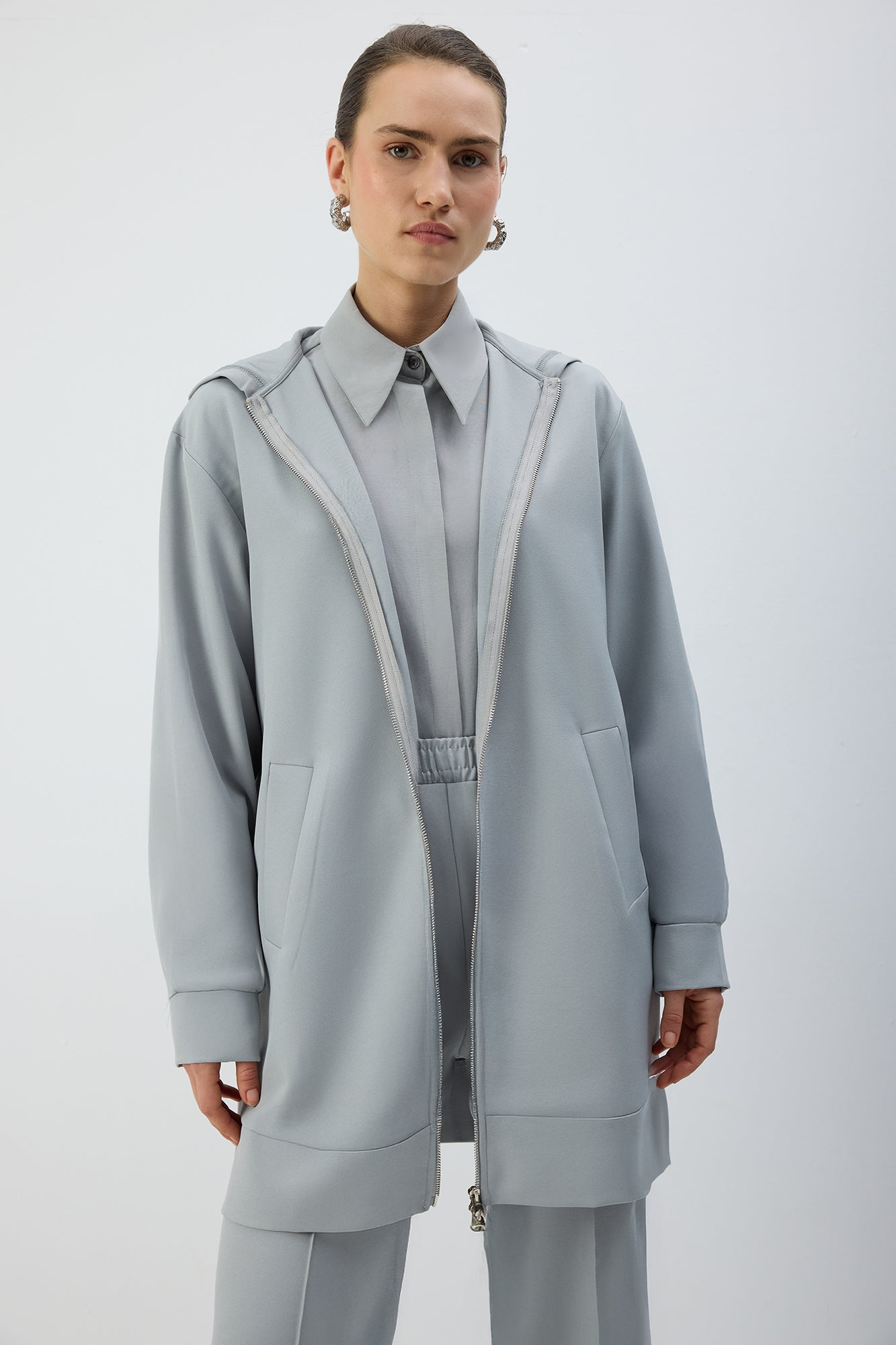 Akan ve kırışmayan kumaş, kapüşonlu, fermuarlı uzun ceket.