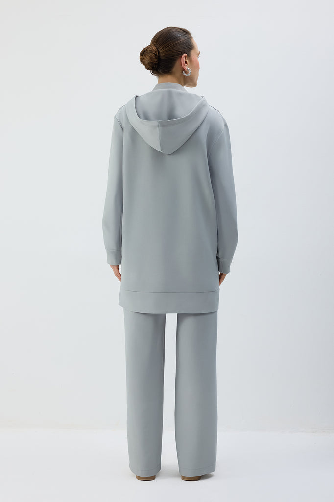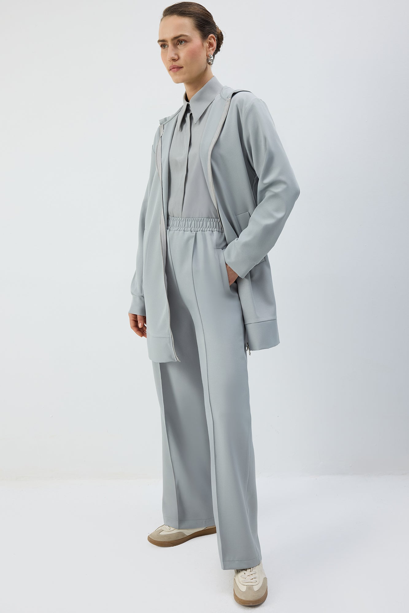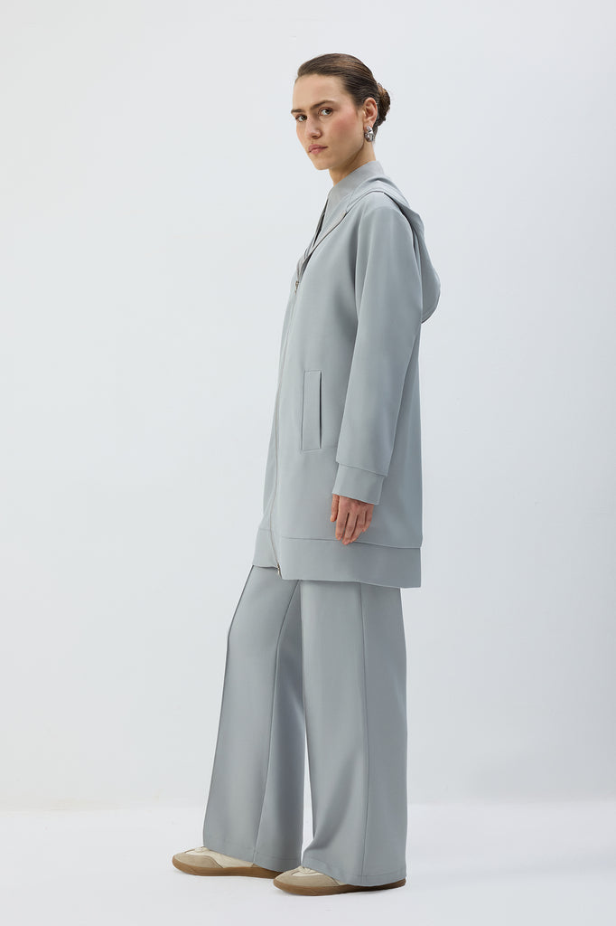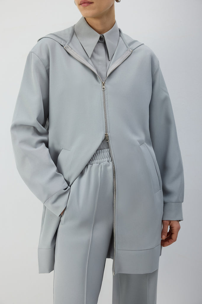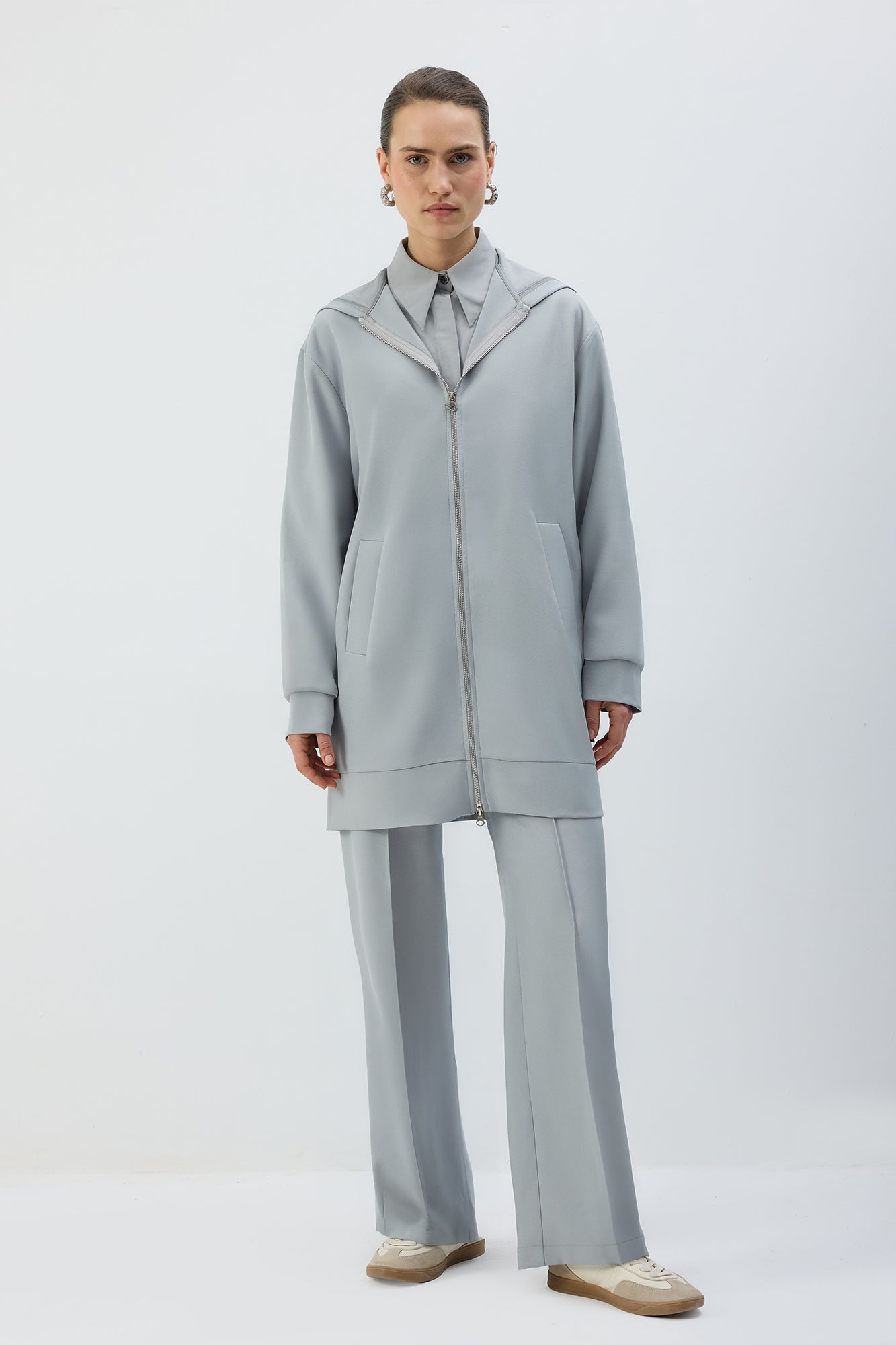 Akan ve kırışmayan kumaş, kapüşonlu, fermuarlı uzun ceket.