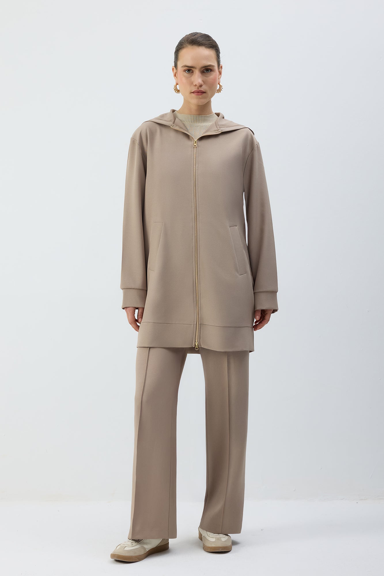 Akan ve kırışmayan kumaş, kapüşonlu, fermuarlı uzun ceket.