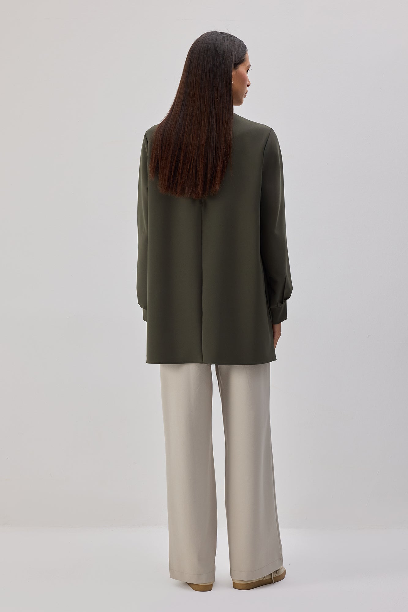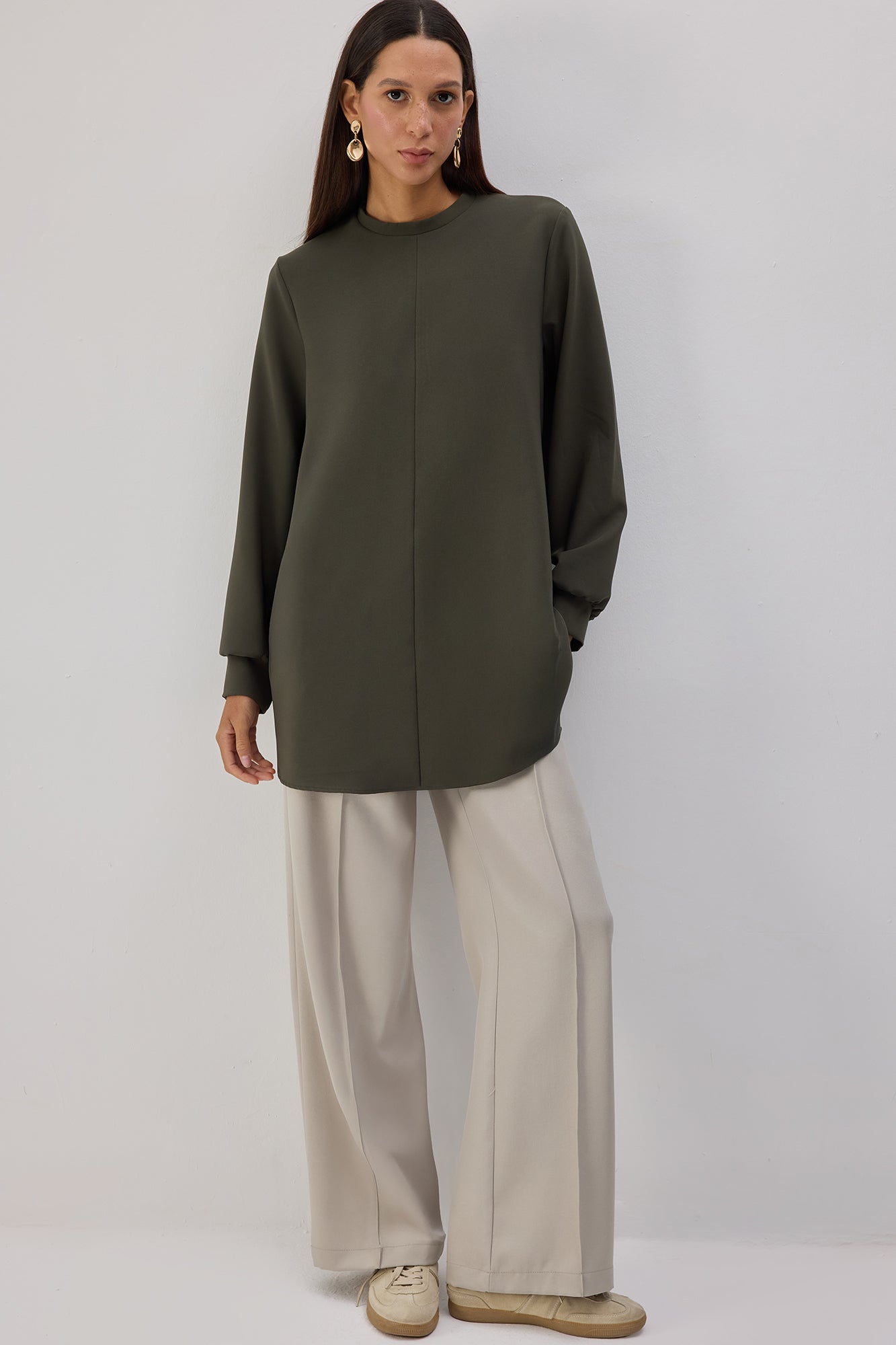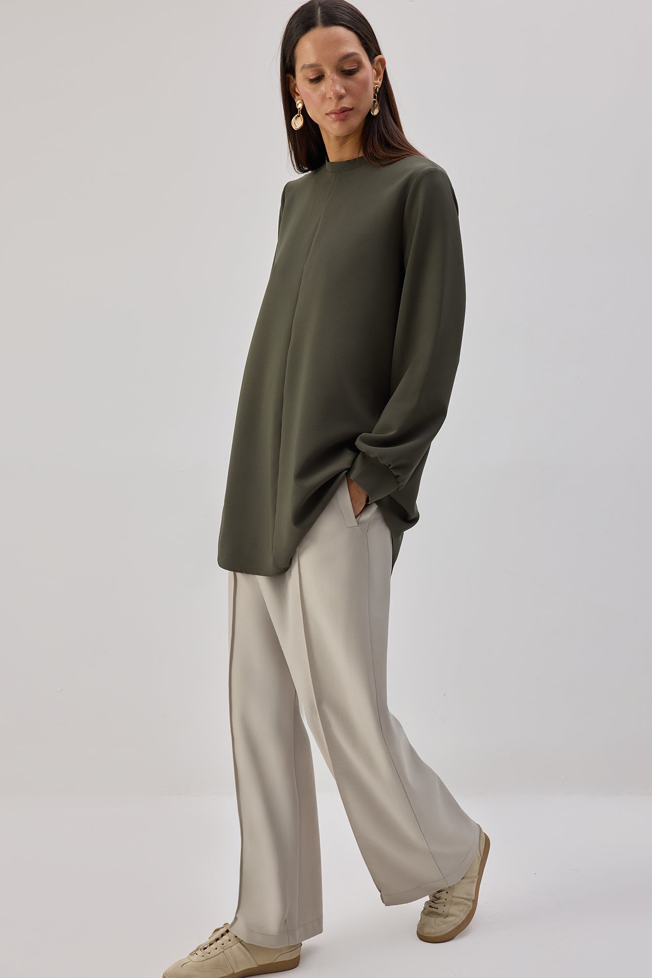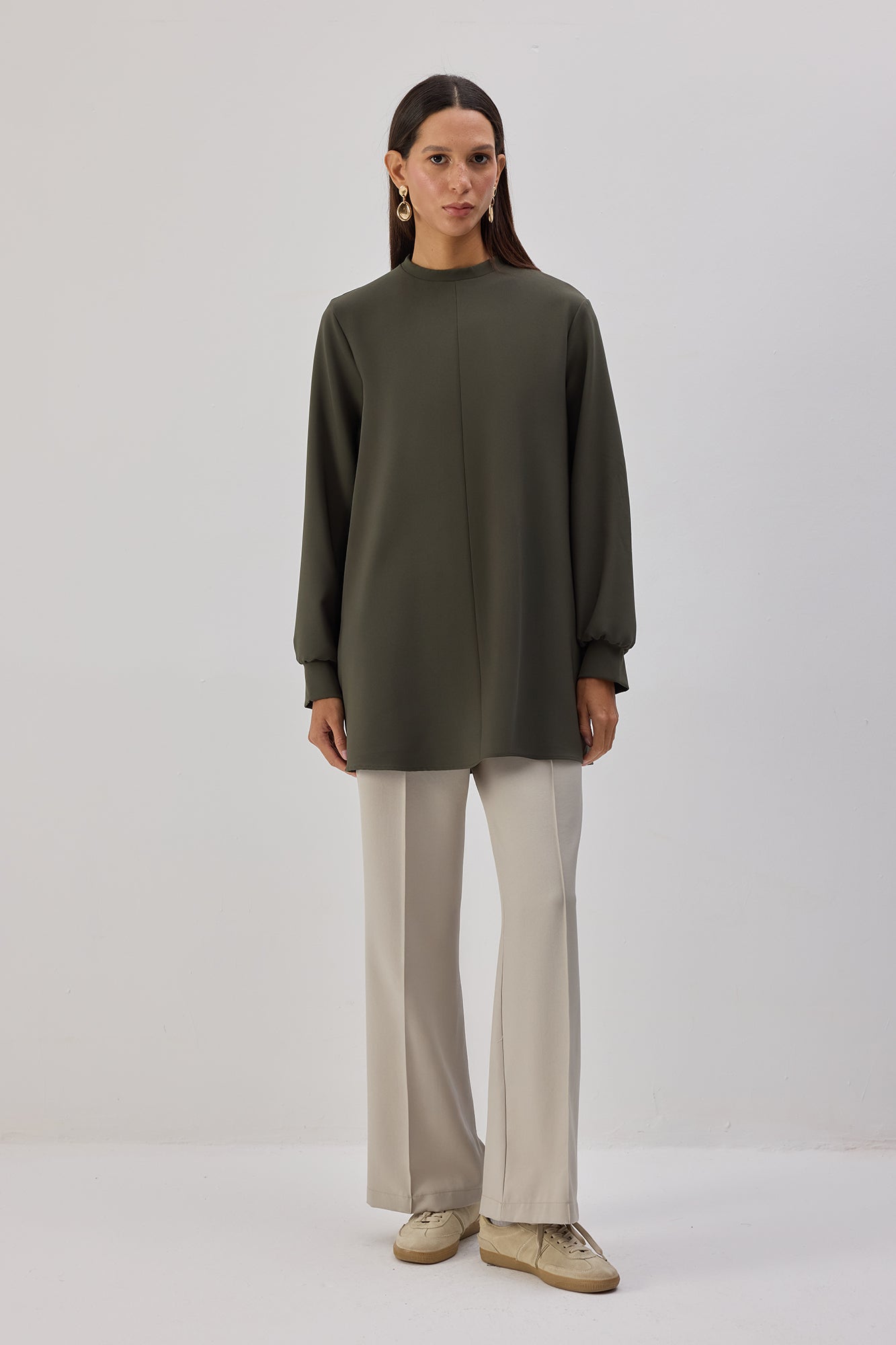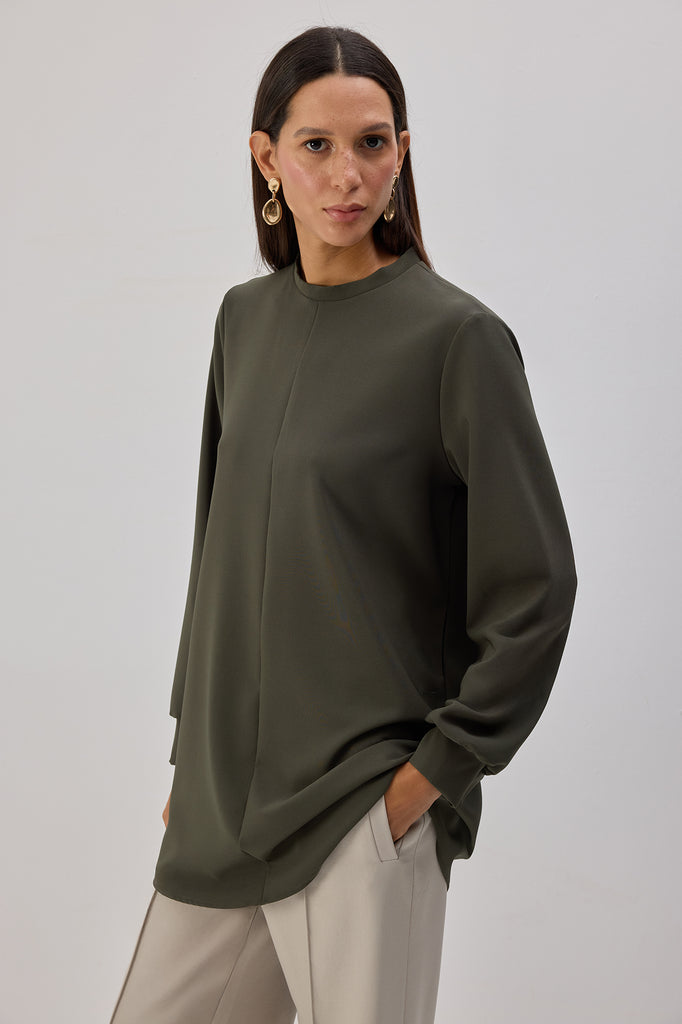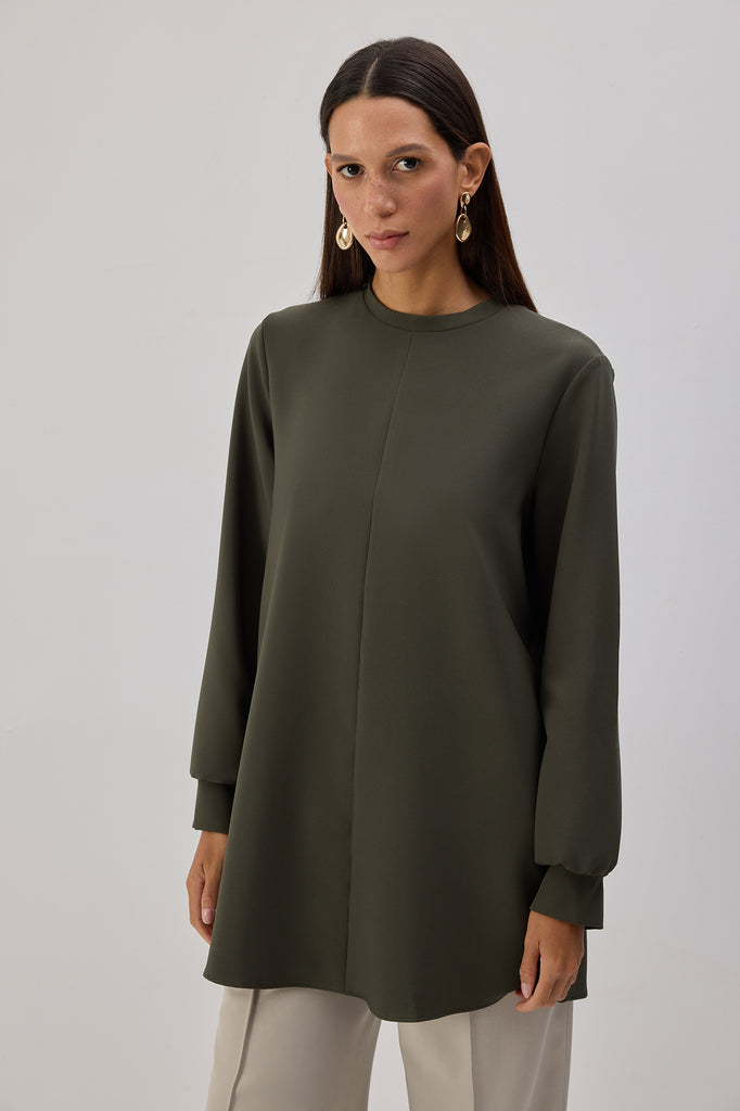 Bisiklet yaka. Uzun kollu. Arka fermuar kapamalı. Dökümlü. Krep tunik.
