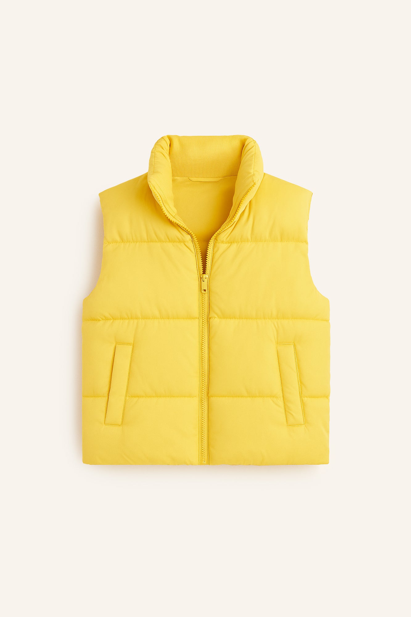 Dik yaka. Kolsuz. Kısa boy. Kapitone. Fermuar kapama.
