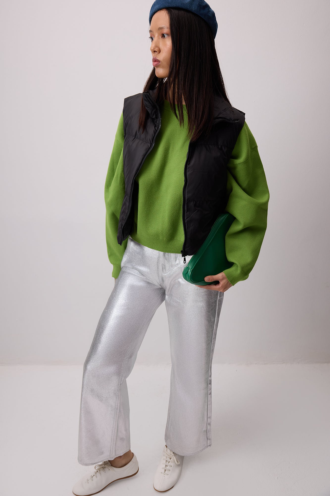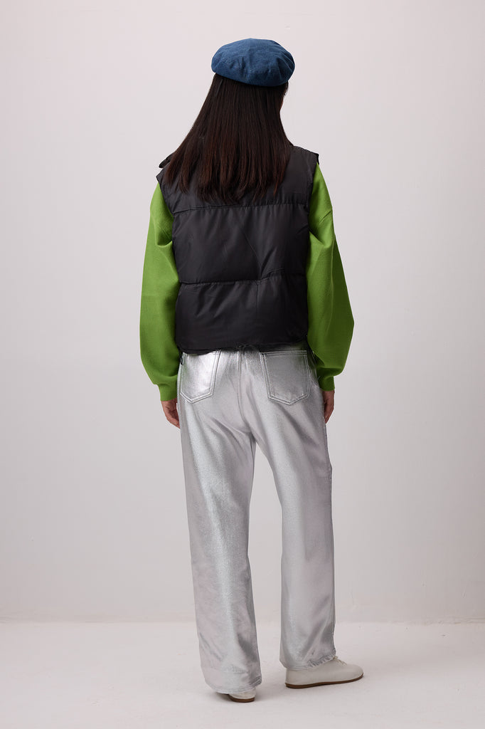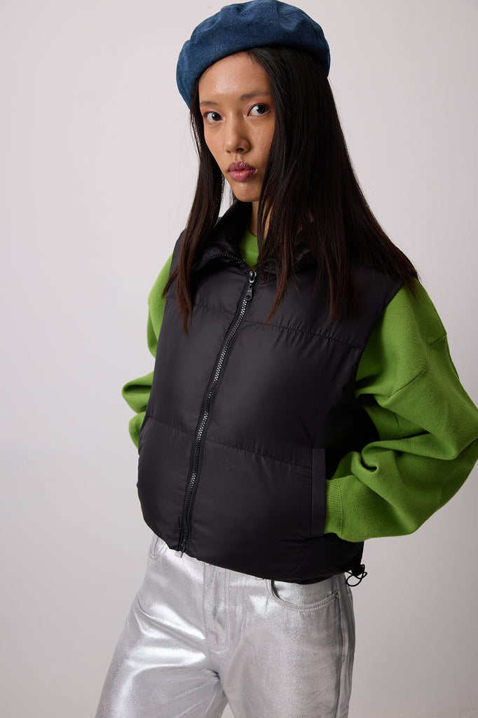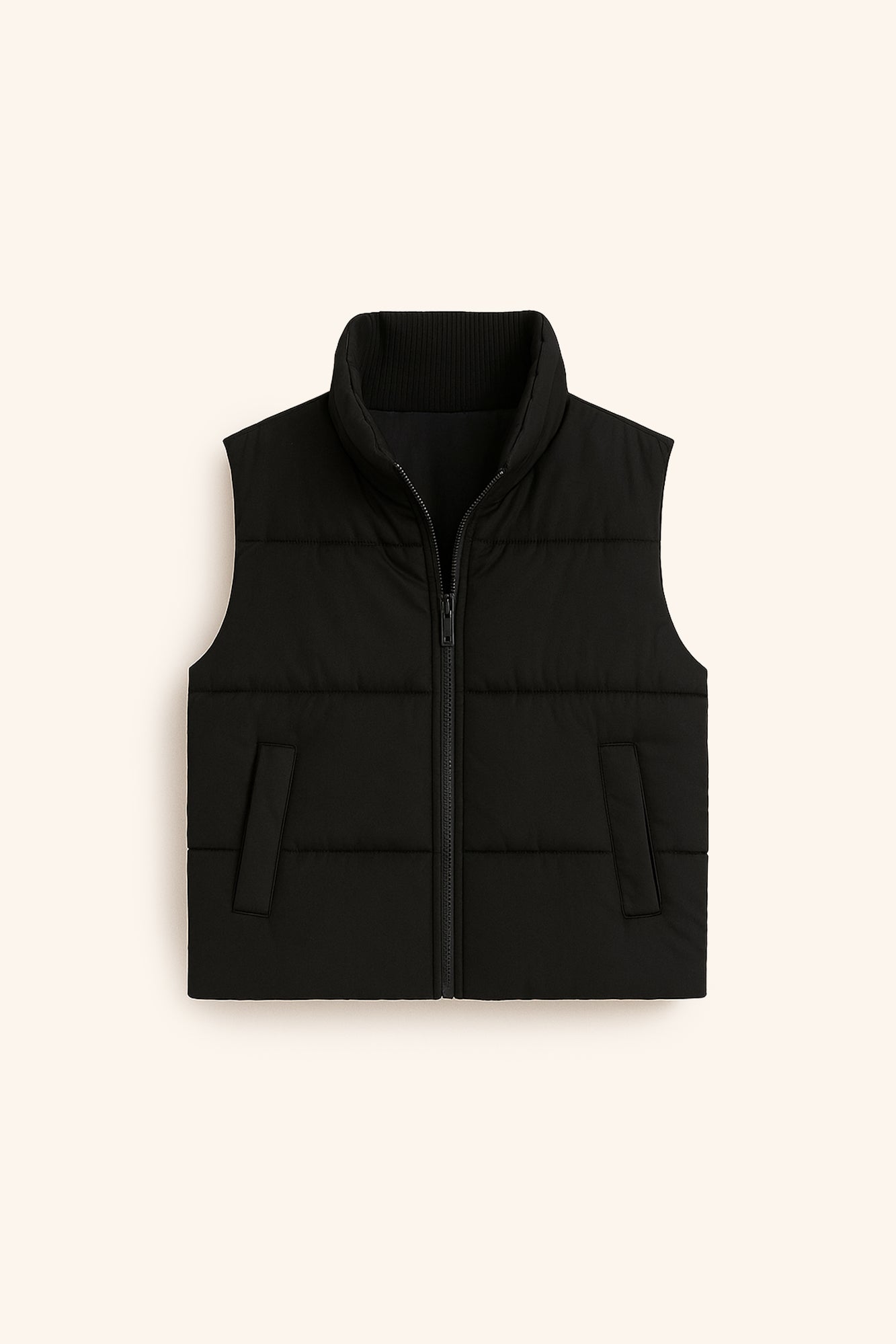 Dik yaka. Kolsuz. Kapitone. Önden fermuar kapama. Şişme yelek.