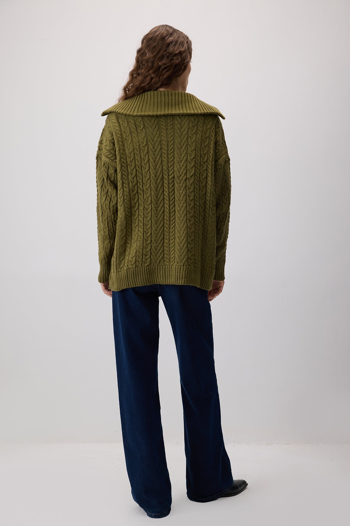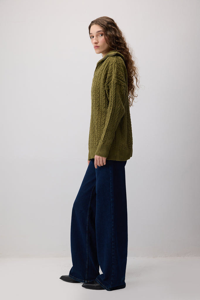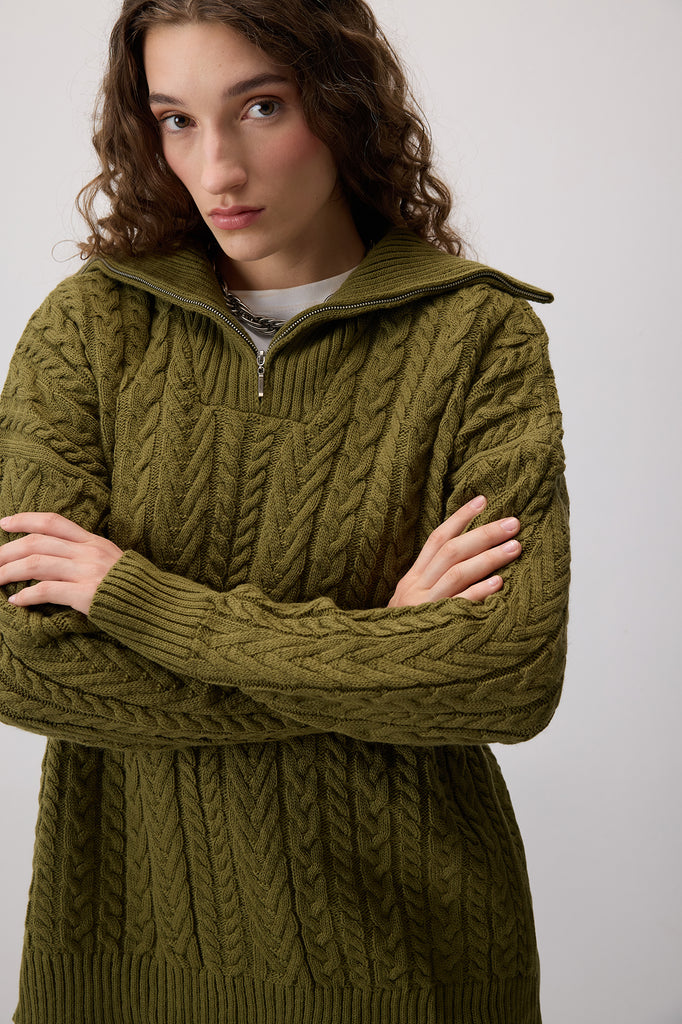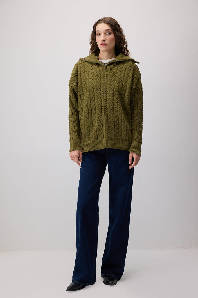 Klasik yaka. Fermuar kapama. Uzun kollu ve düşük omuzlu. Saç örgülü.