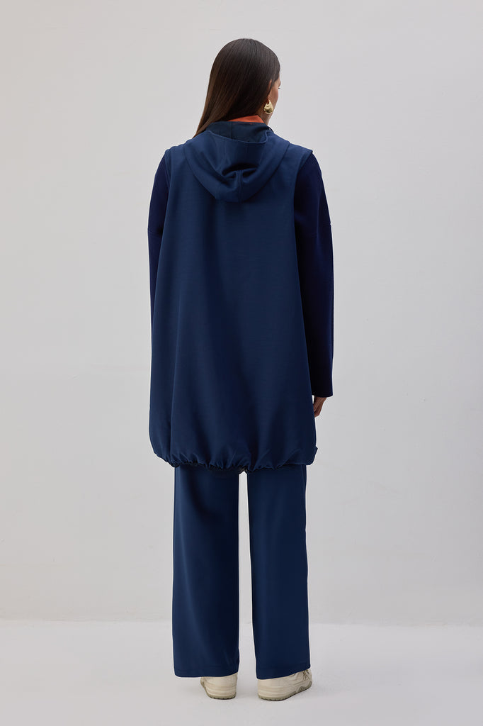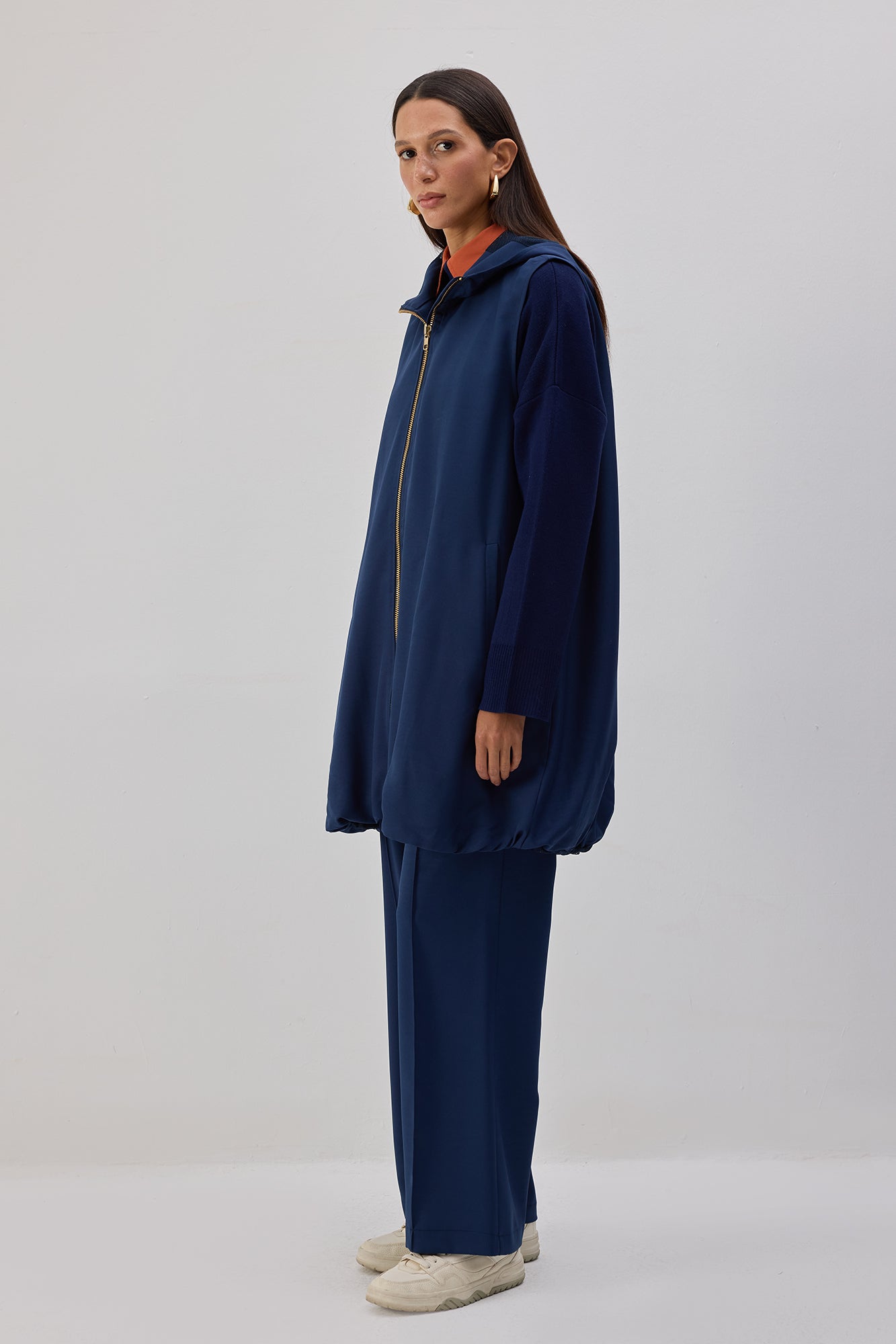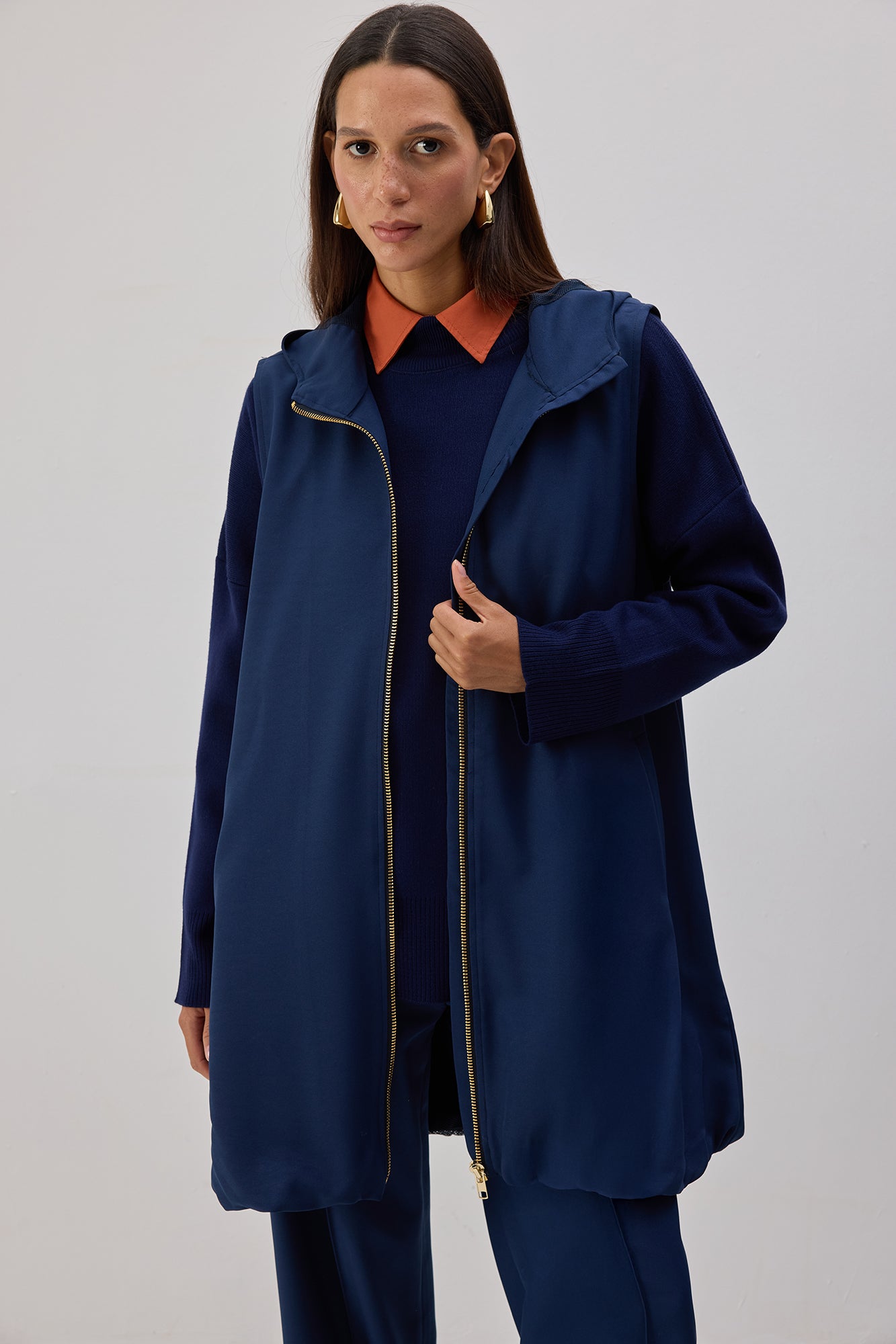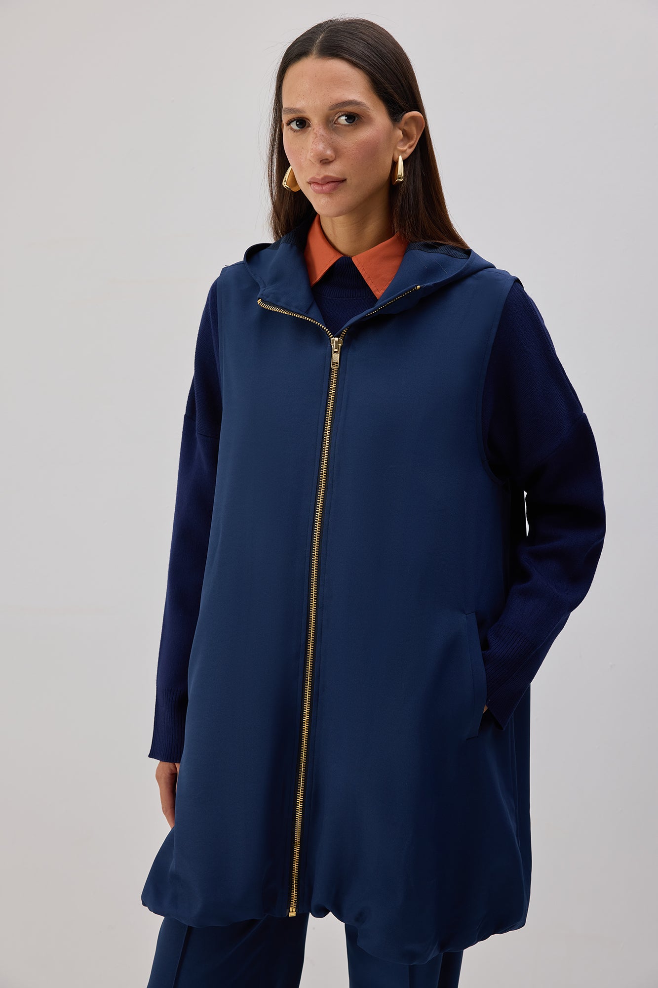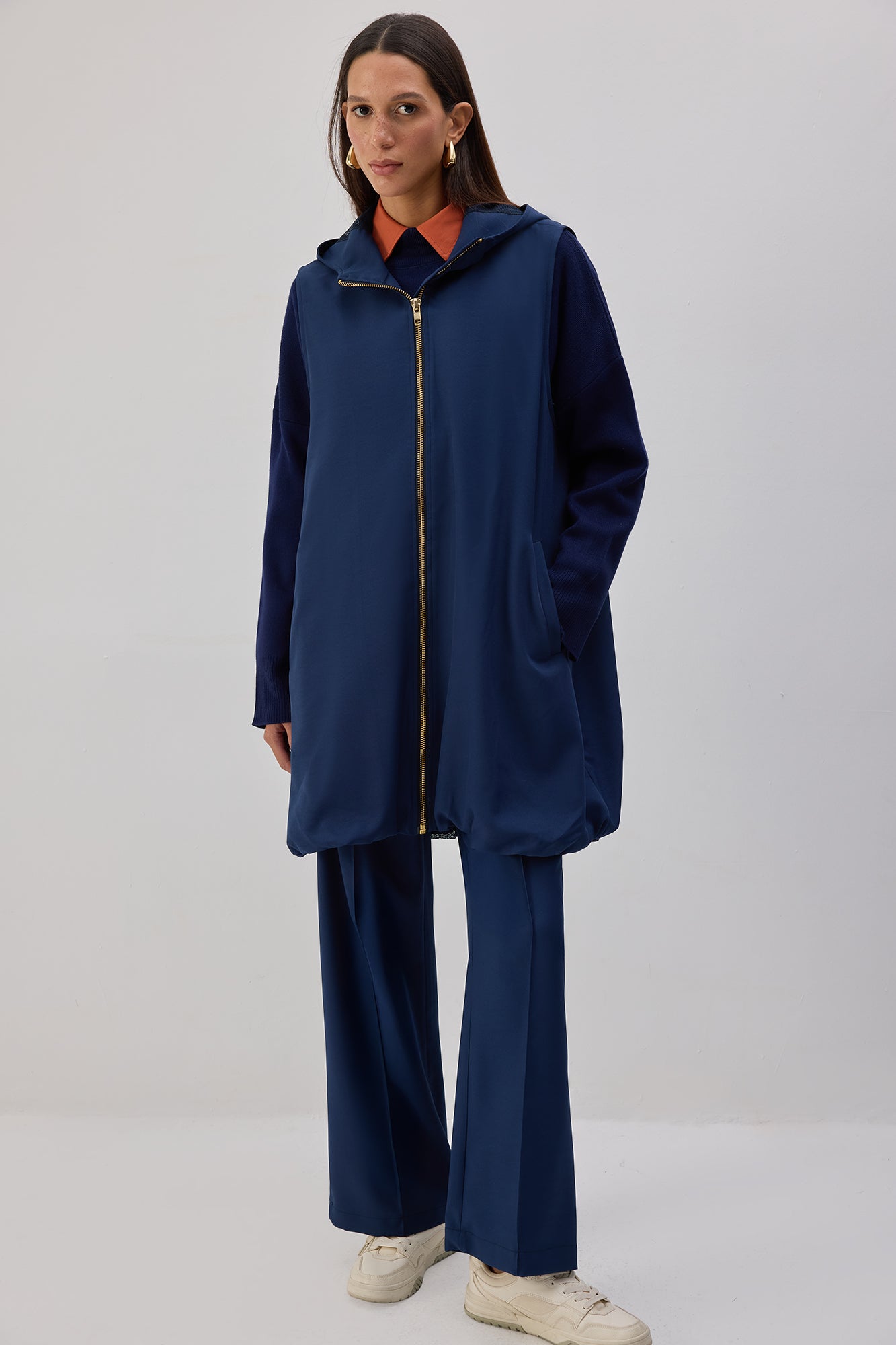 Kapüşonlu. Fermuar kapamalı. Cepli. Balon form etek ucu. Uzun yelek.