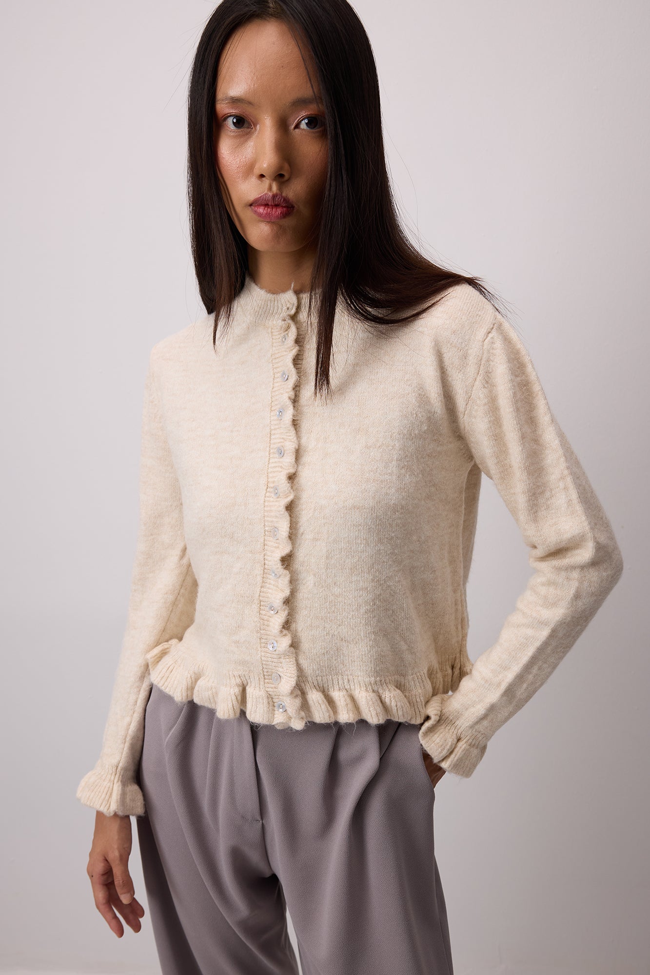 Yumuşak dokusu ve sıcak tonuyla öne çıkan bu triko hırka, merkezde ve etek ucunda yer alan fırfır detaylarıyla klasik hırka görünümüne modern bir dokunuş katar. İnce düğmeli kapaması ve rahatsız etmeyen hafif yapısı sayesinde hem iç hem dış katmanda rahatlıkla kullanılabilir. Rahat kalıbı günlük stile uyum sağlarken, etek ve pantolonlarla kolayca kombinlenebilir. Zamansız, sade ve detaylarla güçlendirilmiş bir triko arayanlar için ideal bir seçenek.