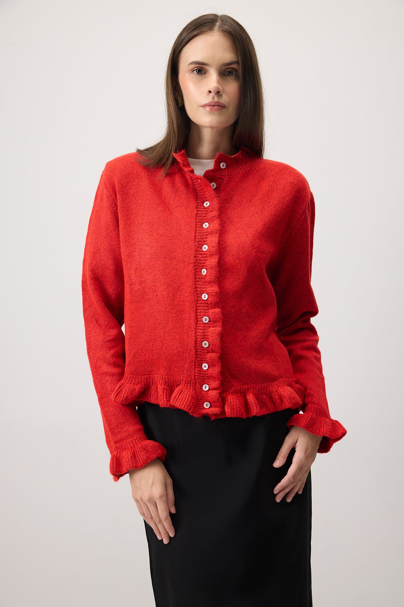 Önden düğmeli. Fırfırlı. Kısa triko hırka.