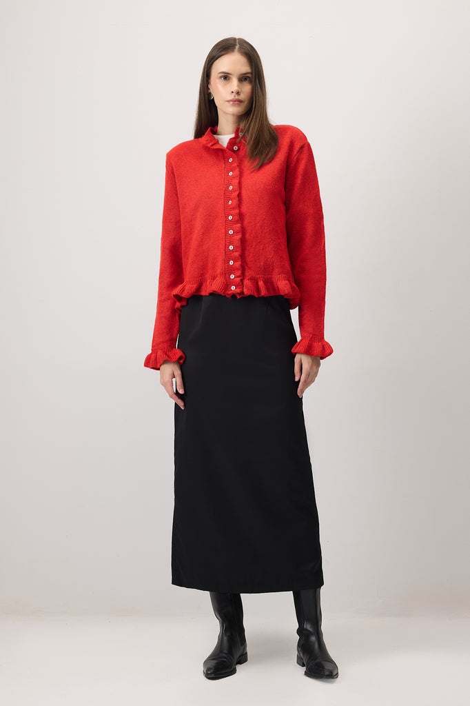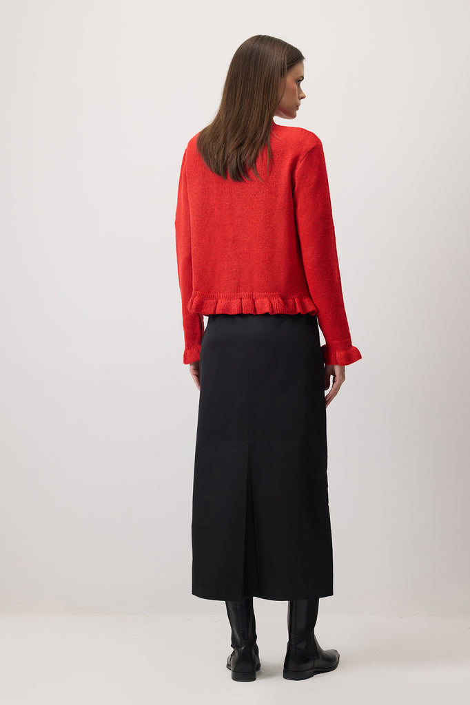 Önden düğmeli. Fırfırlı. Kısa triko hırka.