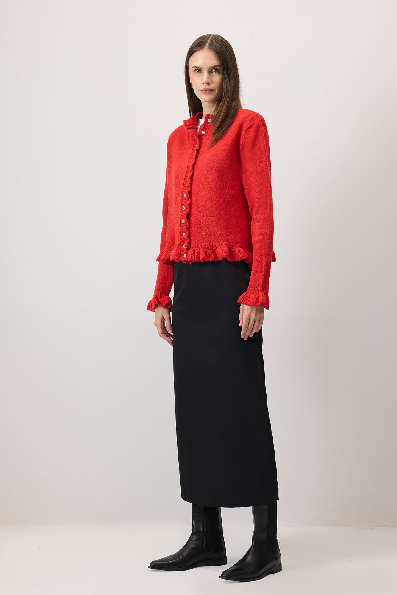 Yumuşak dokusu ve sıcak tonuyla öne çıkan bu triko hırka, merkezde ve etek ucunda yer alan fırfır detaylarıyla klasik hırka görünümüne modern bir dokunuş katar. İnce düğmeli kapaması ve rahatsız etmeyen hafif yapısı sayesinde hem iç hem dış katmanda rahatlıkla kullanılabilir. Rahat kalıbı günlük stile uyum sağlarken, etek ve pantolonlarla kolayca kombinlenebilir. Zamansız, sade ve detaylarla güçlendirilmiş bir triko arayanlar için ideal bir seçenek.