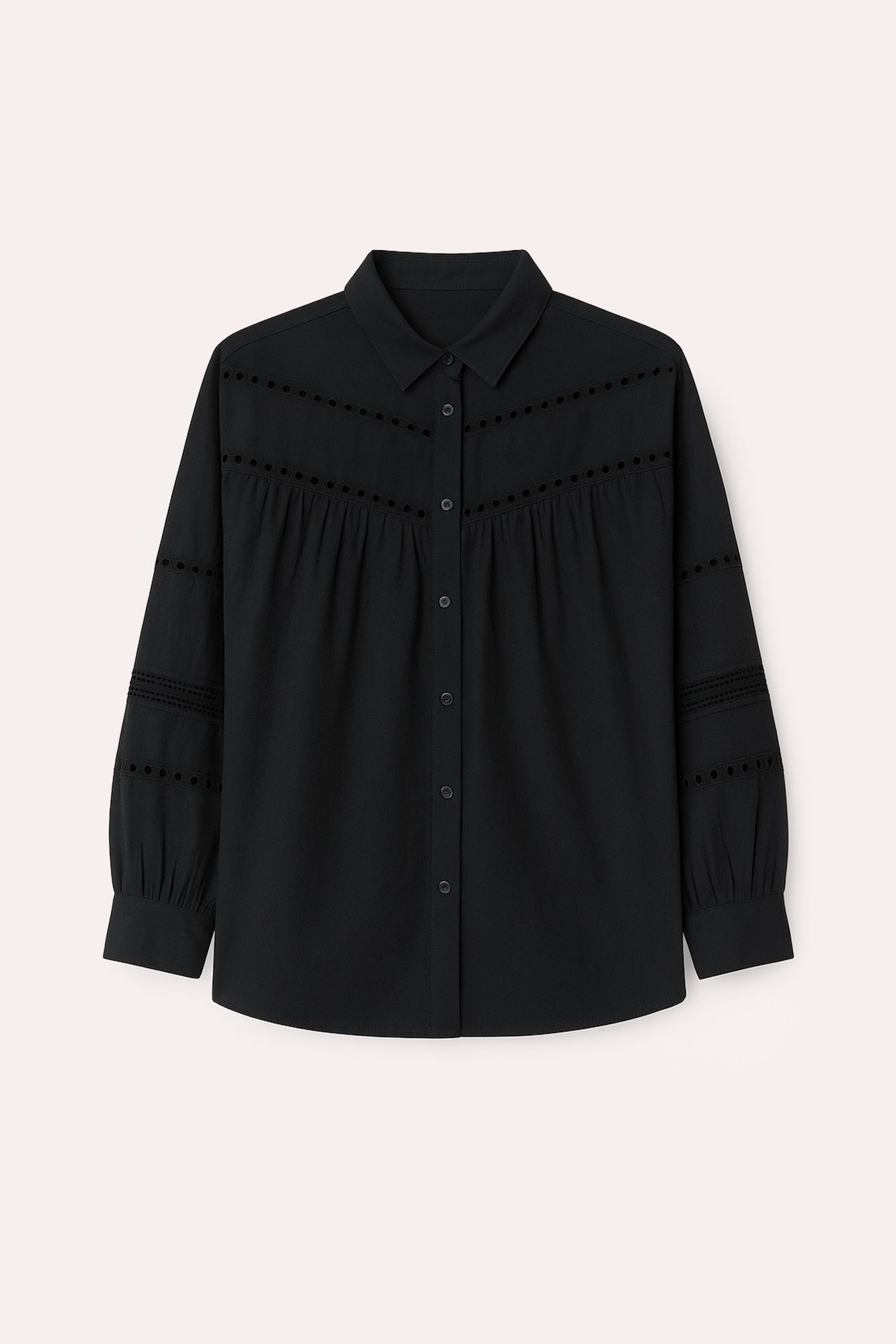 Klasik yaka. Uzun kollu ve manşetleri düğme kapamalı. Ajur işlemeli. Önden düğme kapamalı.