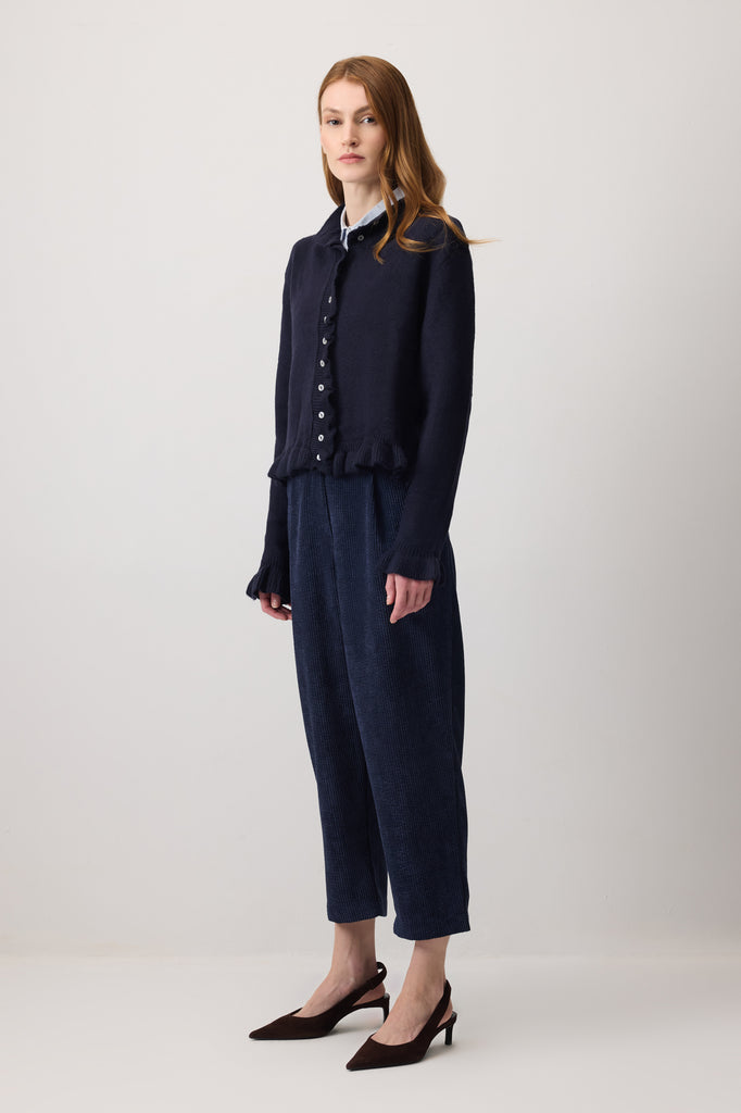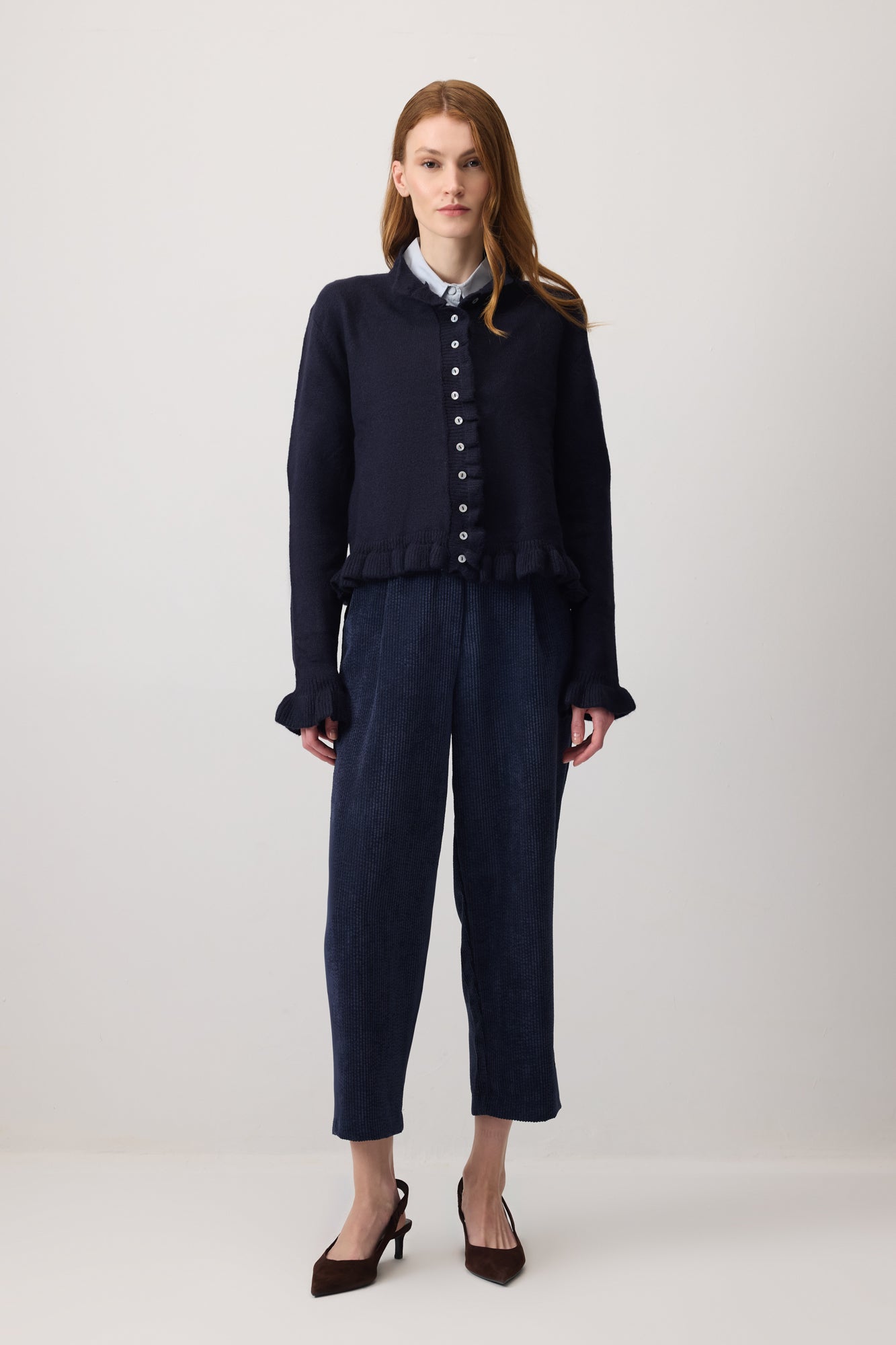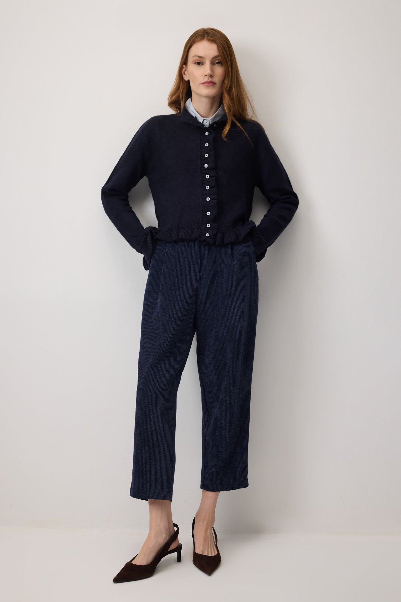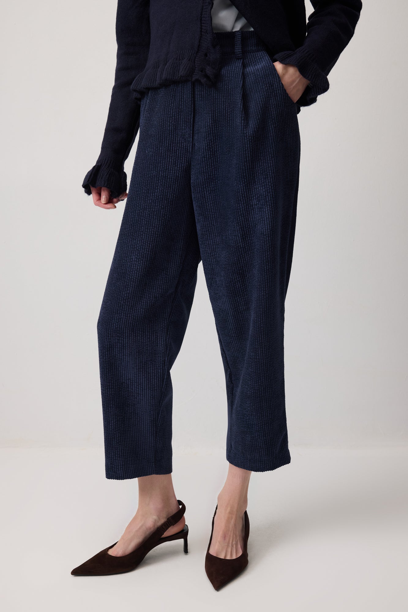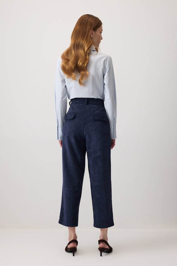 Kadife dokulu, rahat kesim pantolon. Yüksek bel. Pens detaylı.
